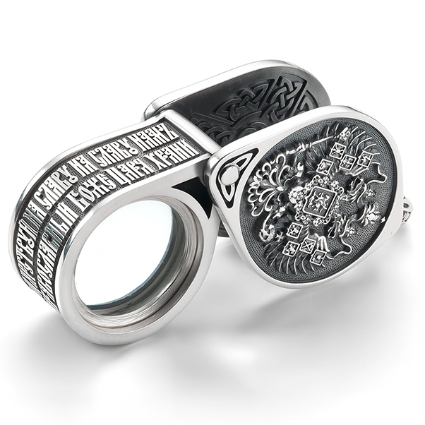Складная, портативная, ювелирная лупа с диаметром линзы в 21 мм., и тридцатикратным увеличением, выполнена из стерлингового серебра. К каплевидному корпусу приделана небольшая петля для крепления на цепочку, или брелок для ключей. Фирменный подарочный футляр в комплекте. Полностью ручная работа.