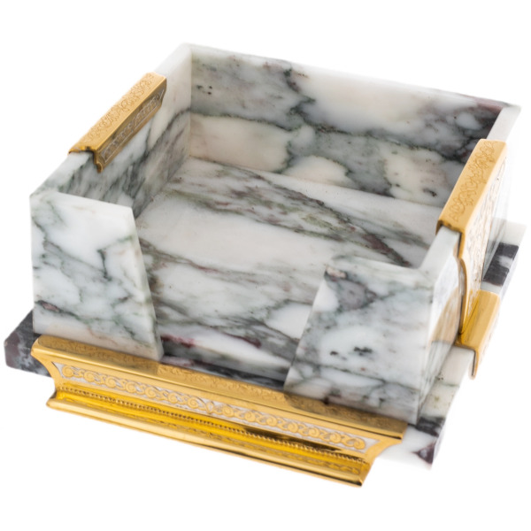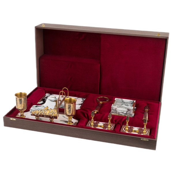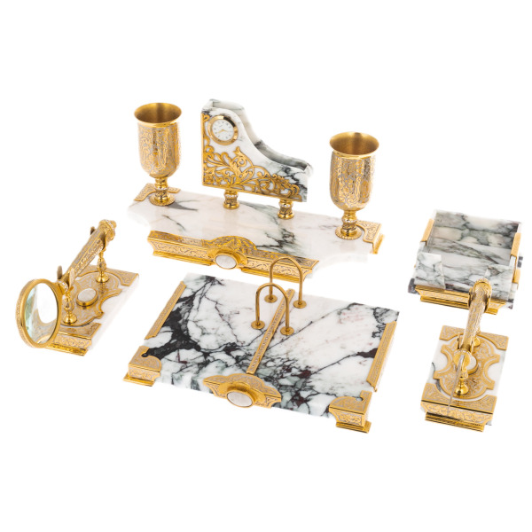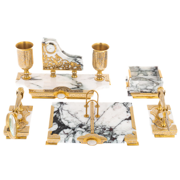Этот набор из белой яшмы олицетворяет собой величие империй, воплощённое в камне и золоте. Он — словно реликвия из дворцов великих монархов, подчёркивает власть и вкус обладателя, напоминая о временах, когда решения, изменяющие судьбы, принимались в кабинетах, облицованных мрамором, под сводами золотых лепных потолков.