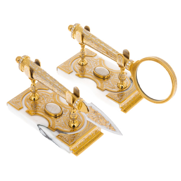 Нож для бумаг и лупа — не просто инструменты, но символы власти и контроля. Вырезанные вручную из высококачественного металла, украшенные золотой инкрустацией и сверкающими камнями, они создают впечатление антикварного оружия, оставляя в руках обладателя ощущение полного контроля над каждым подписанным документом.