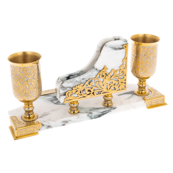 Центральный элемент — подставка для письменных принадлежностей, возвышающаяся на массивном основании из яшмы. Два бокала-держателя для ручек и карандашей, исполненные в лучших традициях золотого орнамента, словно колонны античного храма, возвышаются над композицией. Их ажурные узоры, отлитые из сияющего металла, напоминают о былом великолепии императорских покоев.