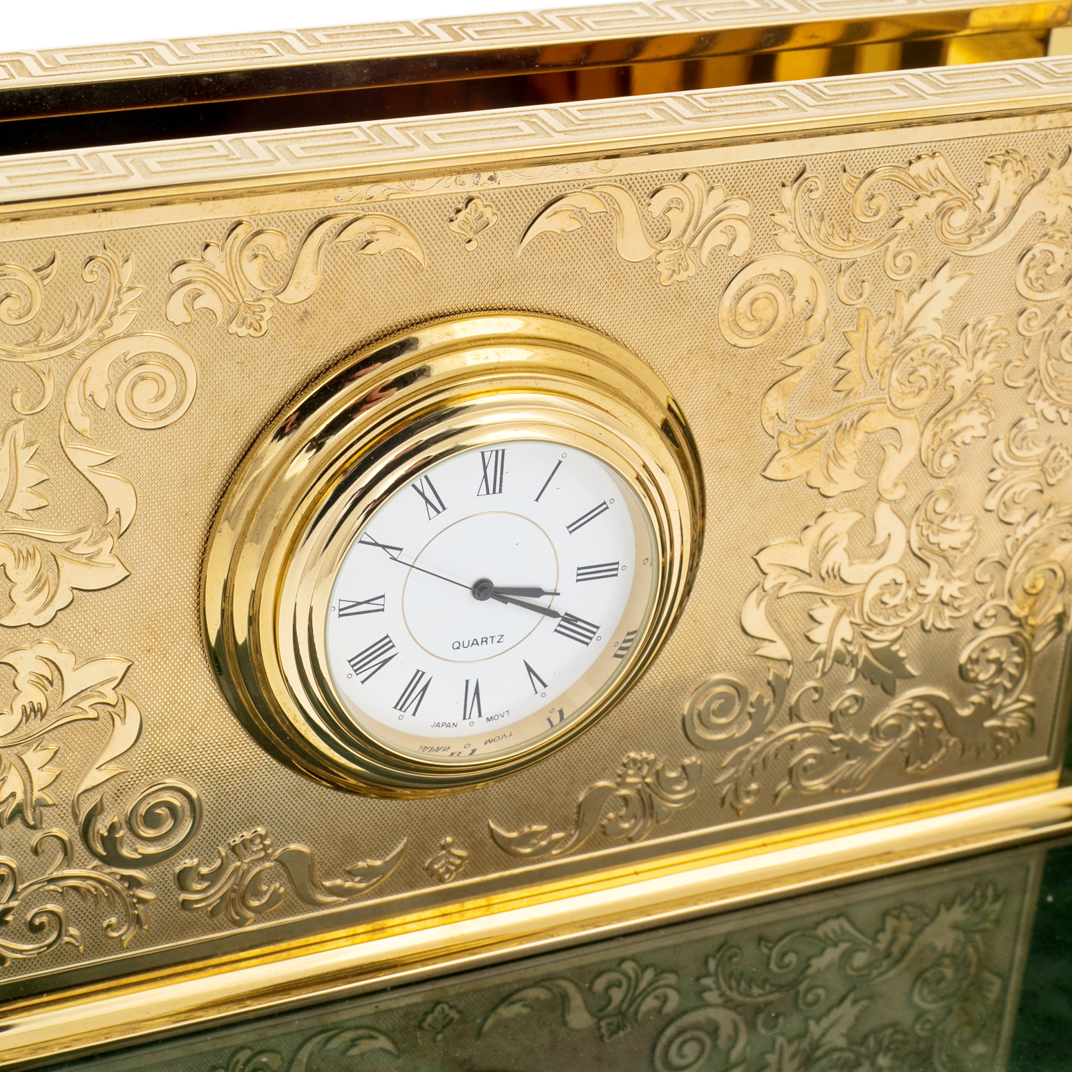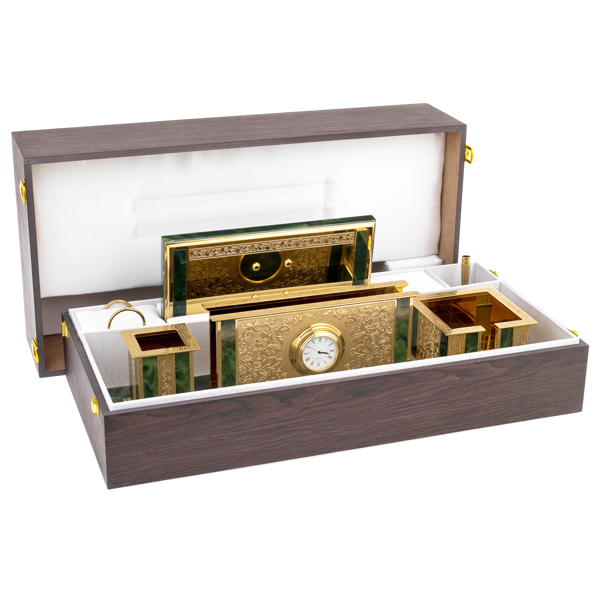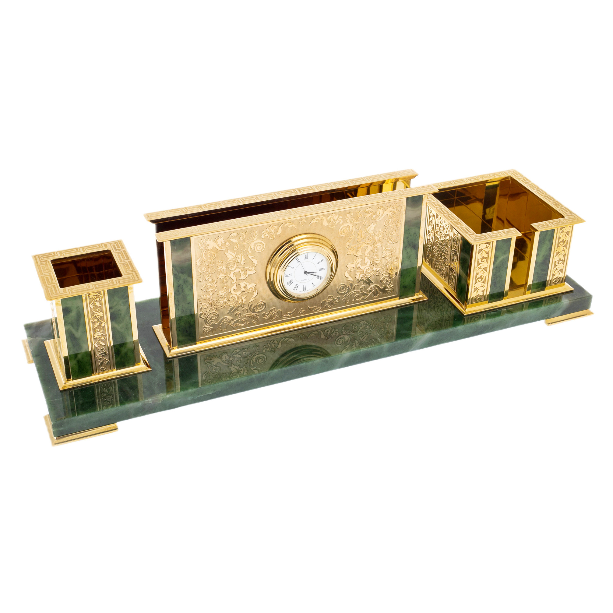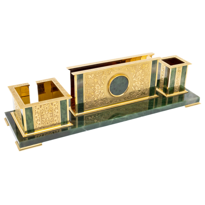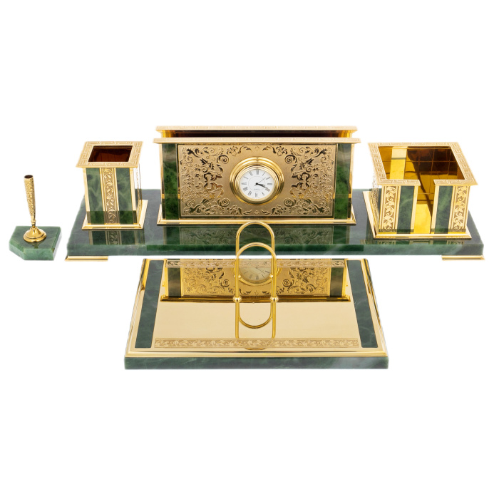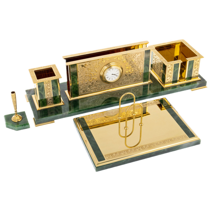 Набор настольный из нефрита "Президентский", Златоуст — символ авторитета и уверенной власти, воплощённый в благородных линиях и редких материалах. Композиция состоит из часов, подставки для визиток, двух ёмкостей для письменных принадлежностей и подставки под ручку. Все элементы объединены общим основанием из цельного пласта зелёного нефрита, отшлифованного до зеркального блеска. Металлические детали украшены тончайшей гравировкой и золочением, благодаря чему поверхность играет светом, раскрывая глубину камня и утончённость орнамента.