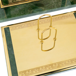 Златоустовская техника в этом исполнении достигает предельной точности — каждый элемент декора создан вручную, от рельефных завитков и растительных мотивов до микроскопических штрихов на бортиках. Золото не просто наносится, а втирается и полируется до состояния мягкого свечения, чтобы подчеркнуть текстуру нефрита. Контраст тёплого блеска металла и холодной глубины камня придаёт ансамблю монументальность, делая его предметом искусства, а не просто элементом кабинета.
