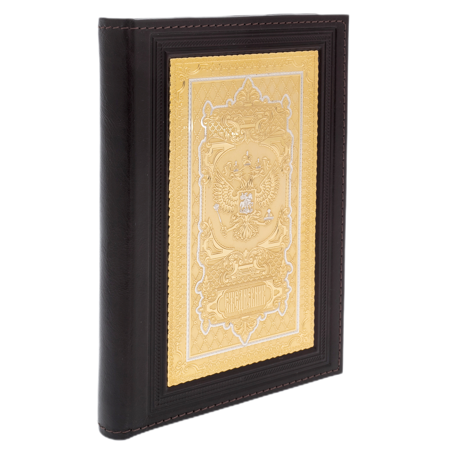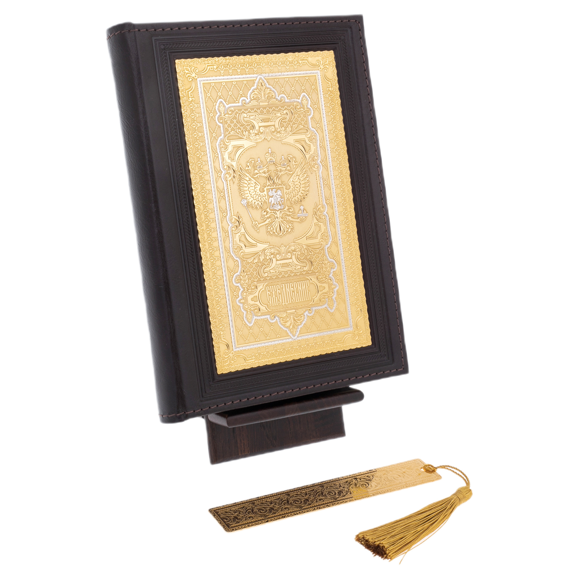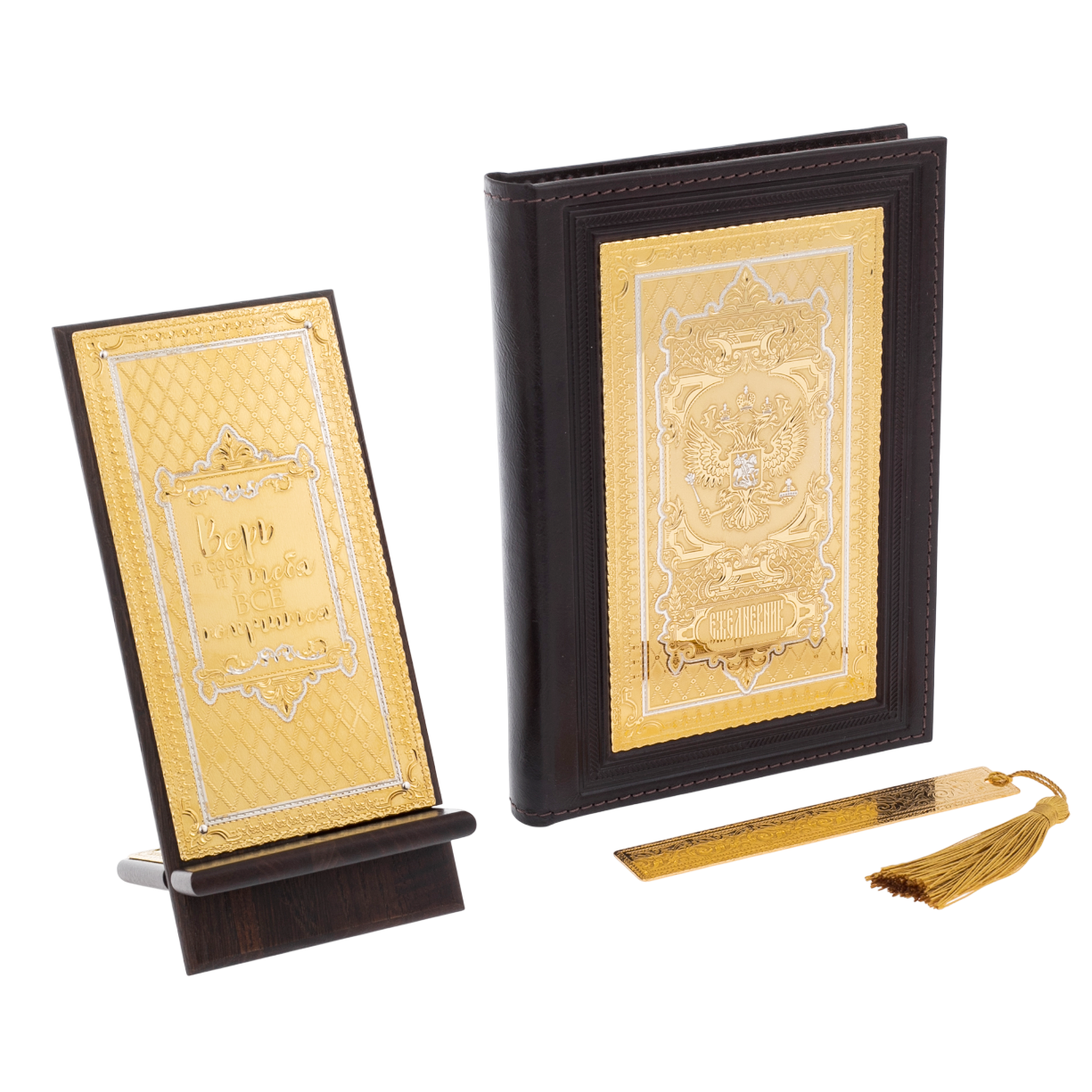 Подарочный набор «Эстет» из Златоуста — это гармония изысканности и функциональности, созданная для тех, кто ценит роскошь в деталях. Комплект включает ежедневник в кожаном переплёте, украшенный золочёной пластиной с гербом России и утончённым орнаментом, подставку с вдохновляющей надписью и закладку из металла с гравировкой и золотым напылением. Каждая деталь набора исполнена в едином стиле, где сдержанная строгость кожи сочетается с сиянием золота, подчеркивая высокий статус владельца.