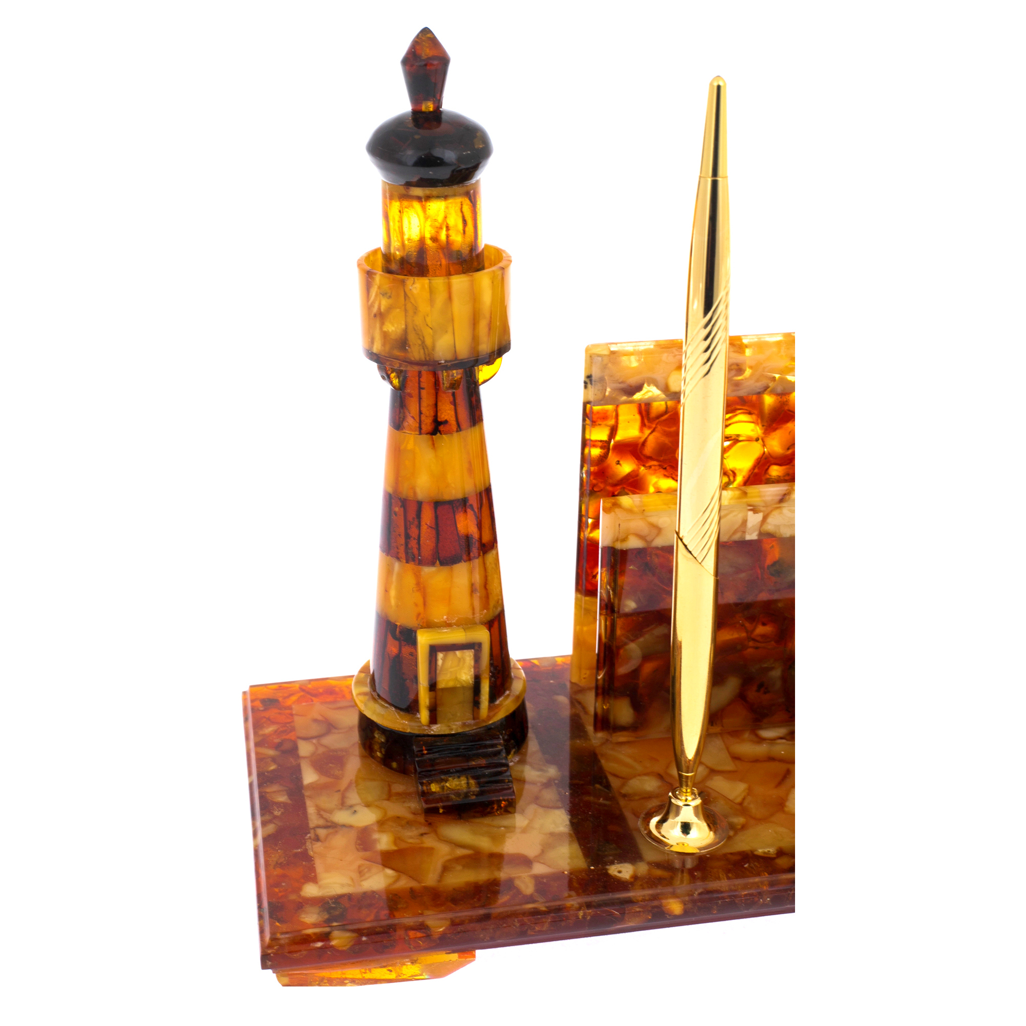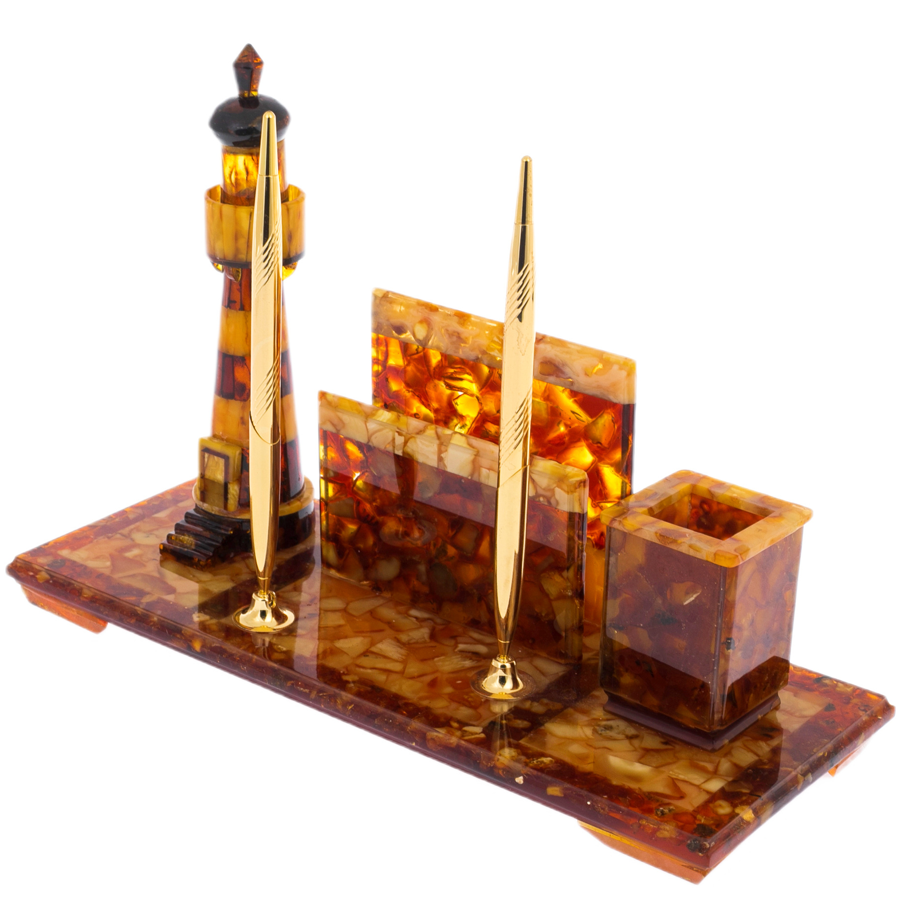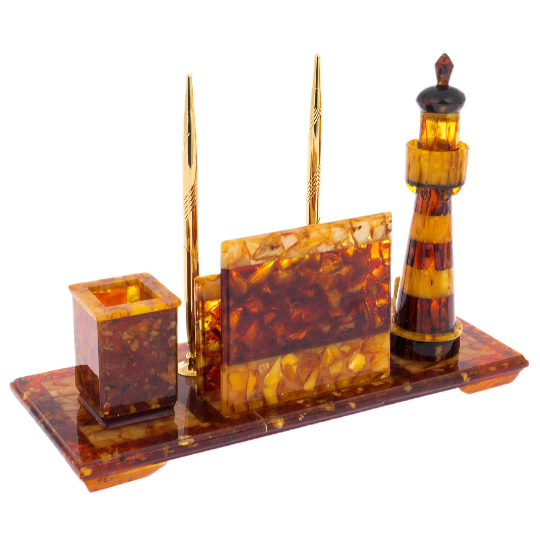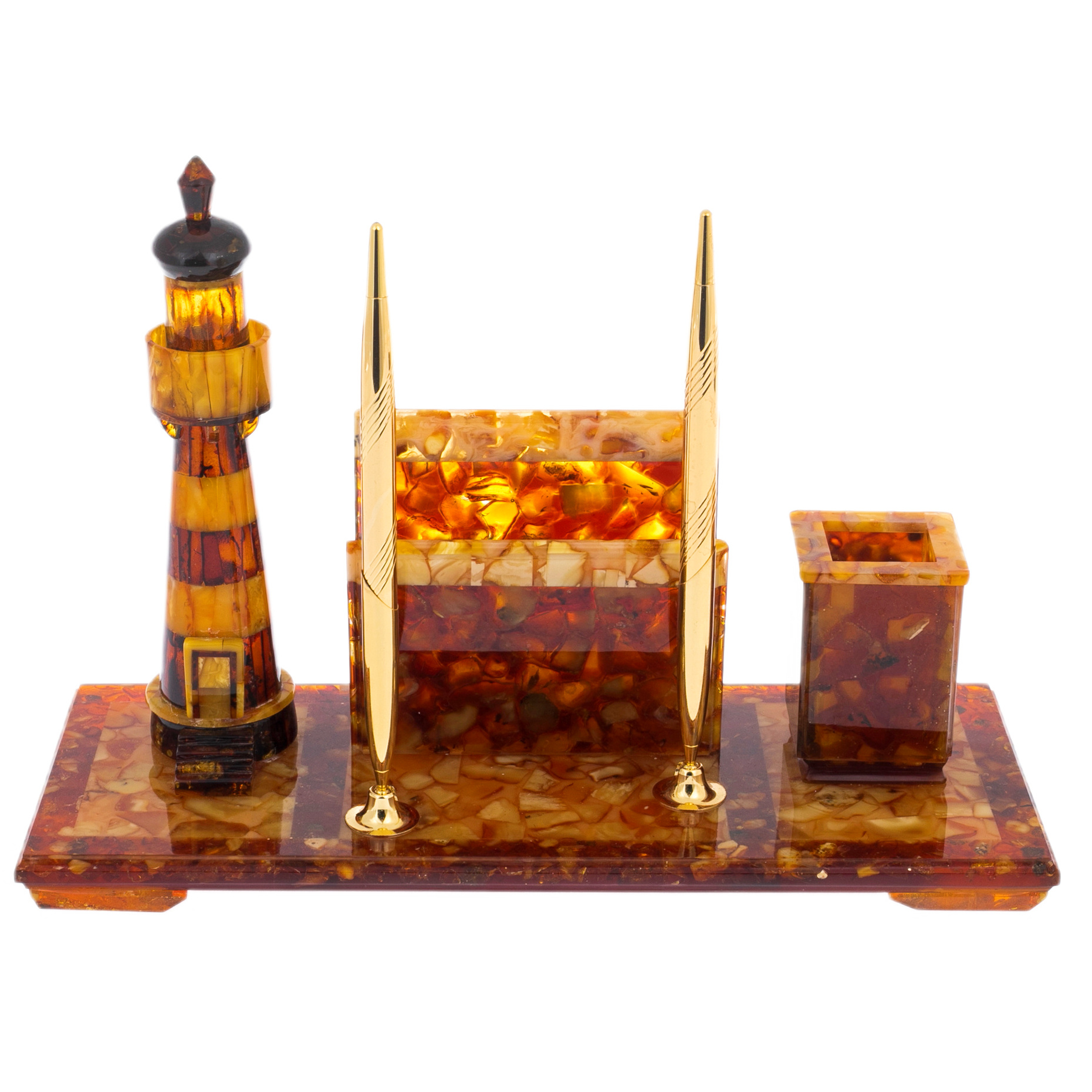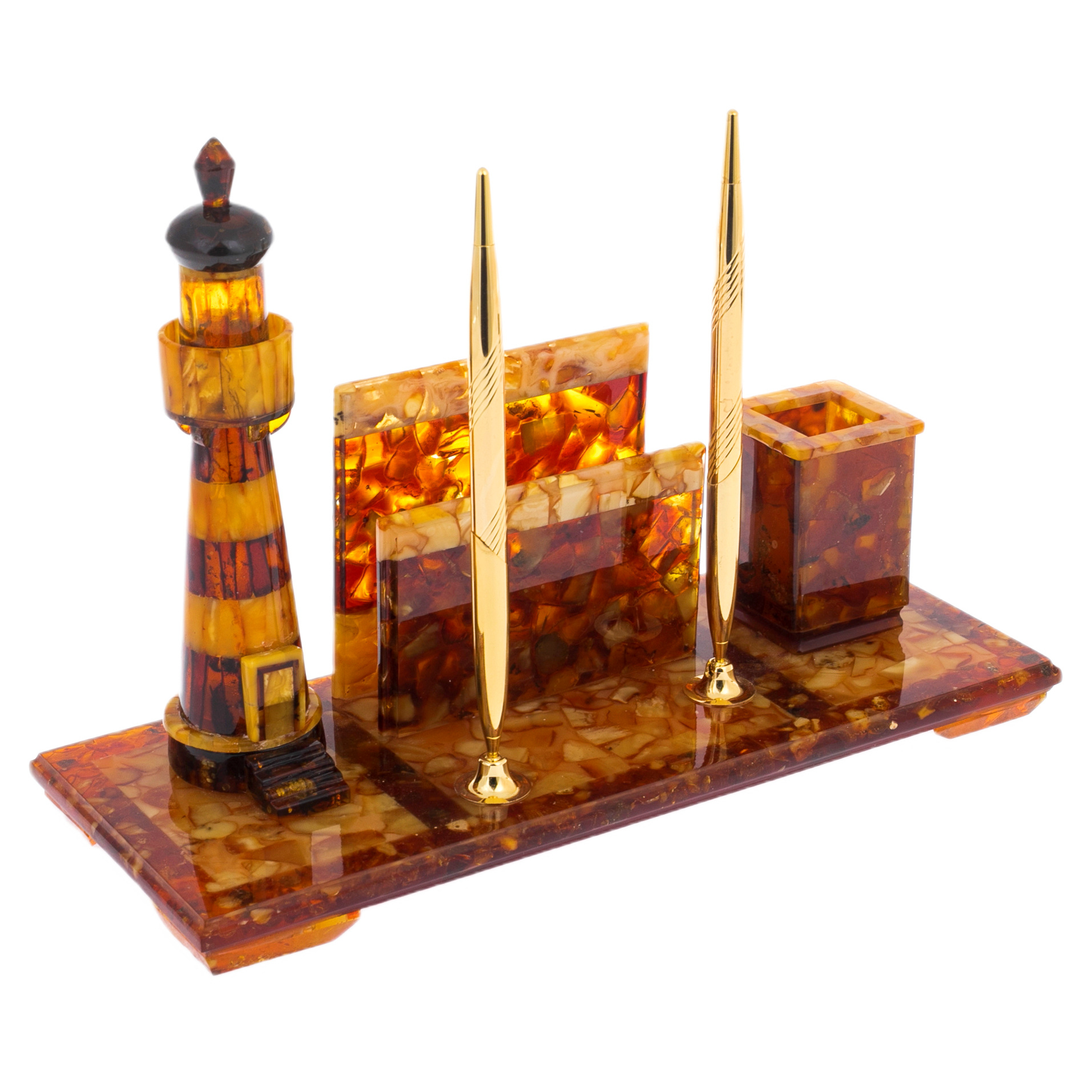 Рядом с маяком расположены подставка для письменных принадлежностей и визитница, выполненные из того же солнечного камня. Янтарь преломляет свет, создавая эффект глубины, будто в его толще скрыты целые эпохи. Эти элементы не просто удобны, но и подчёркивают безупречный вкус владельца, превращая привычные рабочие моменты в истинный ритуал власти.