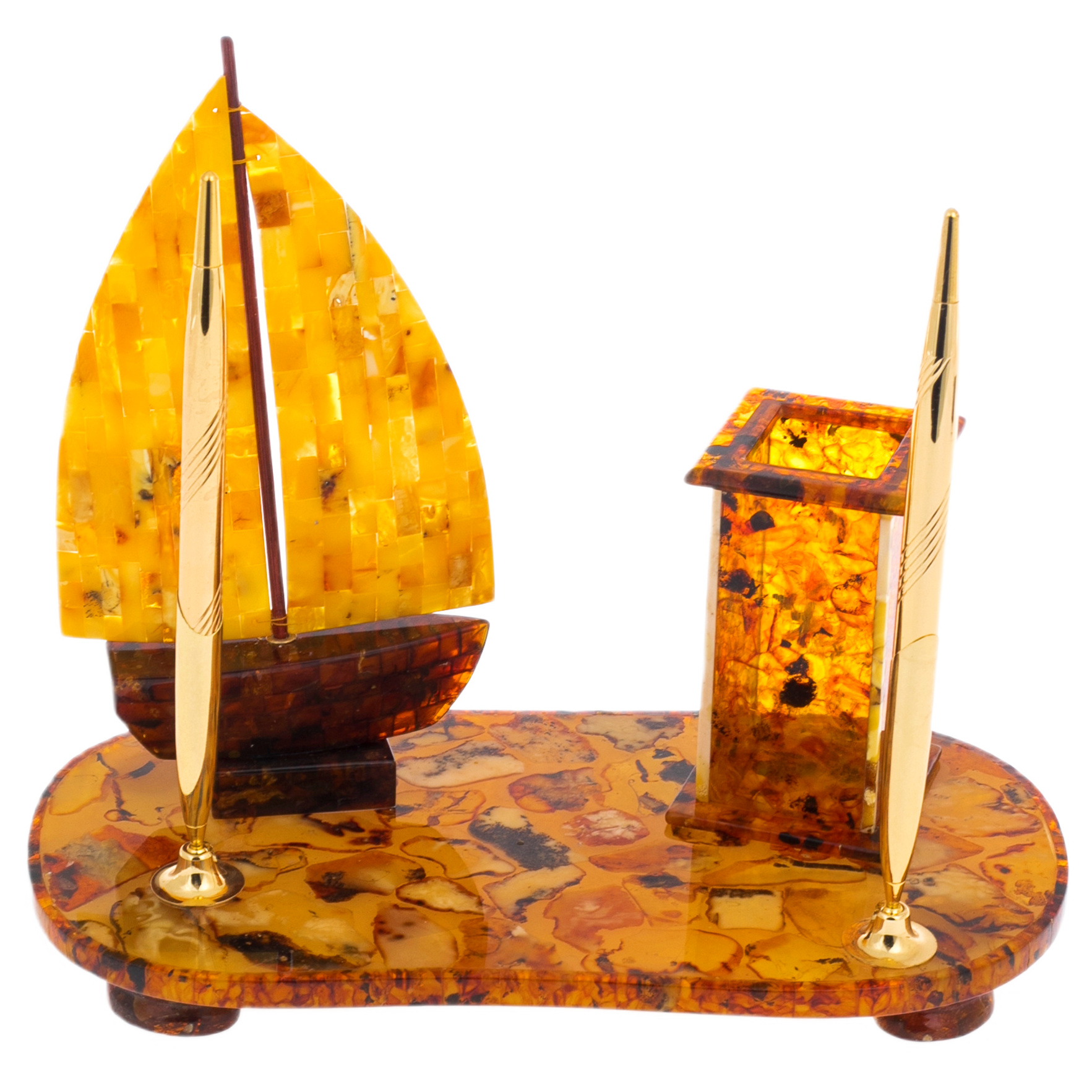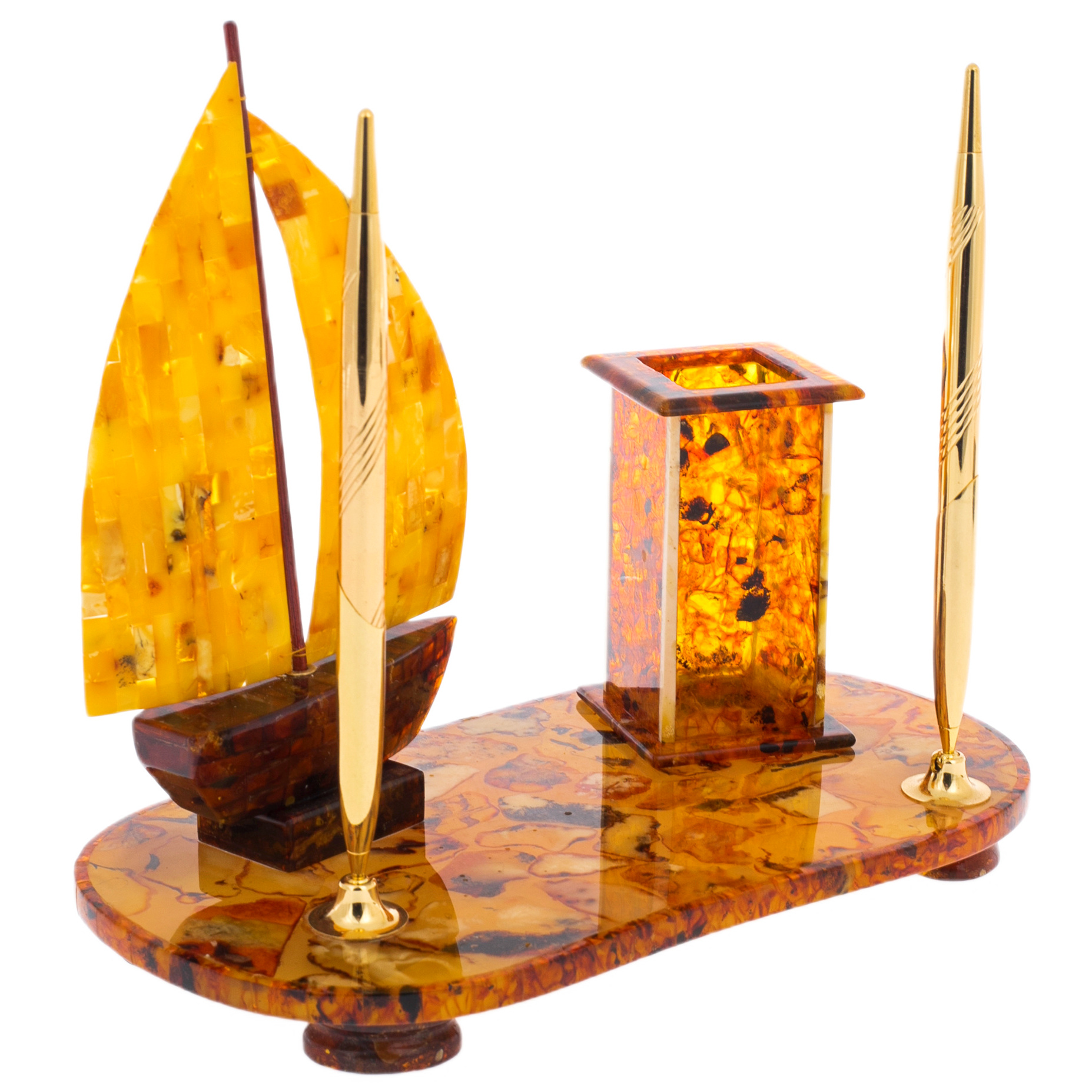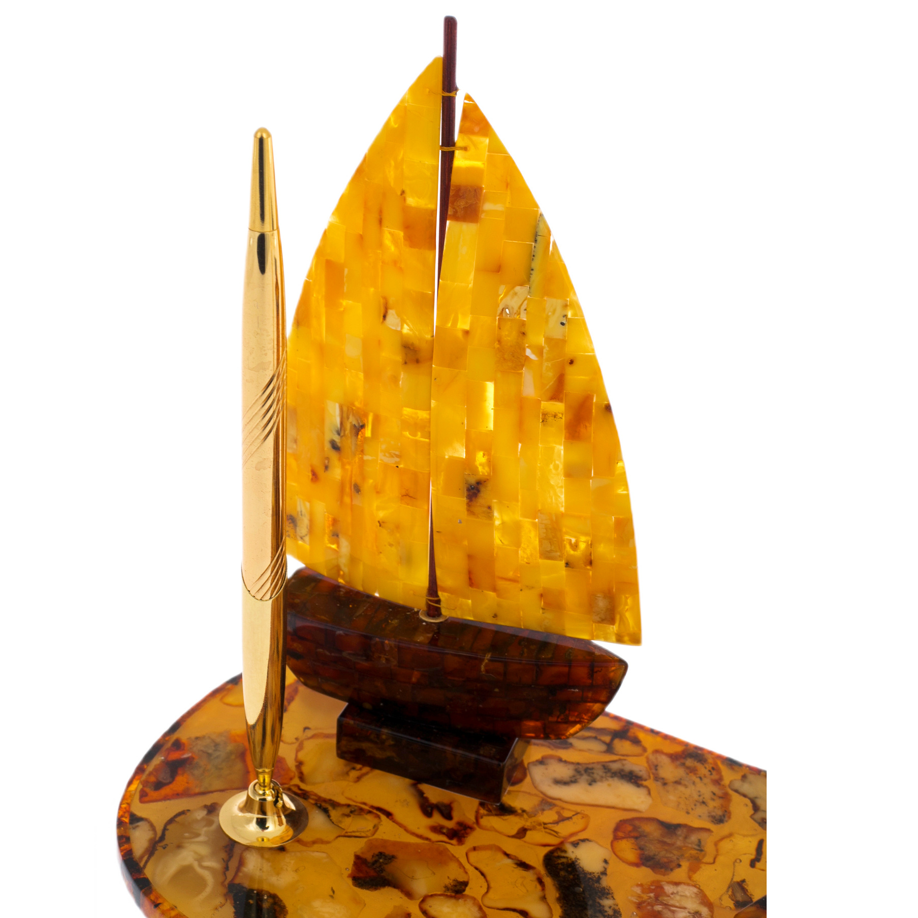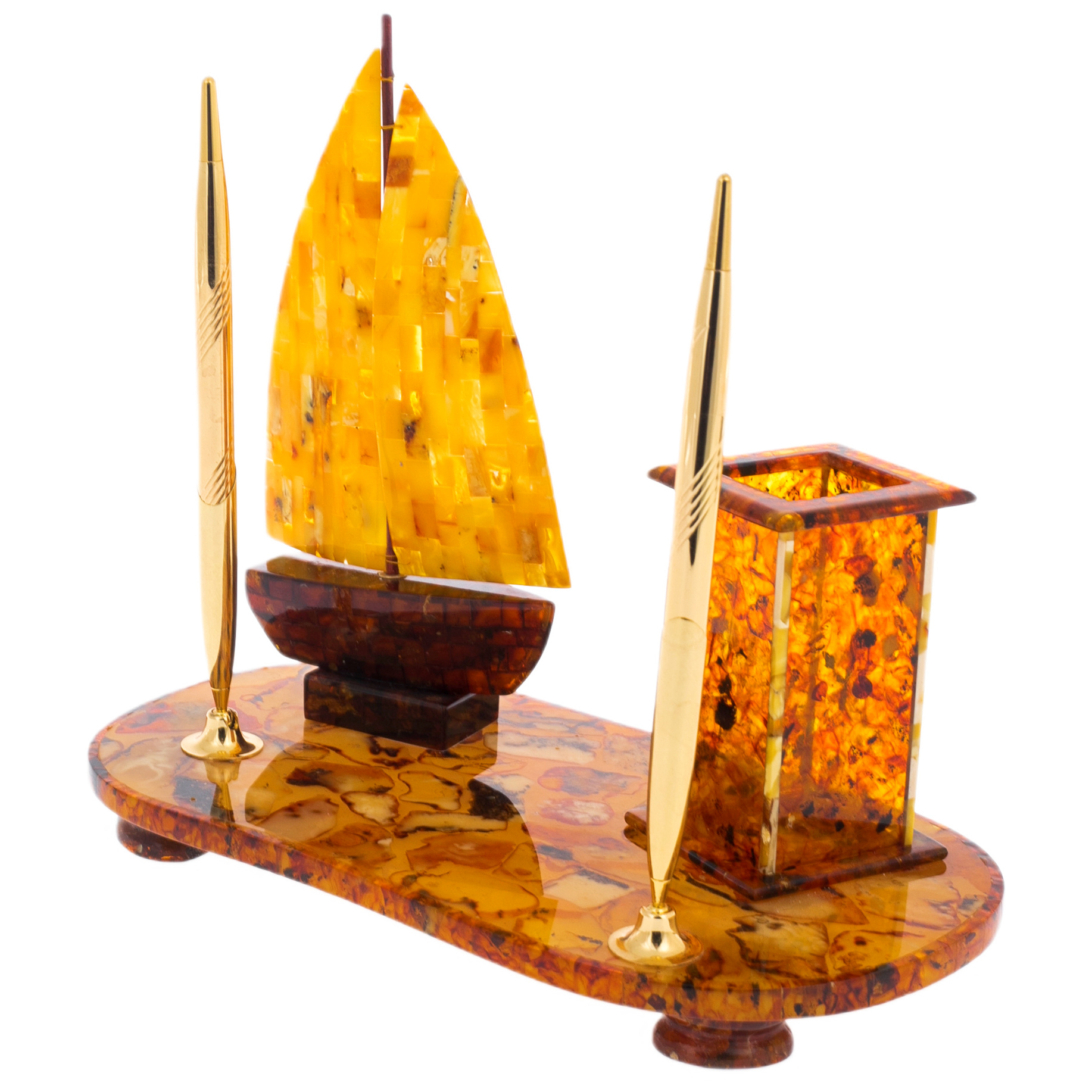 Перед вами настольный набор из янтаря "Венеция" — воплощение утонченного вкуса и высокого статуса. Каждый элемент этого изысканного произведения создан вручную, чтобы стать символом власти, успеха и неугасимой энергии созидания. Янтарное парусное судно, отливающий золотом корпус и переливающиеся мозаичные паруса — метафора свободного движения к новым горизонтам, неизменного лидерства и безупречного стиля.