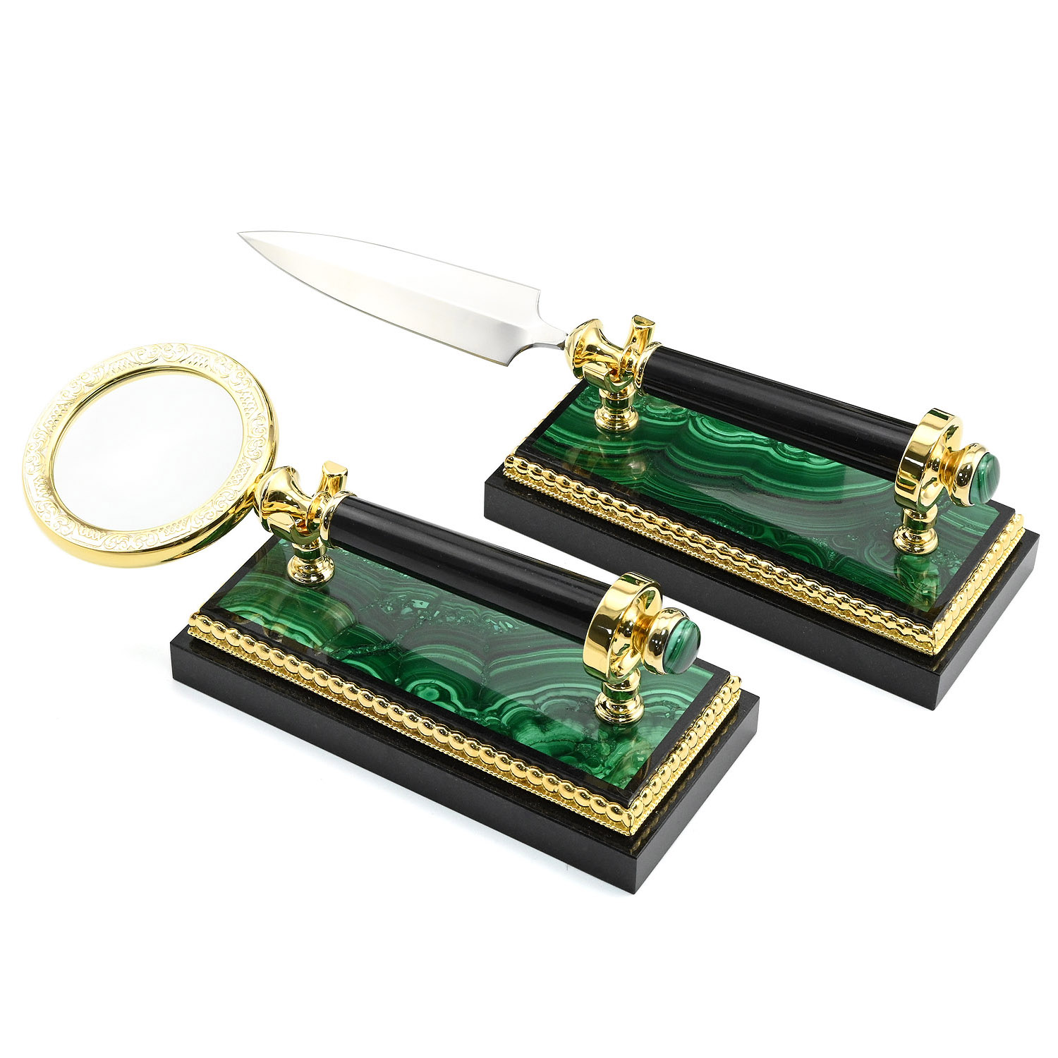 Материал: малахит, долерит, бронза, латунь, никель, золото.
