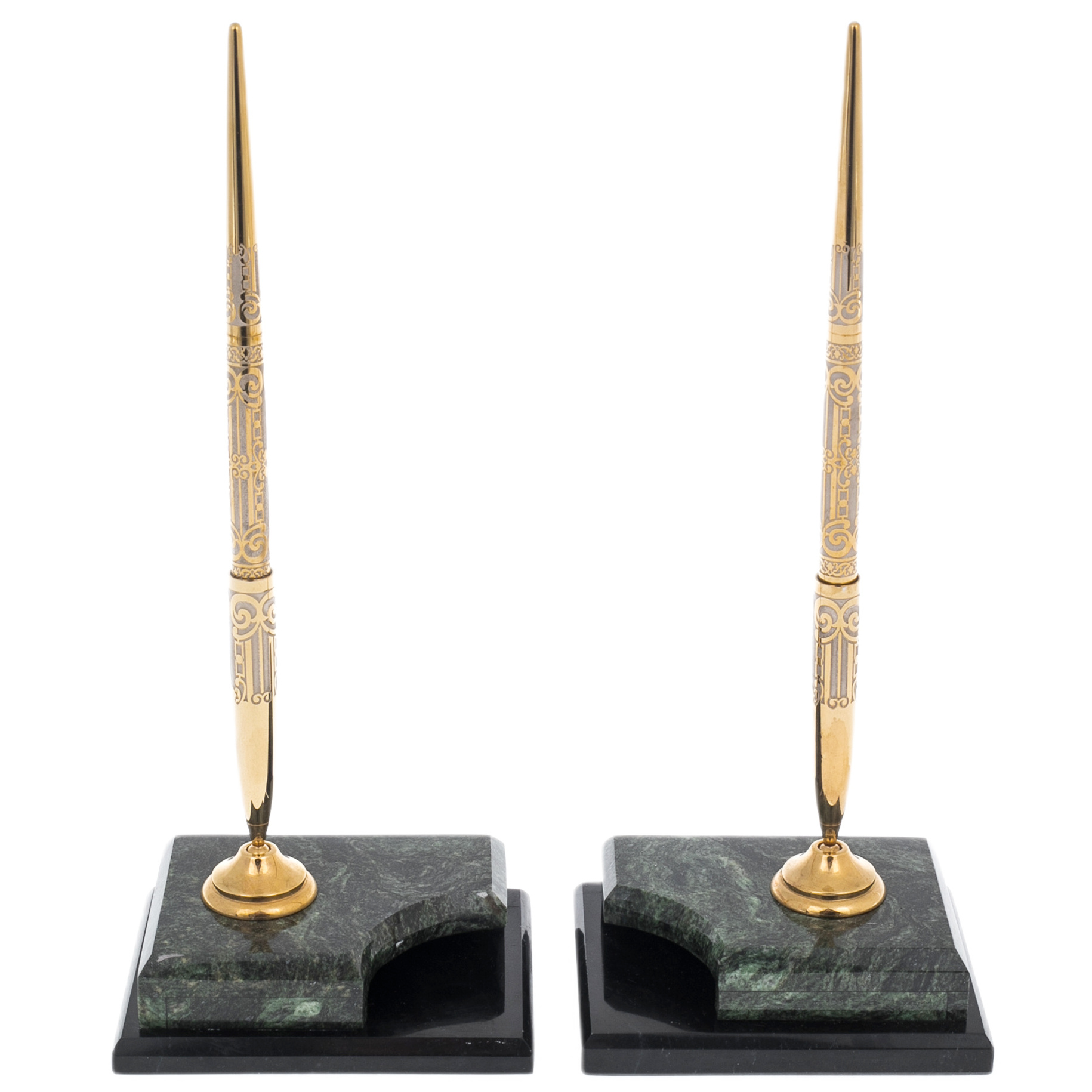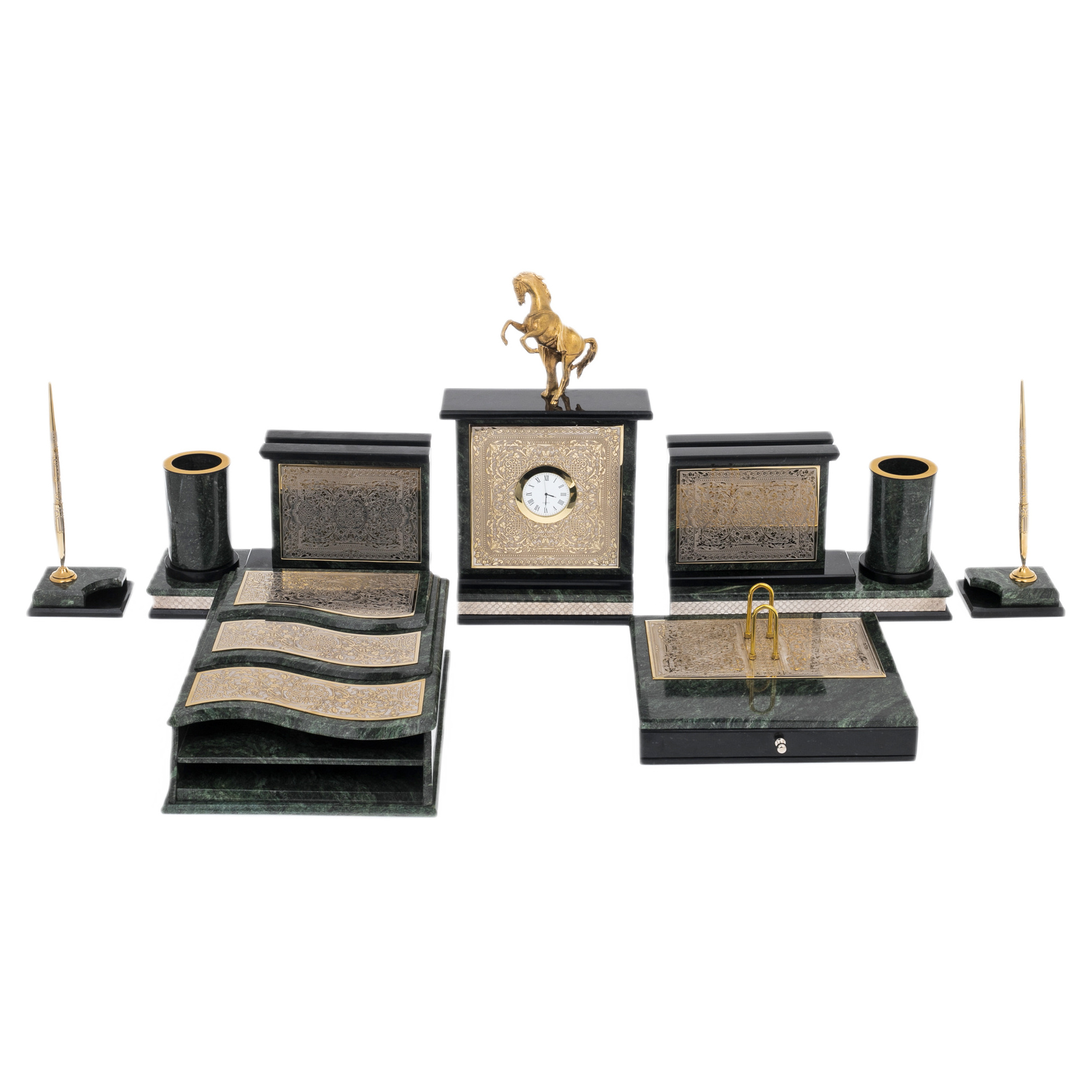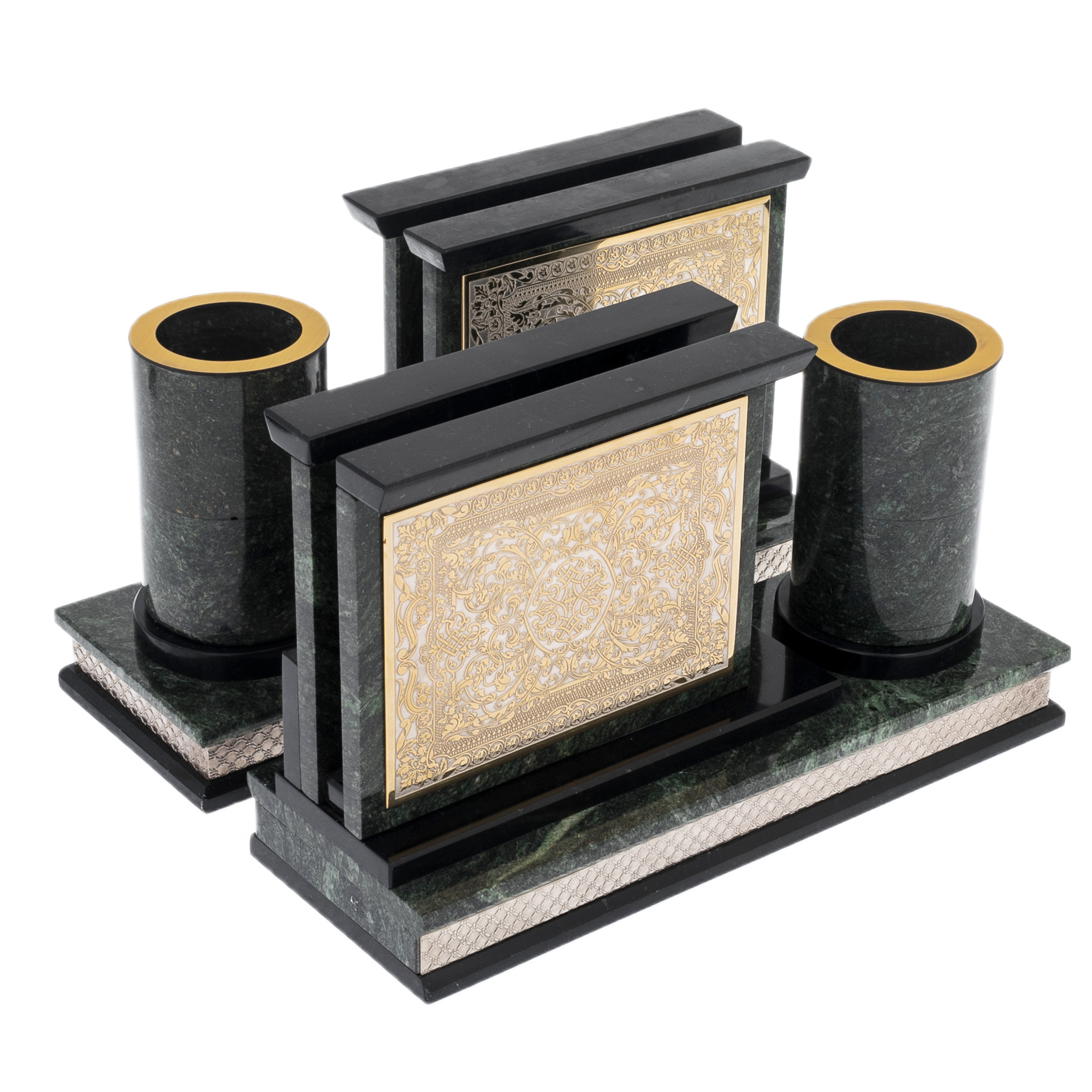 Змеевик и долерит придают изделию монументальность и основательность, а искусная отделка превращает его из утилитарного предмета в произведение искусства. Каждый элемент — от подставок для ручек и визитниц до бумаги и канцелярских принадлежностей — подчинён единому стилю, создавая гармоничное и цельное впечатление.