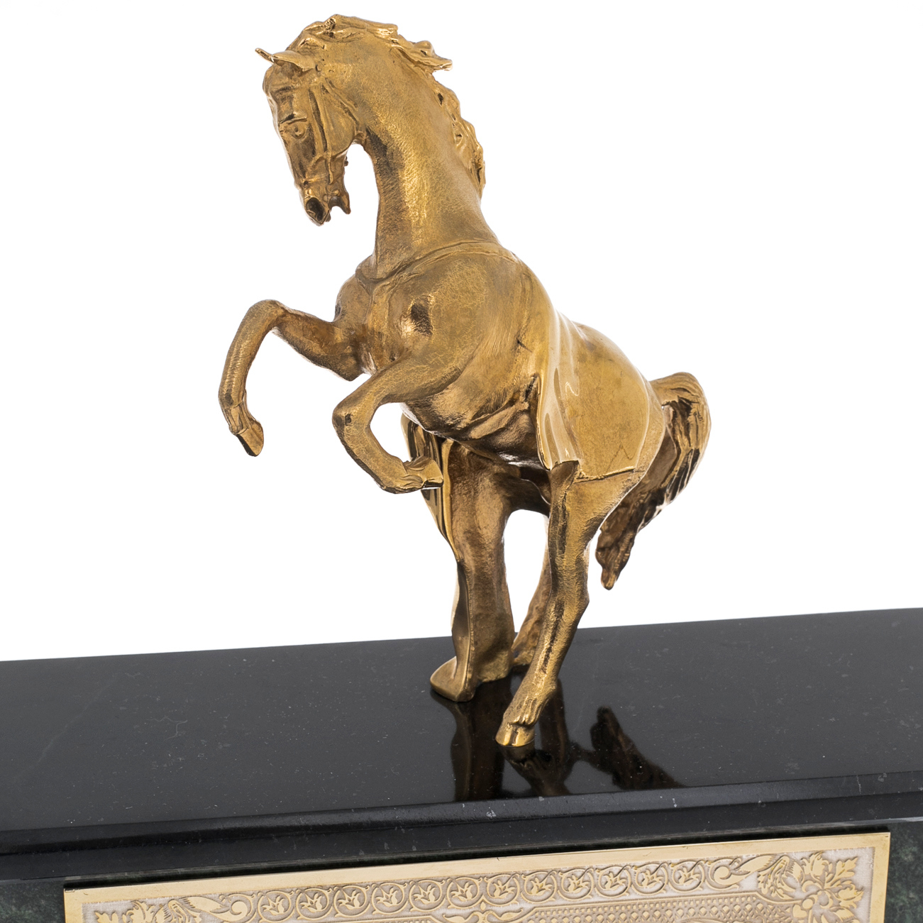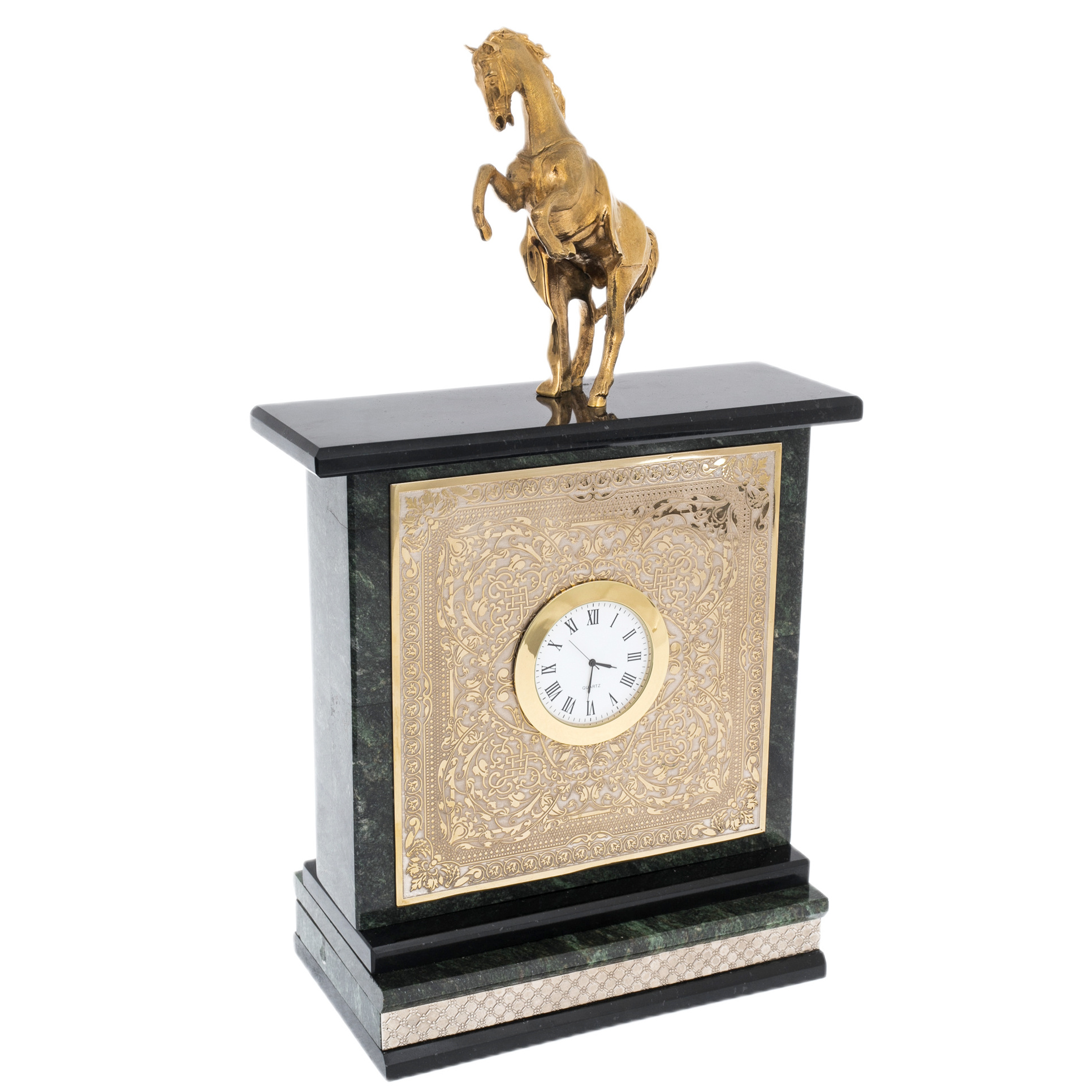 Настольный набор из змеевика и долерита «Лошадь» — это воплощение силы и стремительности, соединённых с гармонией и статностью классического кабинета. Центральным элементом композиции выступают часы, увенчанные фигурой вздыбленной лошади, символизирующей энергию, свободу и победу. В композиции удачно сочетаются строгие формы и богатое декоративное убранство, подчёркнутое филигранной гравировкой по металлу с позолотой.