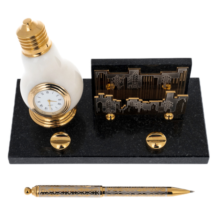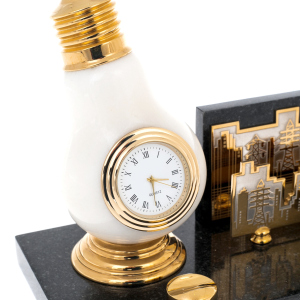 Настольный набор из долерита «Лампочка» — утончённое сочетание инженерной мысли и художественного мастерства, воплощённое в строгих формах и благородных материалах. На глубоком, почти космическом фоне долерита — камня силы и устойчивости — возвышается фигура лампы из белого камня с золотым цоколем. В её основании встроен часовой механизм, обрамлённый позолоченным кольцом, символизирующим течение времени и бесконечность человеческих идей.