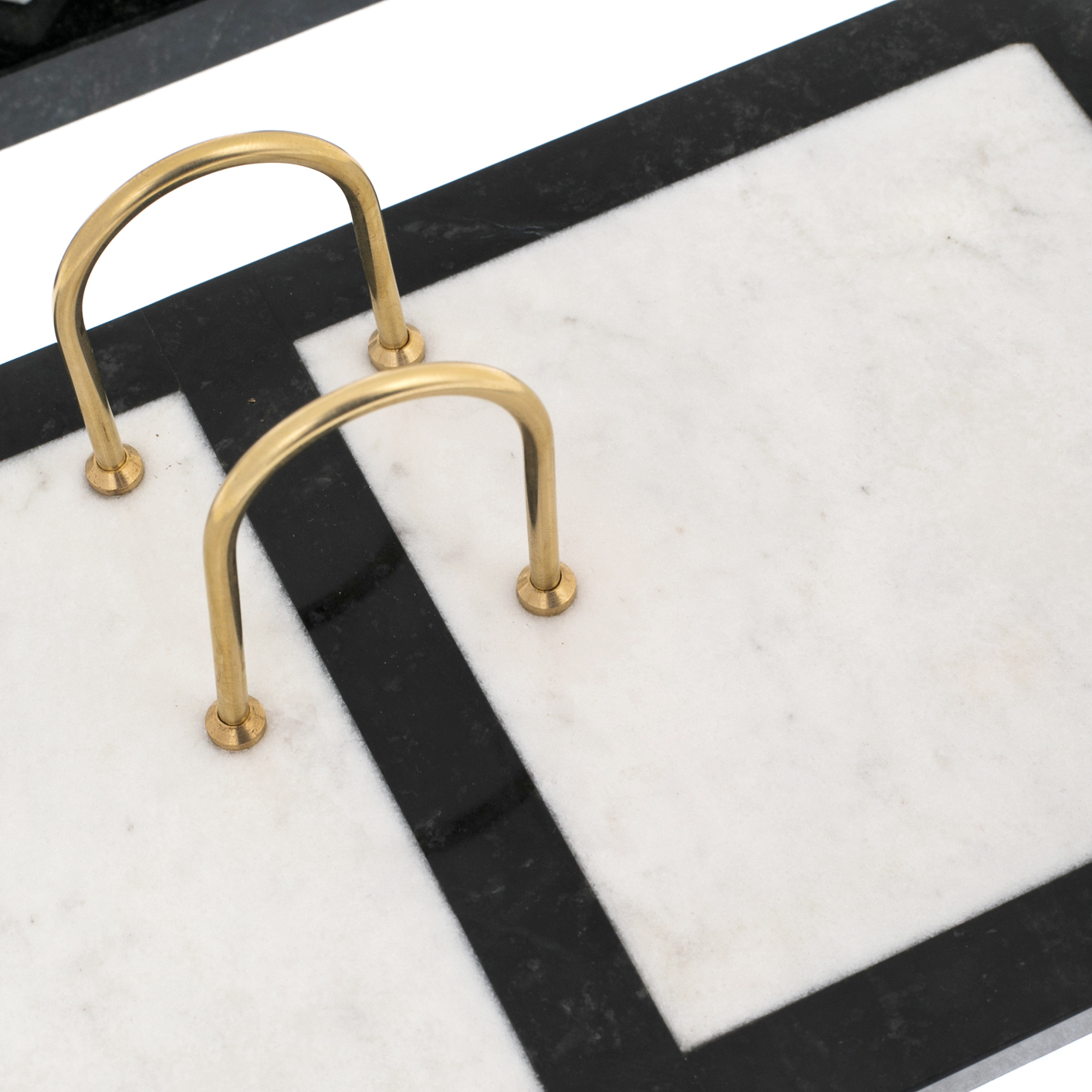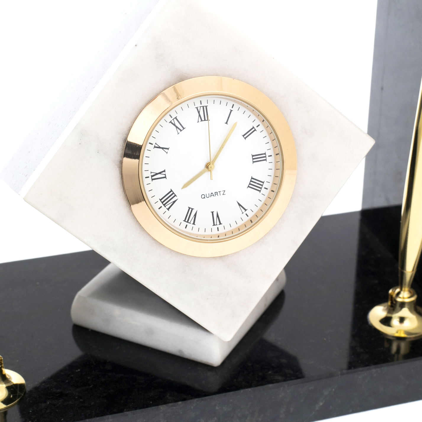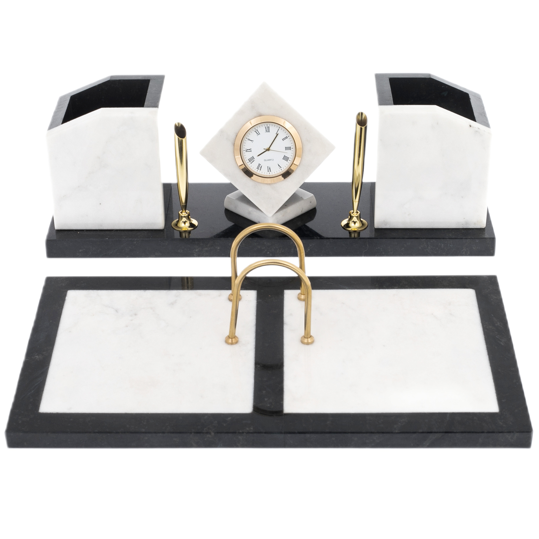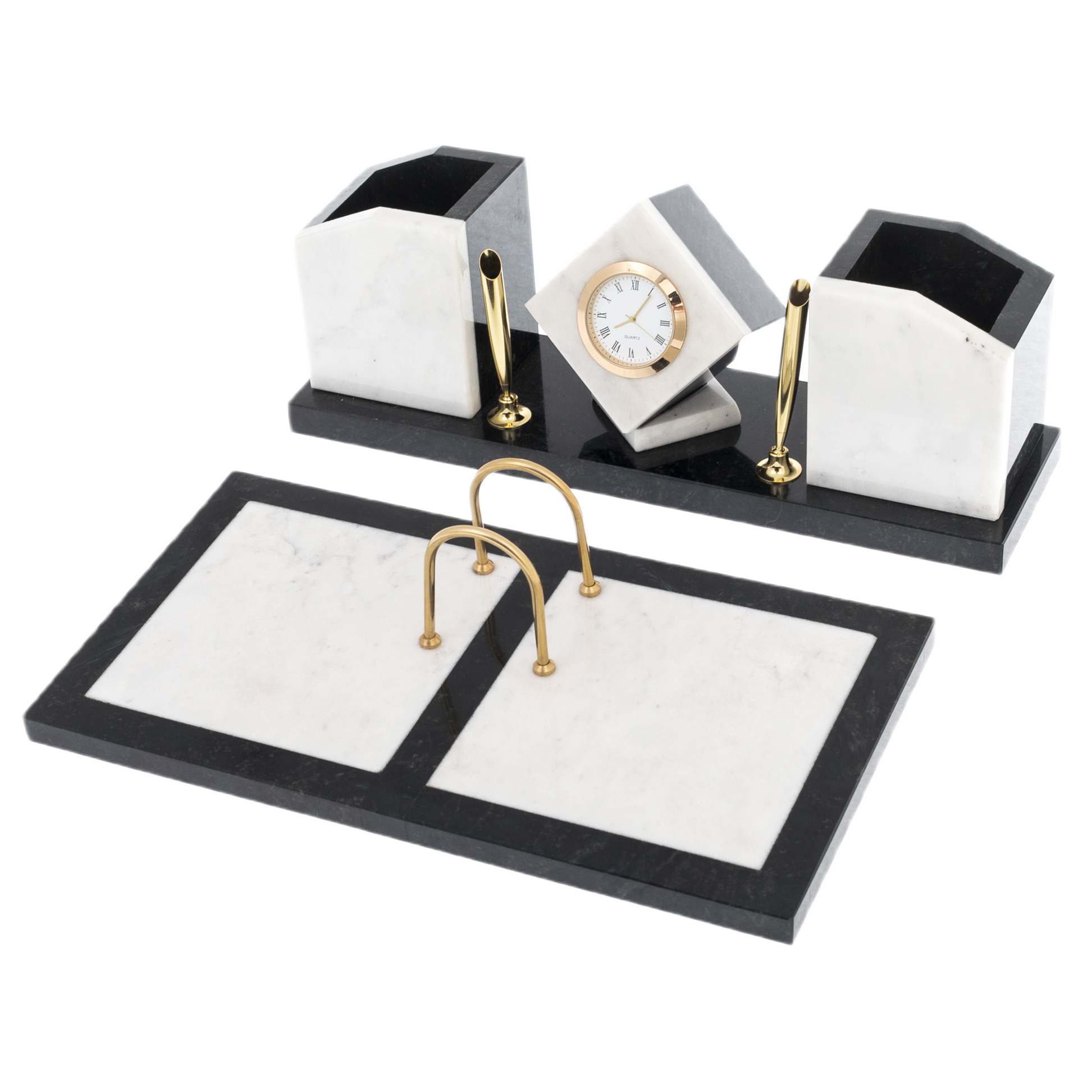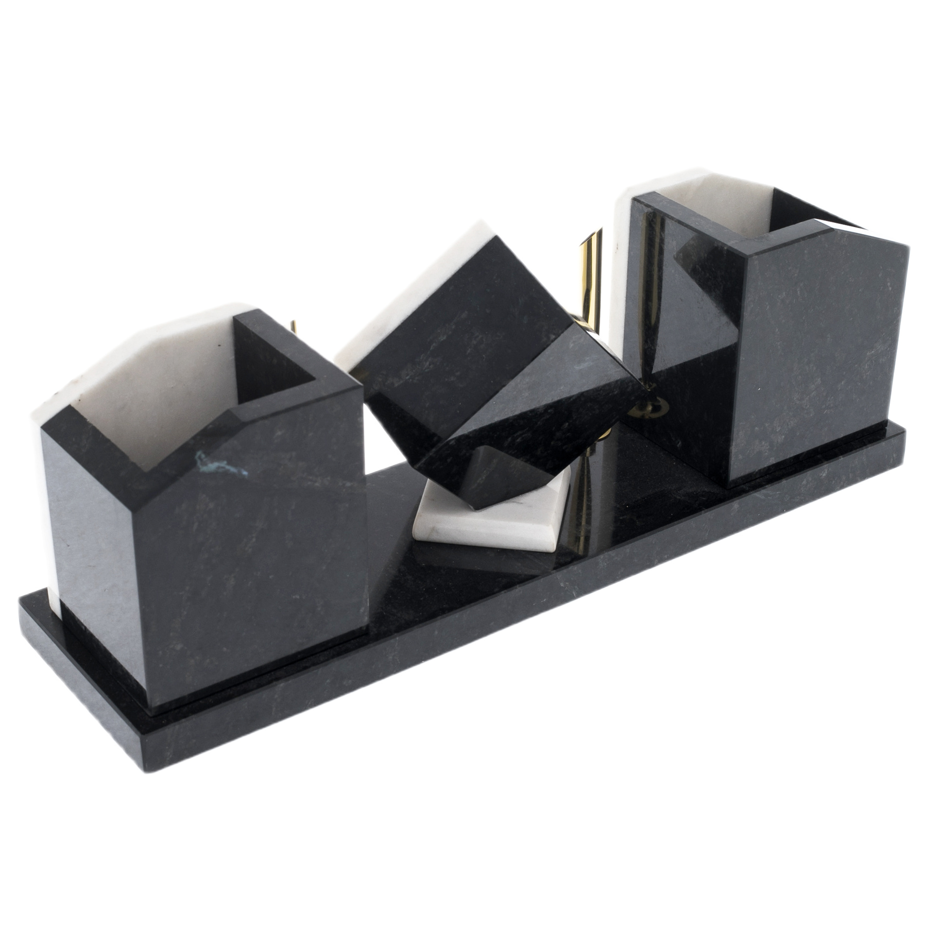 Контраст двух природных камней подчёркивается вставками из латуни — пара золотистых перьевых ручек сдержанно акцентируют композицию, придавая ей статусность. На переднем плане — массивный лоток с держателем для бумаг, отделанный в той же манере: белоснежный мрамор, врезанный в черный долерит, обрамлен филигранным латунным ободом. Каждая деталь отточена, каждая линия просчитана, каждая грань подчинена общей геометрии совершенства.