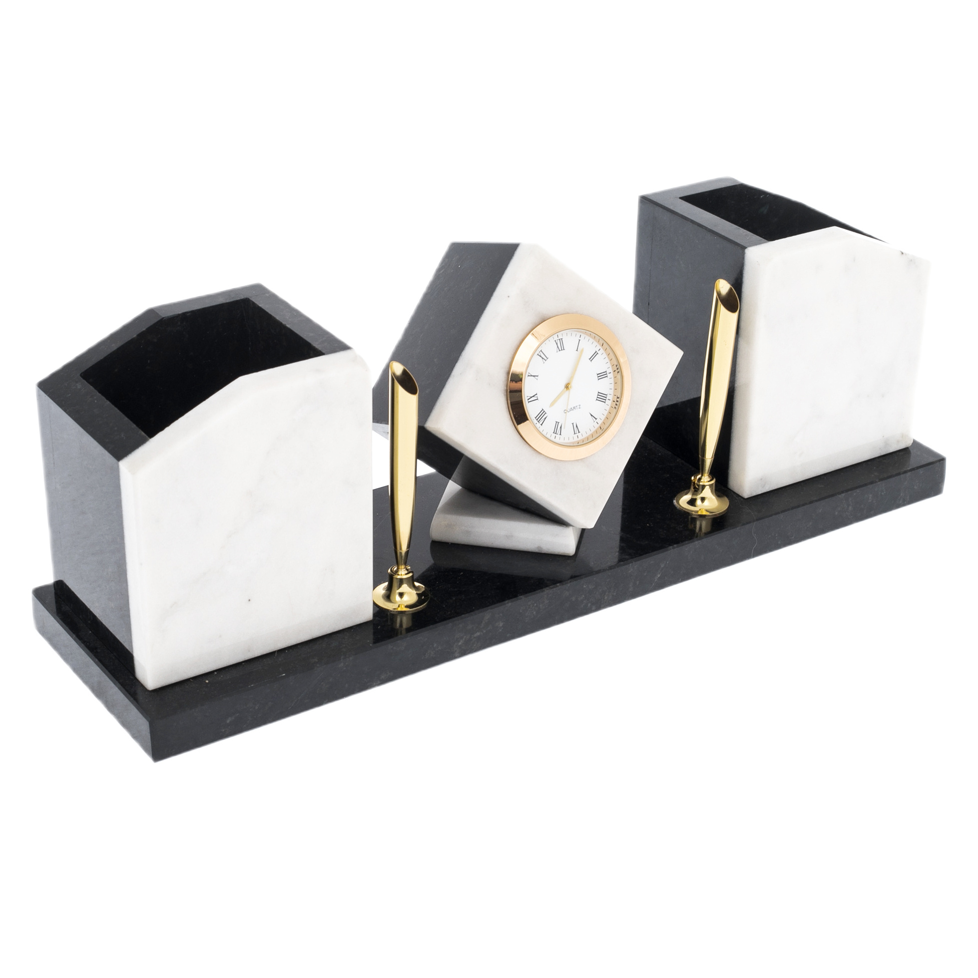 Письменный набор, выполненный из черного долерита и белого мрамора, являет собой безупречное воплощение архитектурной строгости и дизайнерской выразительности. Лаконичные формы двухдержавных карандашниц уравновешены динамикой диагонально поставленного куба с часами, заключающего в себе ощущение ритма, структуры и вечного движения. Плоскости камня, отполированные до зеркального блеска, отражают свет с достоинством, свойственным только истинно благородным материалам.