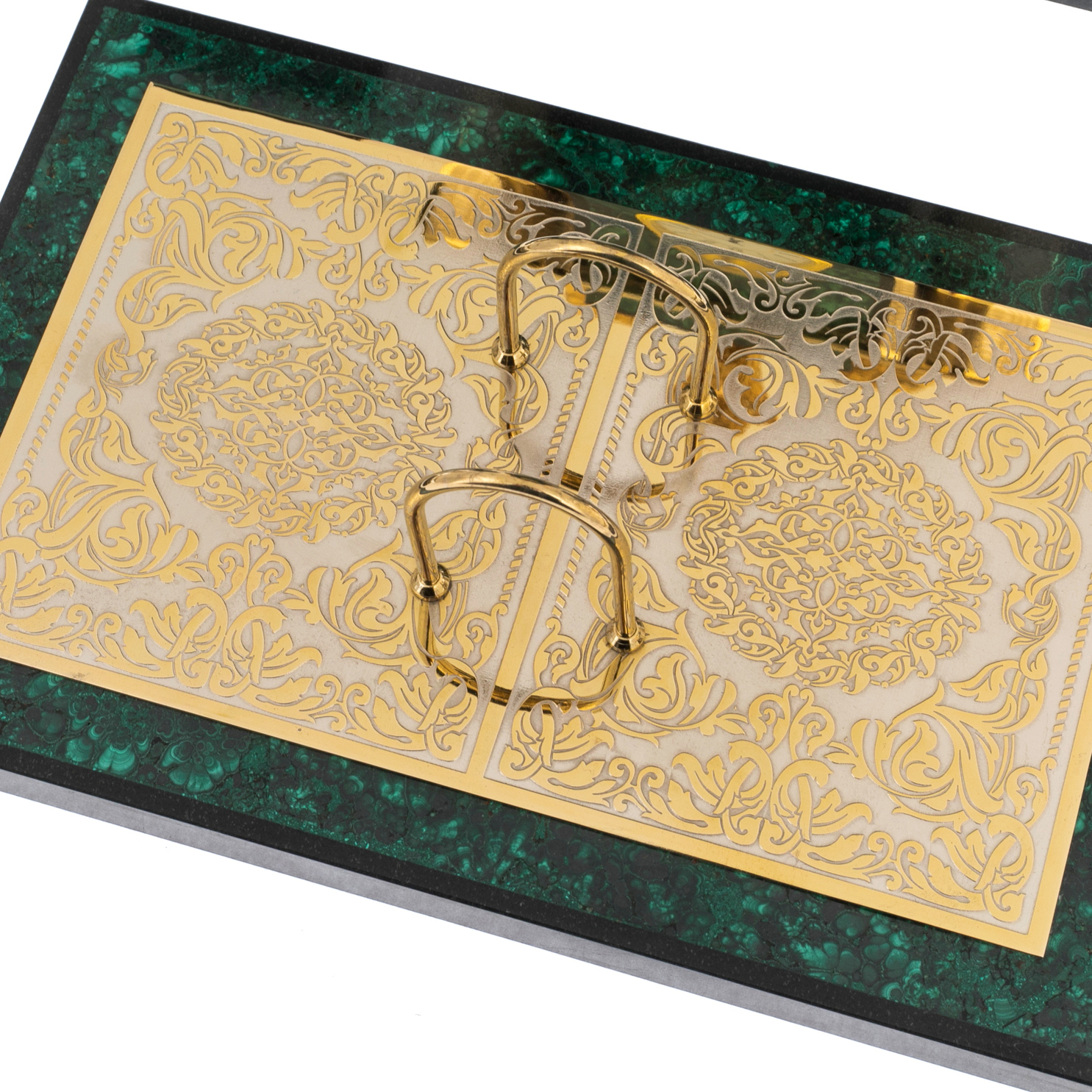 Настольный набор из малахита "Орёл" от мастеров Златоуста словно воплощает в себе величие эпох и мудрость веков. Это не просто аксессуар для рабочего пространства, а истинное олицетворение власти, силы и безупречного вкуса. Как древняя реликвия, он передаёт историю и торжественность каждому, кто к нему прикасается.