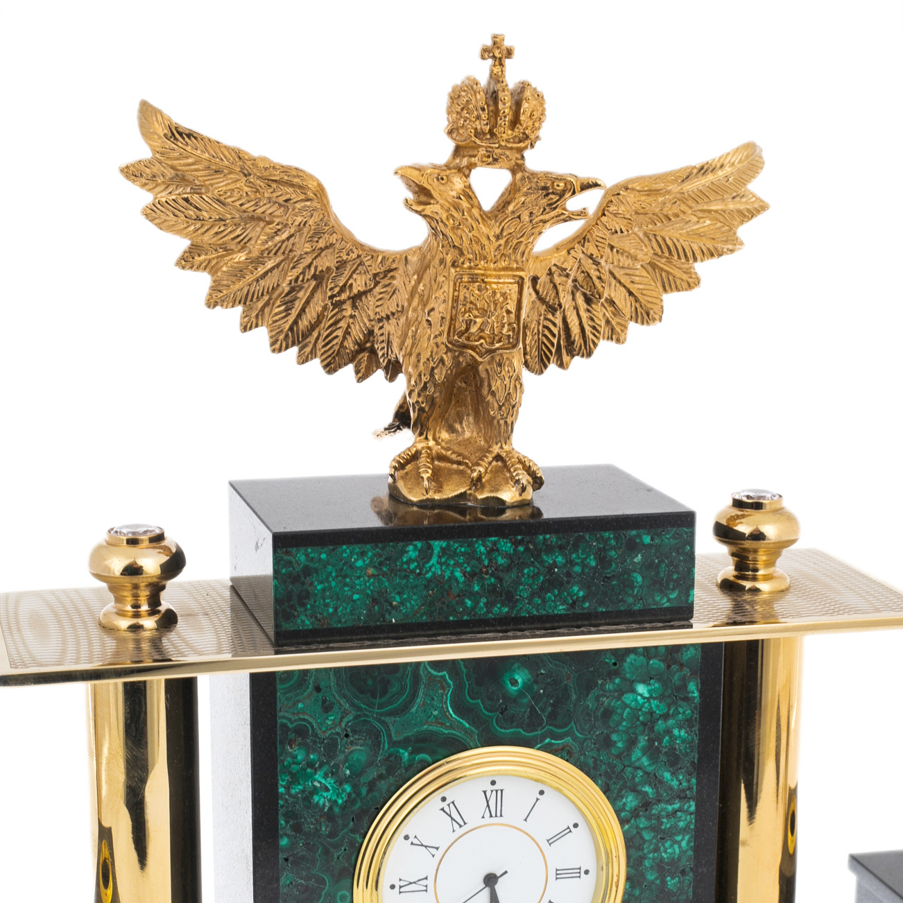 Взгляд орла, венчающего центральную композицию, подобен охранителю времени и символу неугасающего могущества. Его крылья, раскинувшиеся в золотом сиянии, словно оберегают своего обладателя, придавая ему уверенность и силу. Часы, украшенные утончённой гравировкой, олицетворяют течение времени, которое подвластно лишь тем, кто способен управлять собственной судьбой. Малахитовая основа, глубокая и таинственная, будто скрывает в себе силу природы, древнюю и непостижимую, добавляя изделию особую энергетику и значимость.