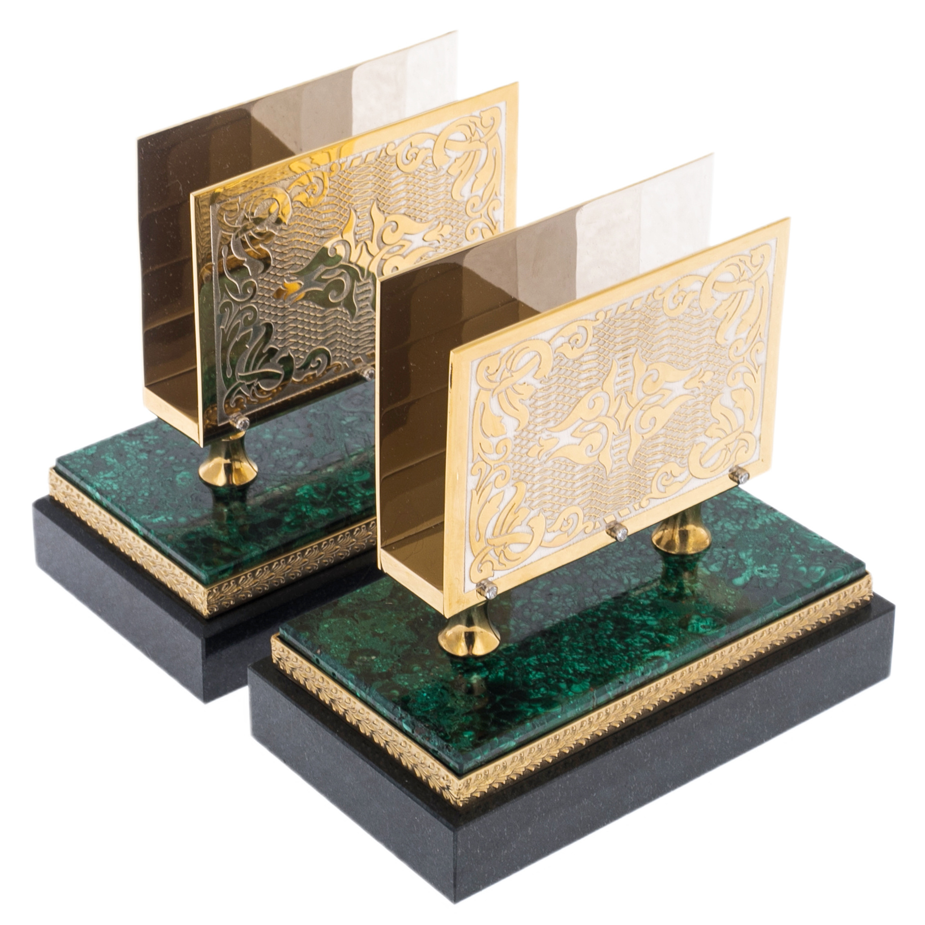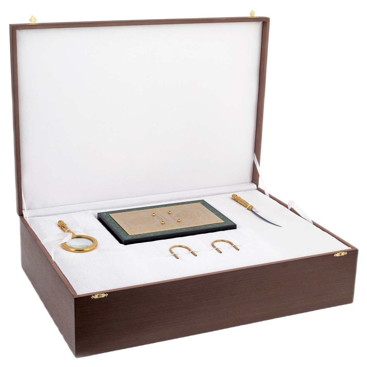 Каждая деталь набора – это маленькое произведение искусства, созданное руками виртуозных мастеров. Подставки для канцелярских принадлежностей, визиток и бумаг, украшенные изысканными золотыми узорами, напоминают о том, что даже в мелочах можно найти истинное совершенство. Ручная гравировка на металле словно запечатлевает в себе дыхание мастерства, превращая каждый элемент в бесценный артефакт.