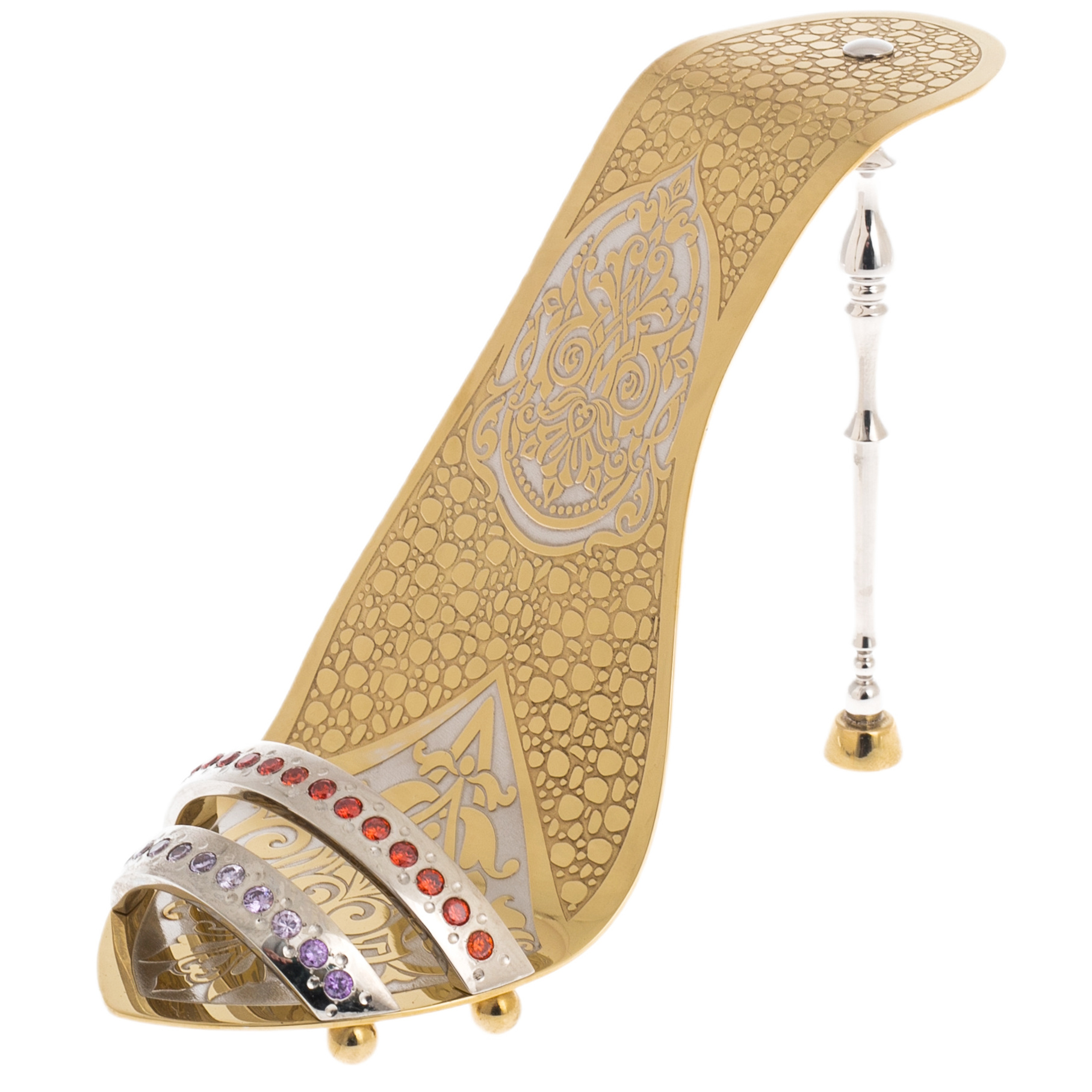 Техника Златоустовской гравюры на стали, применённая при создании этой композиции, требует не только высокой точности, но и тонкого вкуса. На полированную металлическую основу мастер вручную наносит орнамент, а затем с помощью многослойного травления, золочения и никелирования добивается того самого узнаваемого эффекта — когда плоская поверхность будто оживает, переливаясь объёмными узорами. В оформлении подставки использованы элементы восточного орнамента, причудливо вписанные в форму туфли — напоминание о декоративной культуре, где изящное и функциональное сплетаются в единое целое.