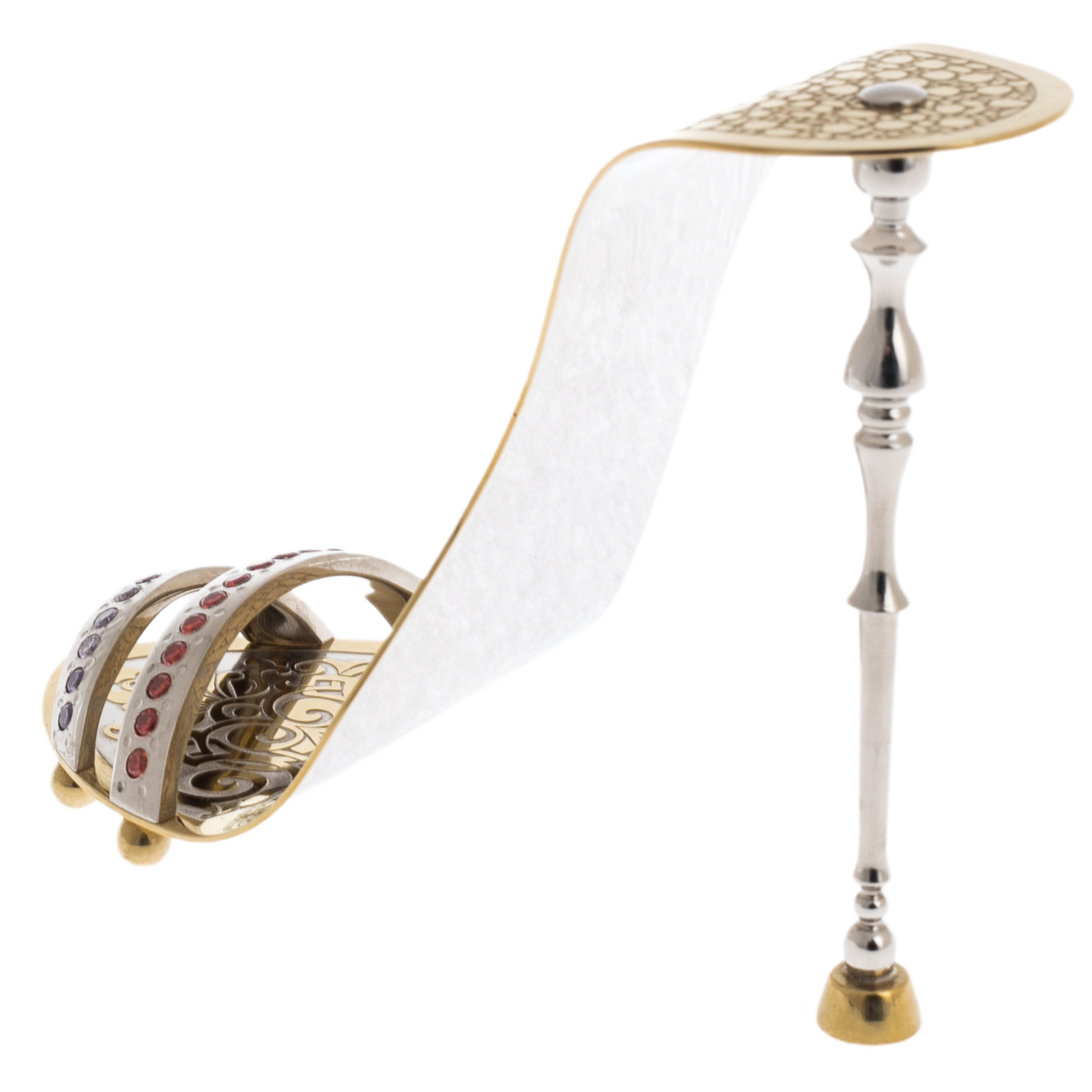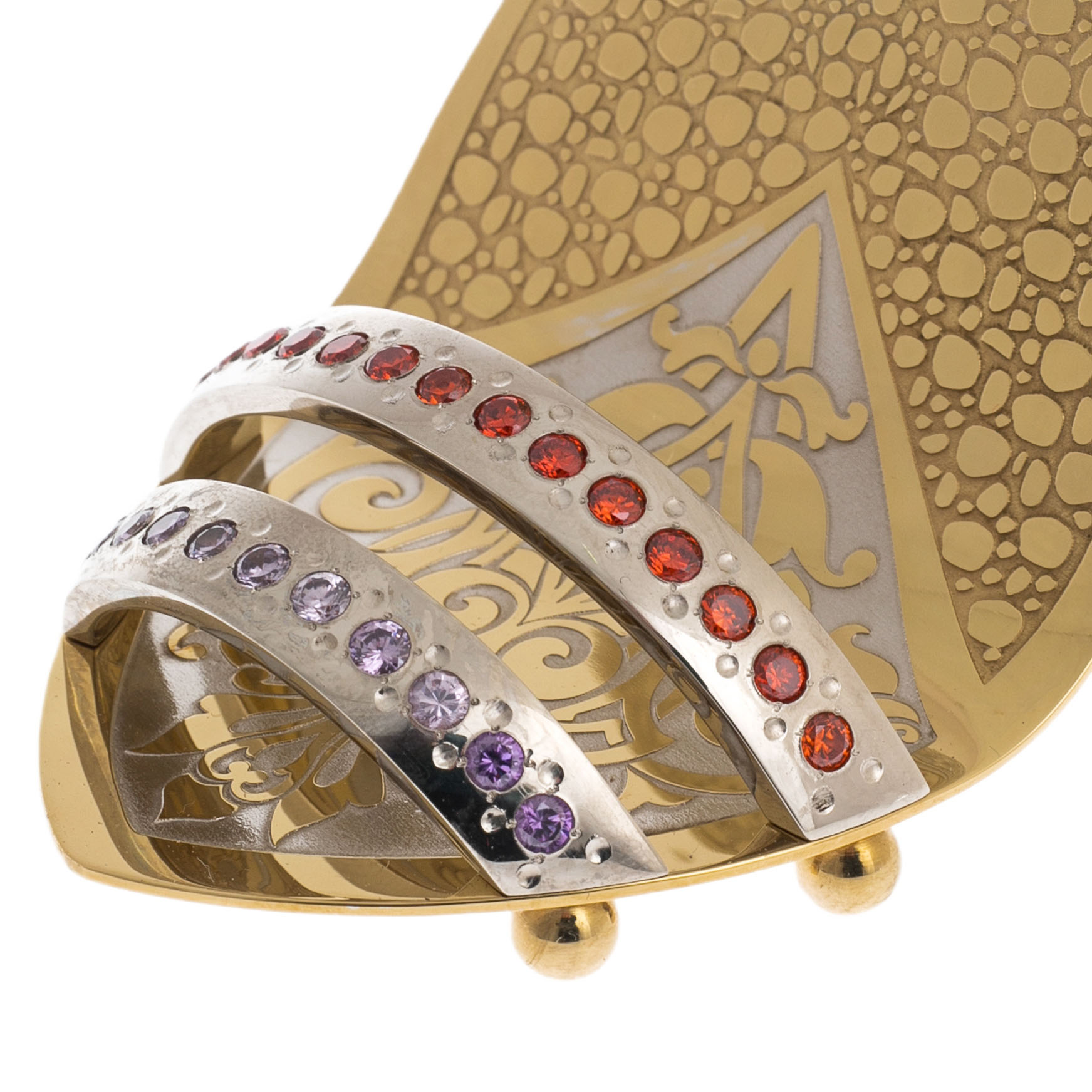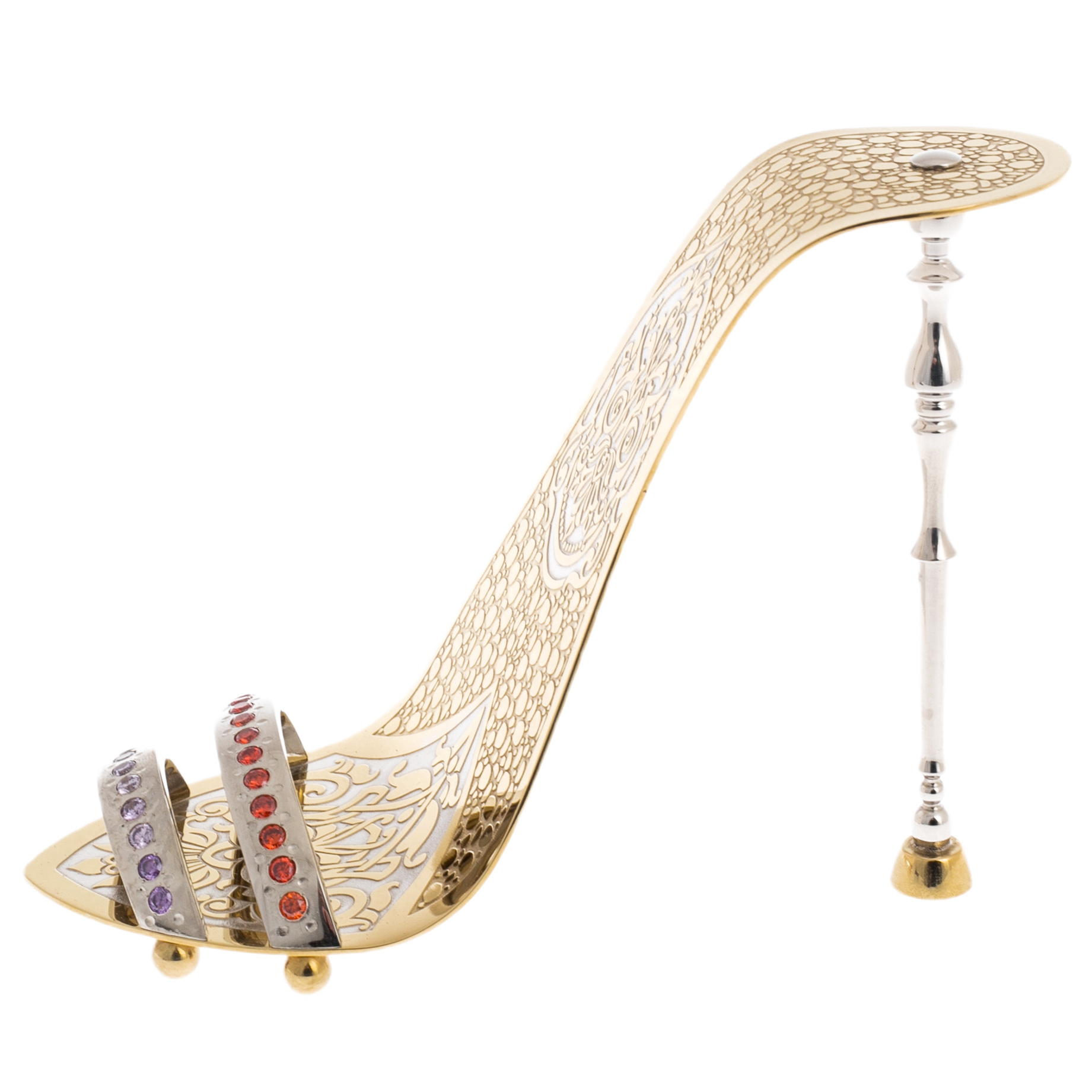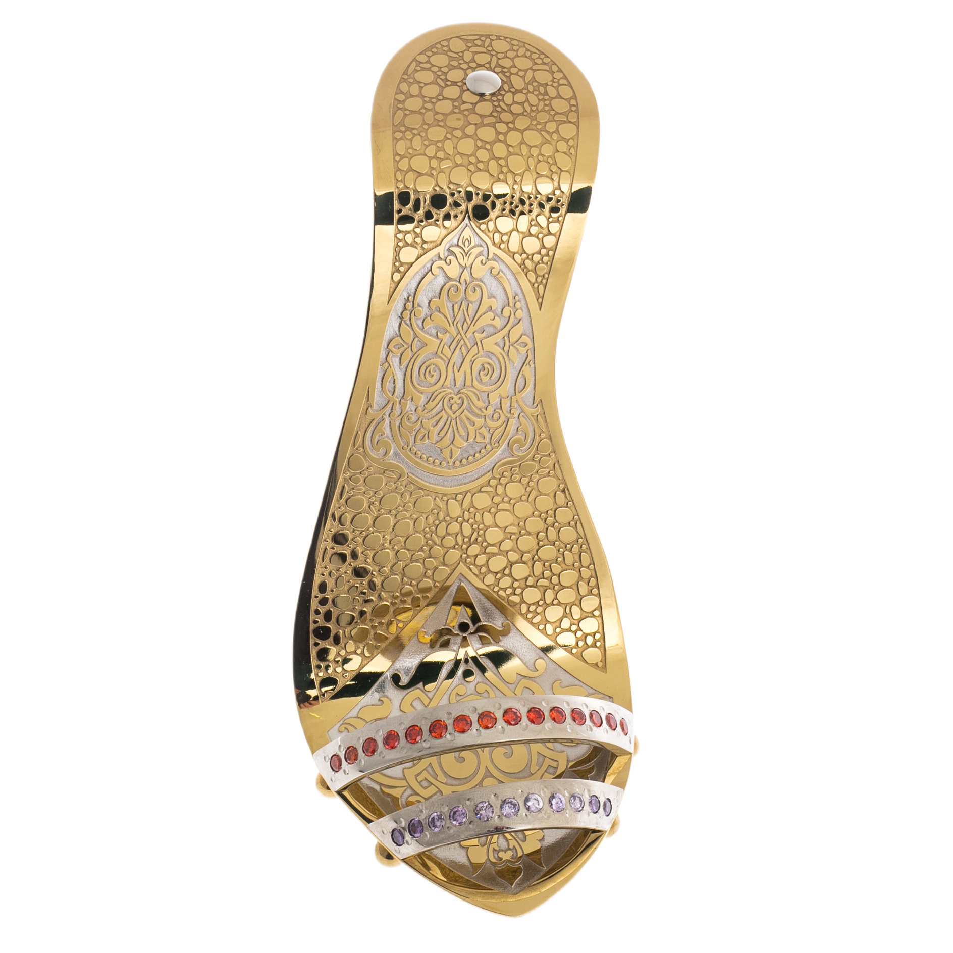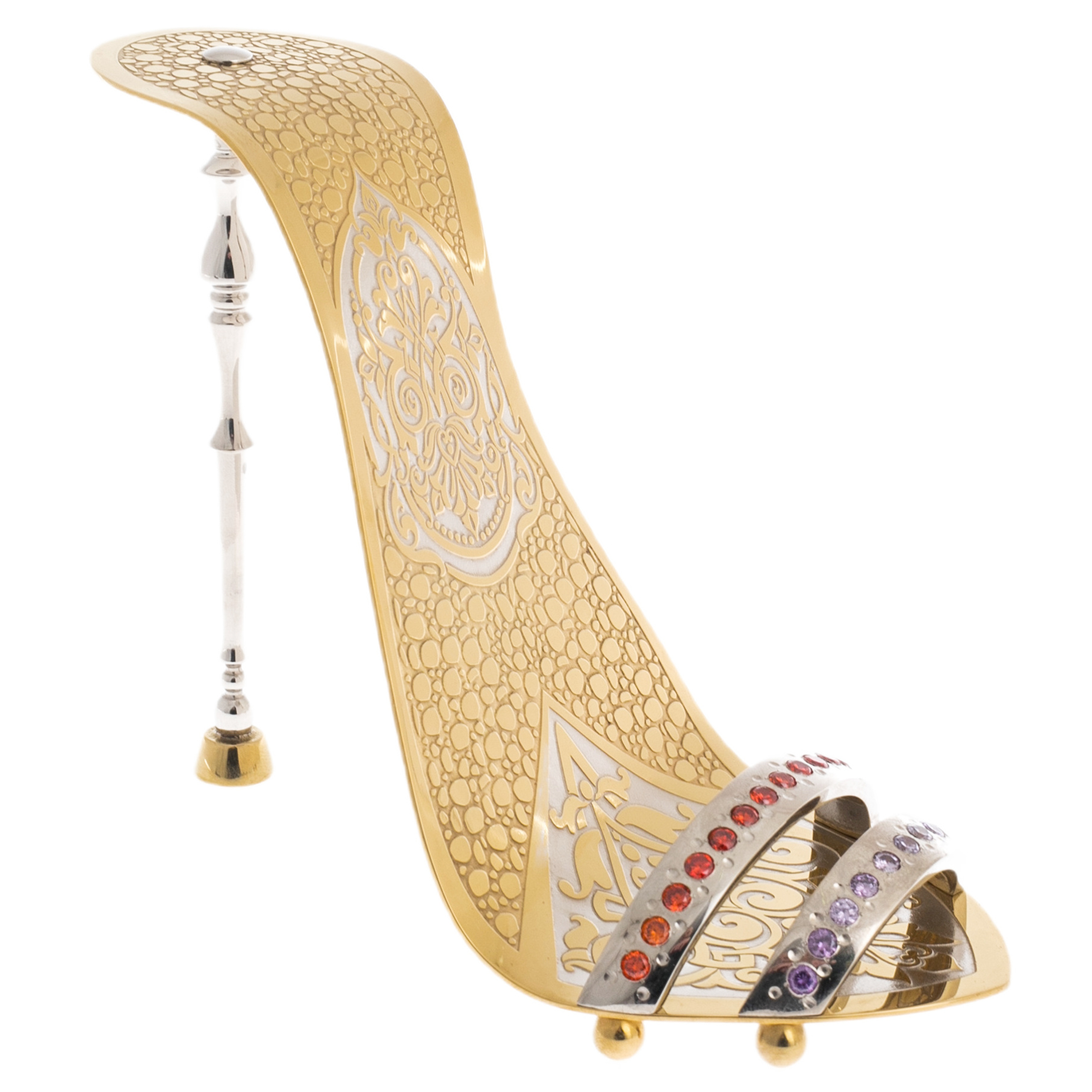 Подставка для телефона, выполненная в виде изящной женской туфли на шпильке, представляет собой не просто утилитарный аксессуар, а художественный объект с характером. Изготовленная из металла, частично покрытого золотом и никелем, она поражает изяществом линий и точностью проработки каждой детали. Ступня опирается на три миниатюрных золотистых шарика, каблук представляет собой точёную серебристую колонну с золотым основанием, а носок украшен тремя диагональными дугами, инкрустированными фианитами — от глубокого аметистового до ярко-рубиново-красного. Поверхность подошвы покрыта сложным орнаментом, сочетающим матовые и зеркальные фрагменты, создающим игру света и тени, как в ювелирном изделии.