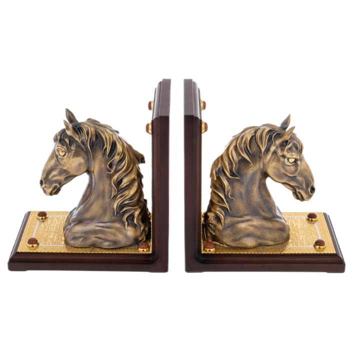 Подставки с образами благородных коней представляют собой изысканный предмет интерьера, созданный мастерами Златоуста для ценителей художественного металла и утончённой символики. Каждая основа выполнена из тёмного дерева глубокого тона, подчёркивающего сияние золочёных пластин с тончайшей гравировкой. На этих пластинах размещены полусферы из декоративного камня, придающие композиции завершённость и особую материальность. Центральным акцентом служат массивные скульптурные головы коней, отлитые из металла и покрытые благородной бронзовой патиной. Скульптуры отличаются выразительной проработкой: фактурная грива, мягко сходящая на шею, внимательный взгляд и мощные линии морды создают ощущение силы, мудрости и движения, едва уловимого в статике композиции.