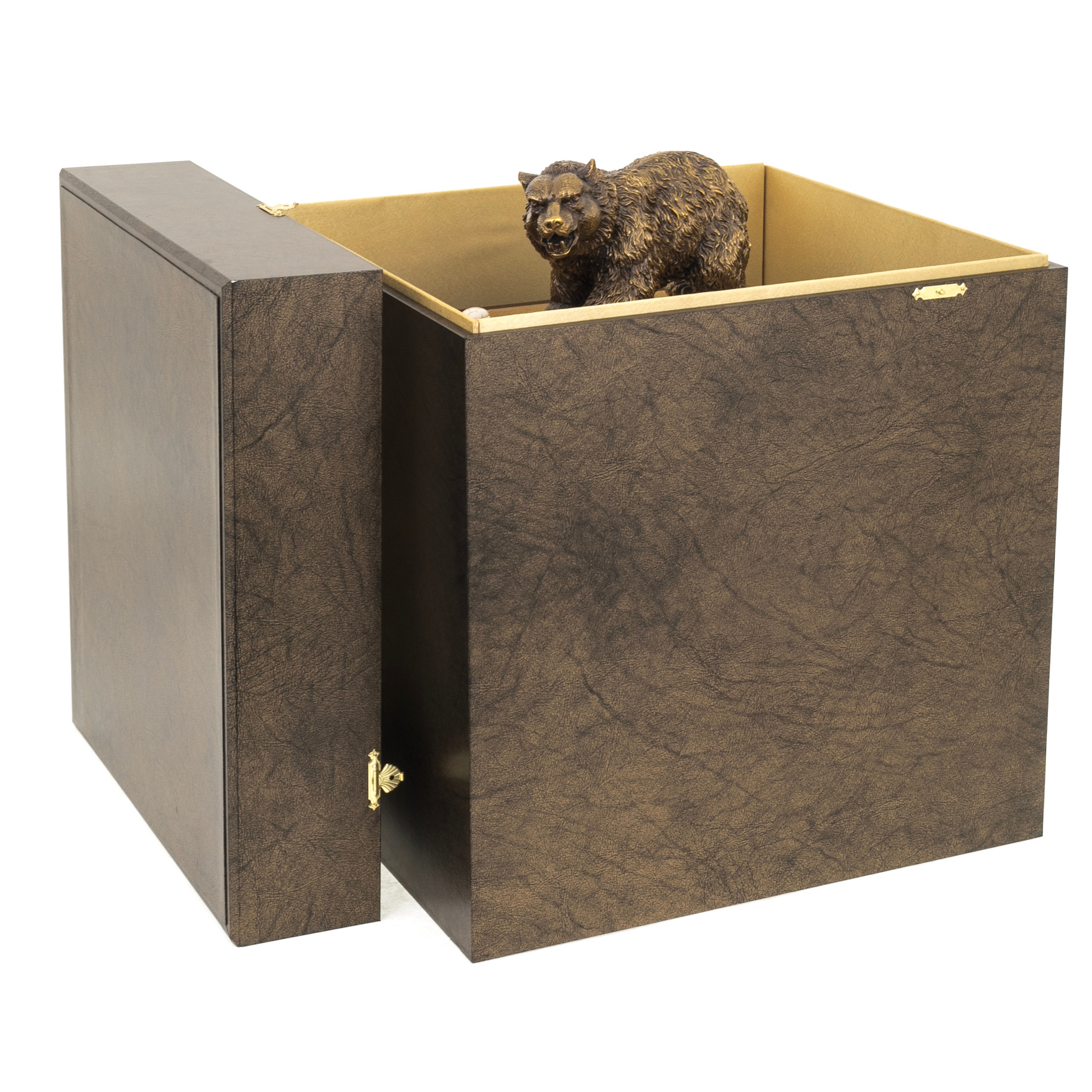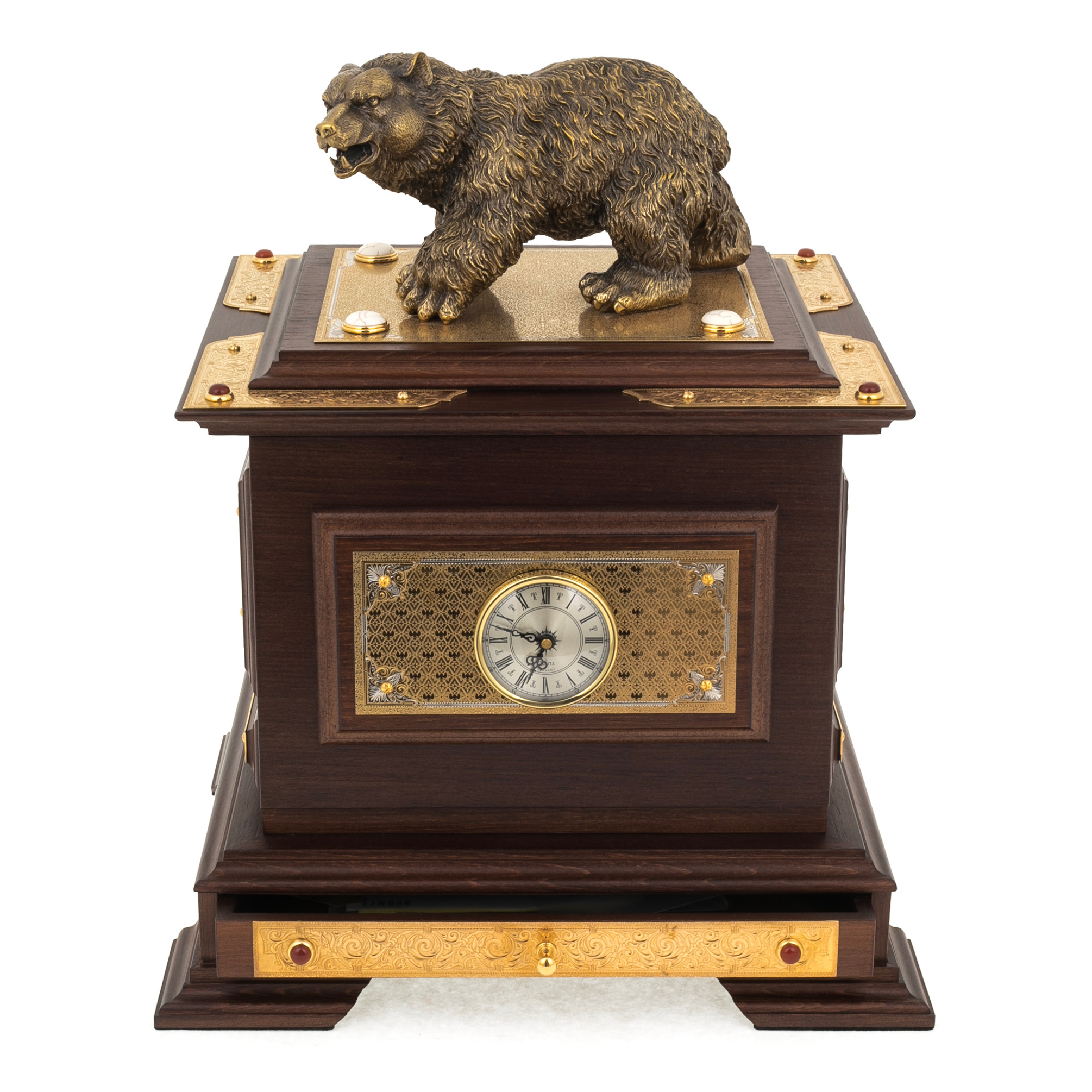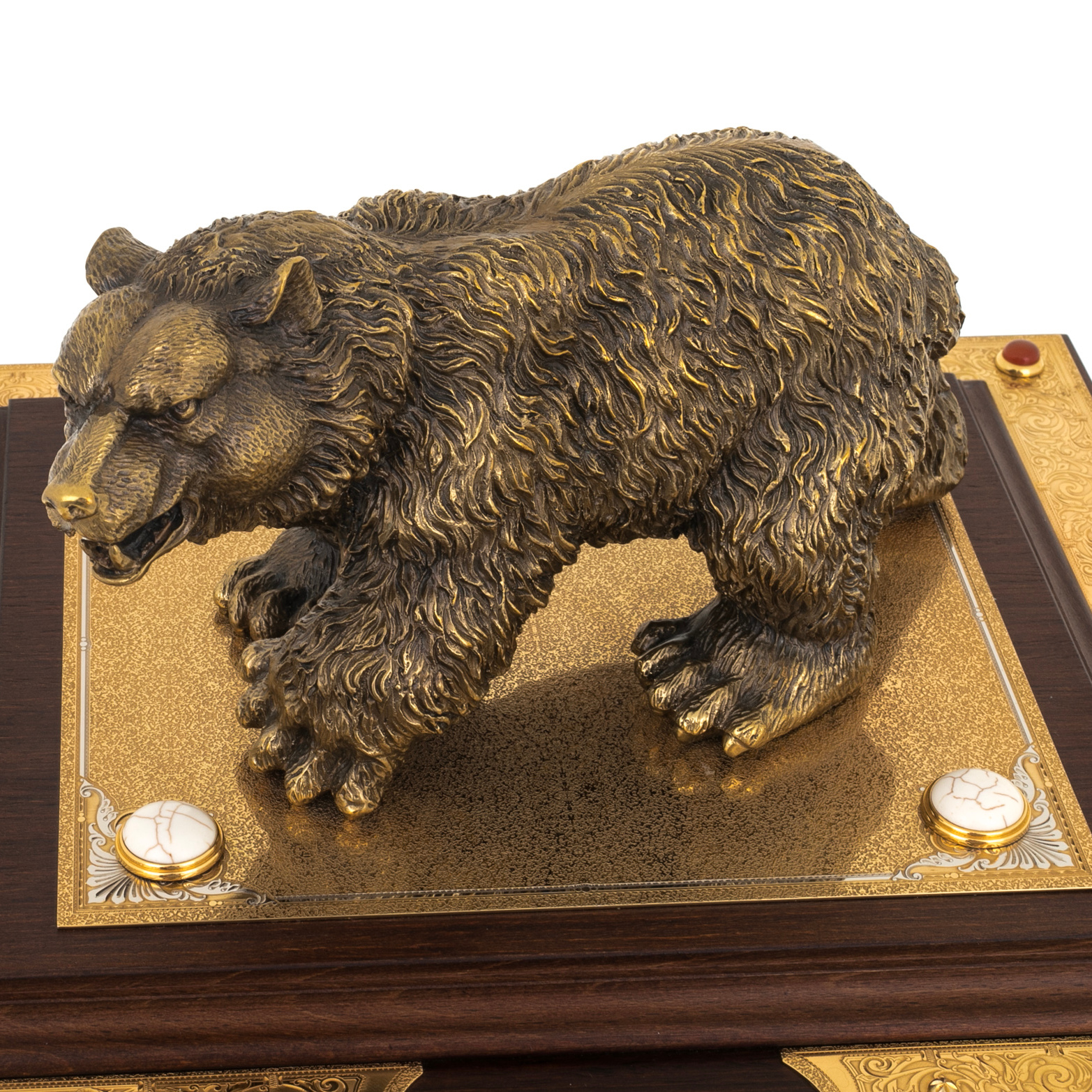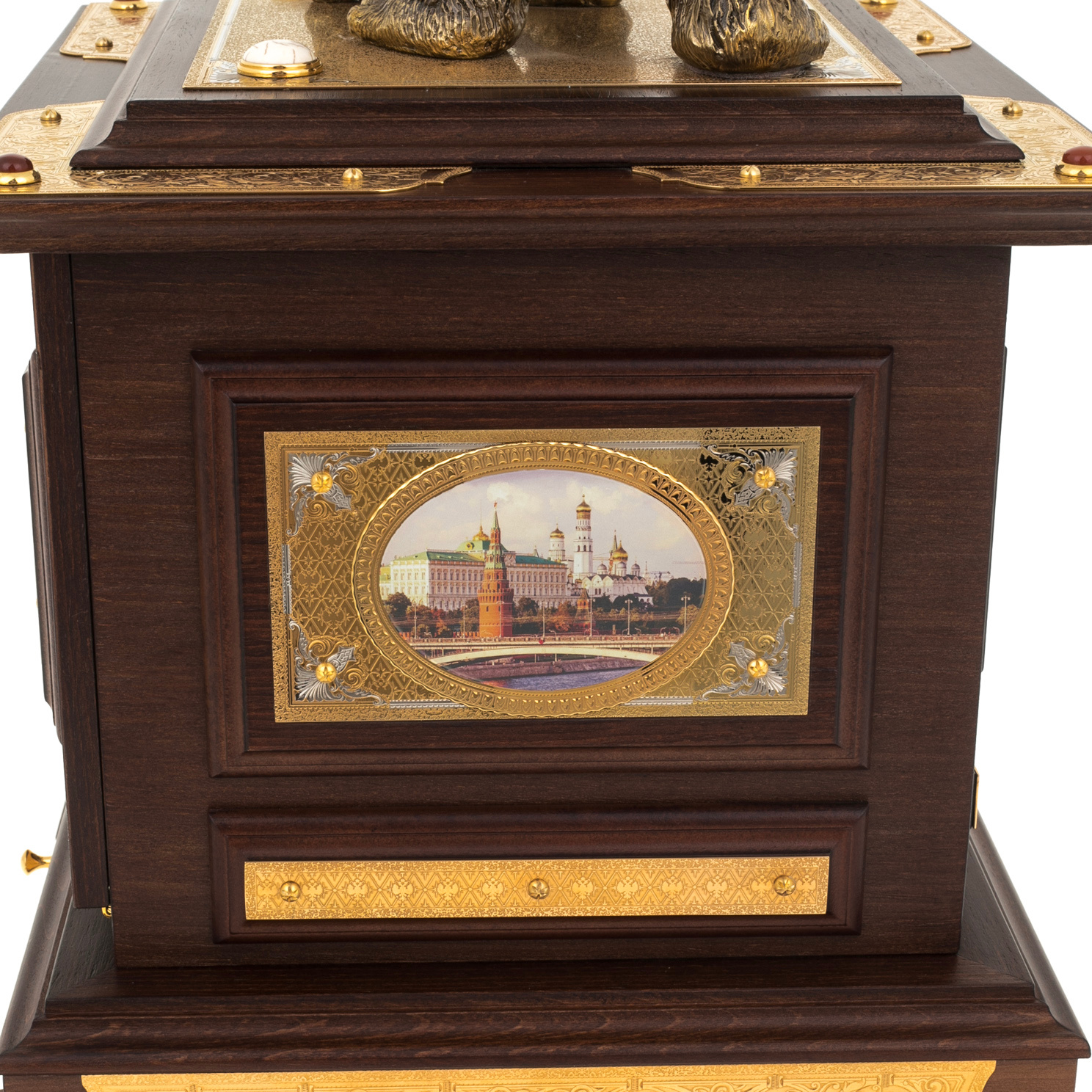 Корпус изготовлен из натурального орехового дерева, вырезанного и отшлифованного вручную. Орех надолго сохранит первозданный цвет, не рассохнется и не испортится от влажности за счёт обработки специальным составом. Золотая вуаль 999 пробы, нанесённая на латунное основание, декорирована гравировкой, вытравленной в печи для придания нужного объёма. Венчает сейф фигура разъярённого медведя, выполненного из бронзы, - символ величия и силы. Верхнюю часть украшают 4 камня тигровый глаз молочного оттенка, выгодно гармонирующие с золотом и деревом.
