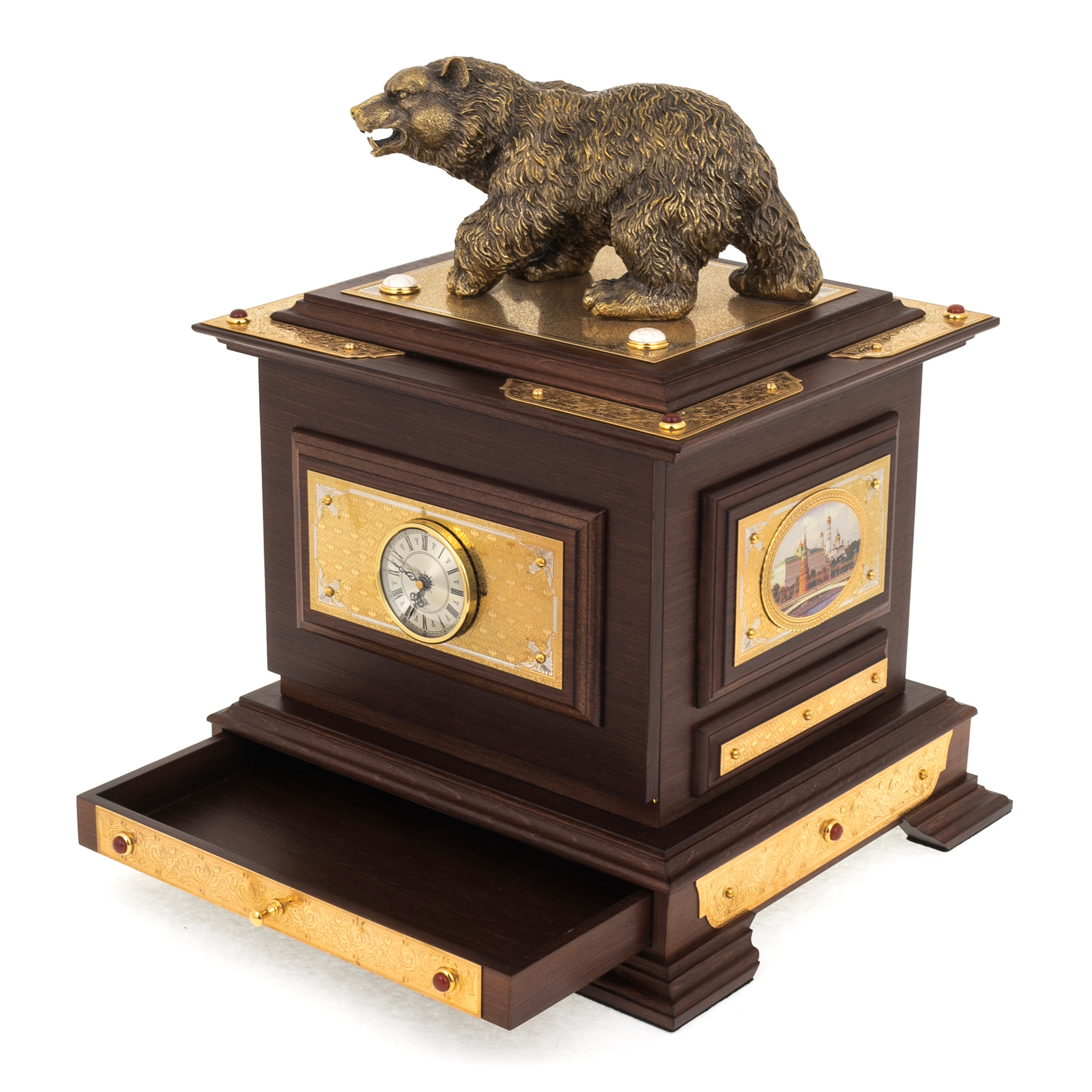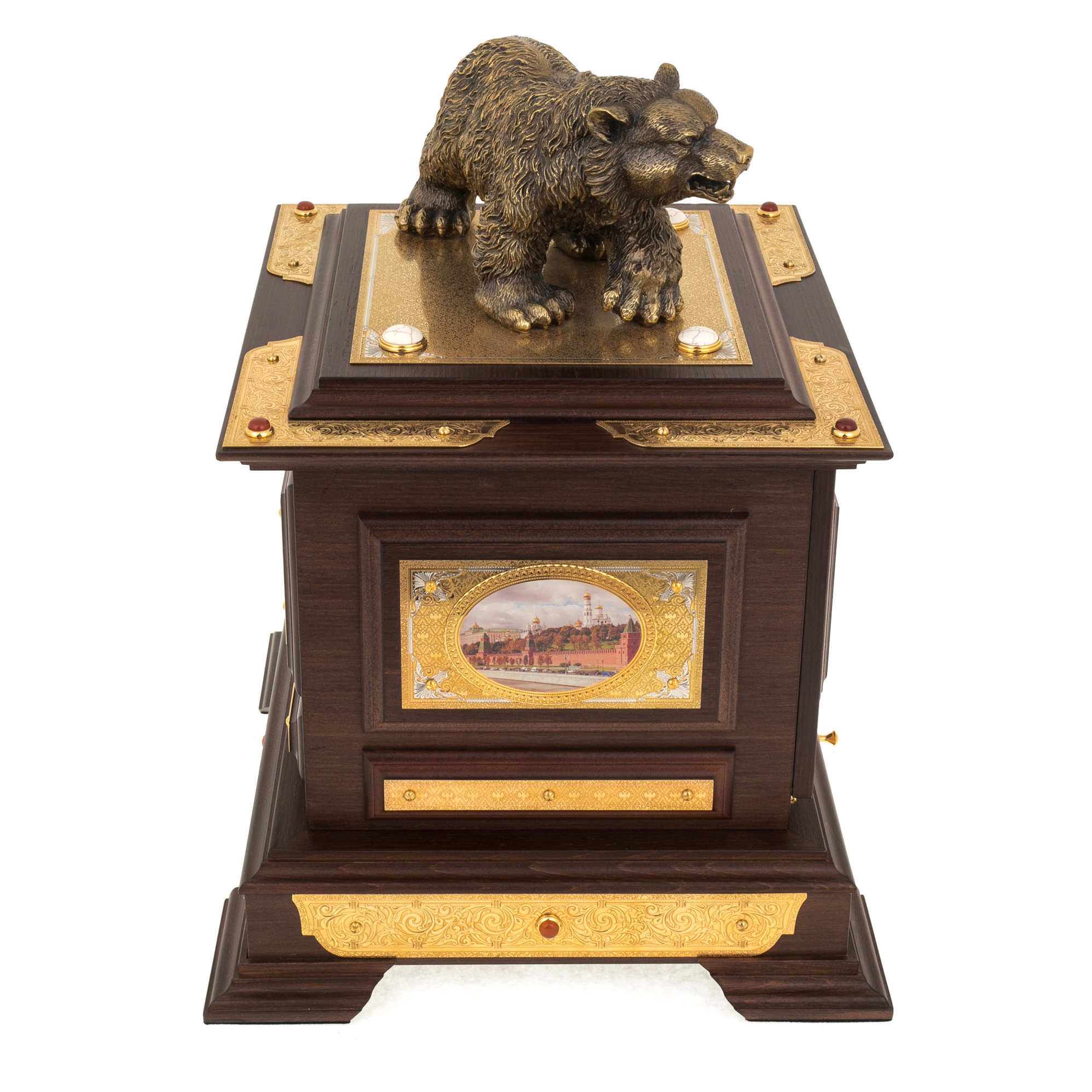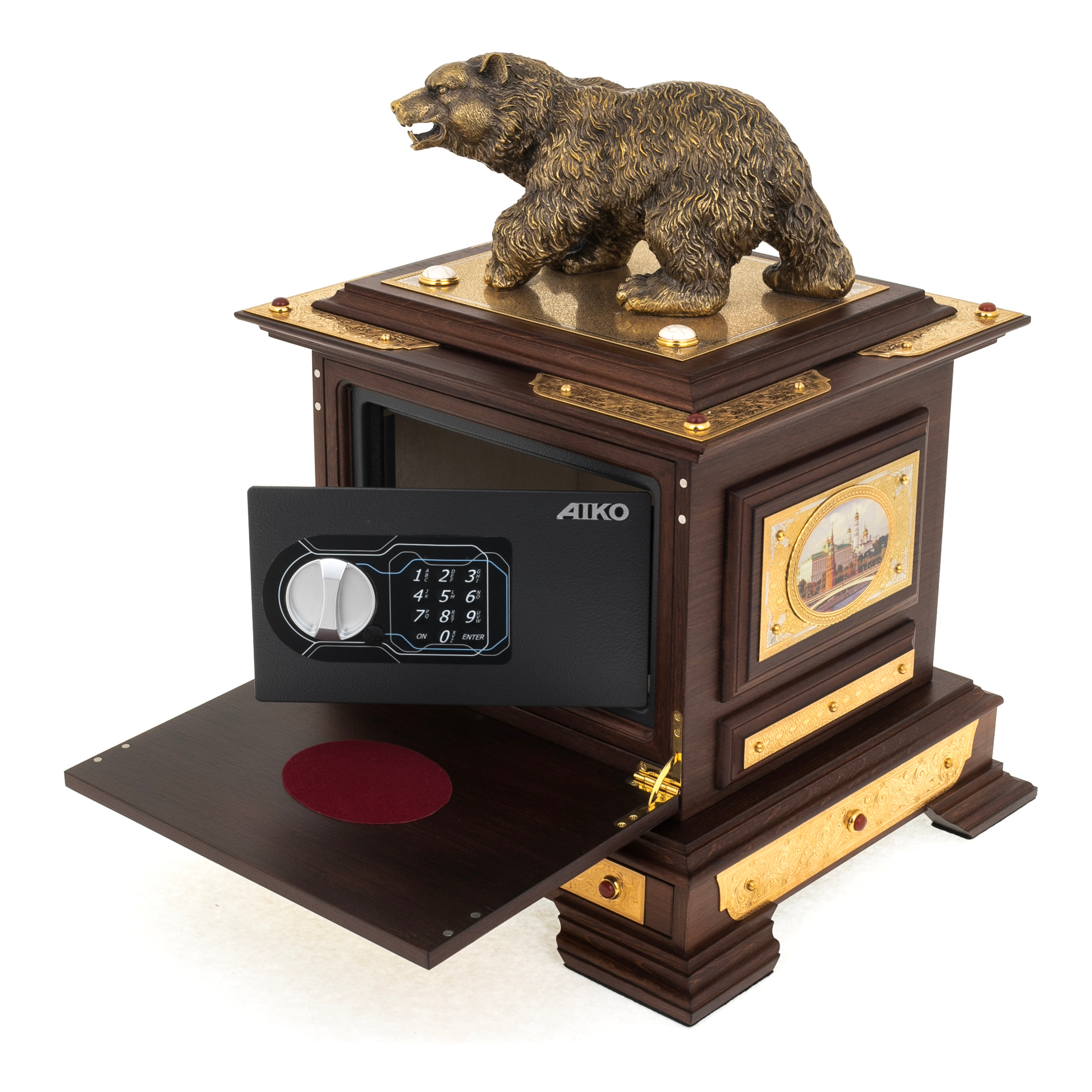 Оружейный сейф “Медведь” - полезный сувенир ручной работы для коллекционеров оружия и любителей дизайнерских сейфов для хранения полезных мелочей. Златоустовские мастера знают толк в создании эксклюзивных сувениров, украшенных филигранной гравировкой по золоту. Сейф инкрустирован драгоценными камнями. Особый характер ему придаёт бронзовая мини-скульптура медведя и великолепные виды московского кремля, выполненные цветными глазурями.