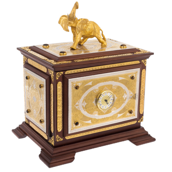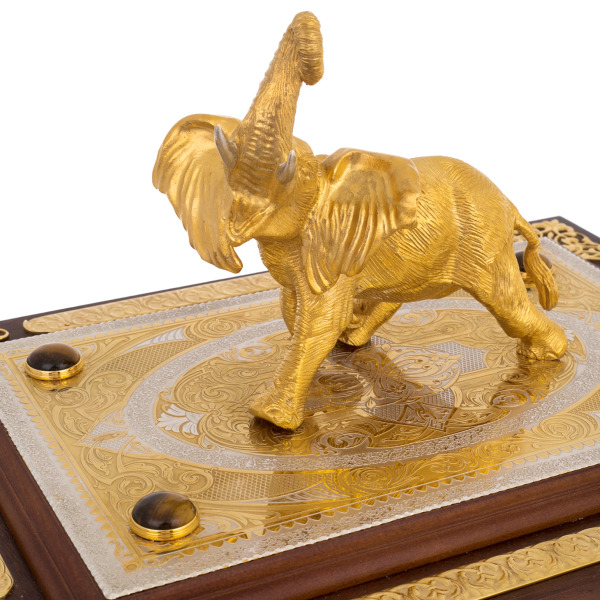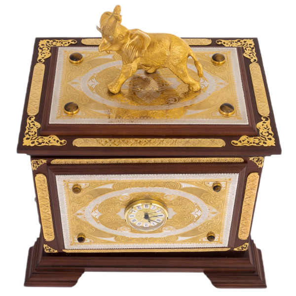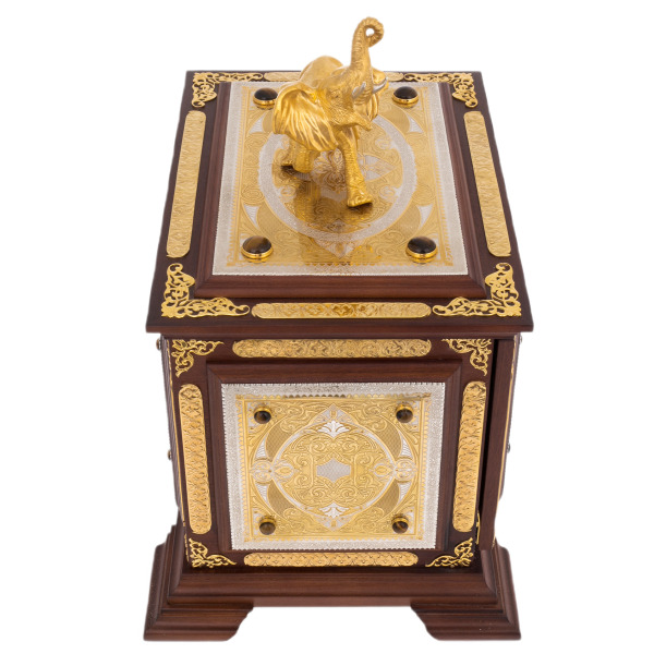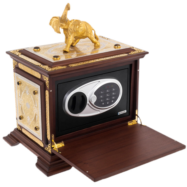 Сейф «Денежный слон» — предмет, в котором надёжность сочетается с ритуальной эстетикой, а практическая функция маскируется под изысканный арт-объект. Внешне он напоминает редкий экспонат из коллекции антиквара: корпус из благородного дерева венчает скульптура слона — символа богатства, стабильности и уверенного движения вперёд. Фигура, выполненная из металла с покрытием золотом, излучает благородное сияние, а инкрустации тигровым глазом добавляют изделию глубину и мистический ореол. Этот камень с древности считался талисманом, привлекающим деньги и охраняющим от неудач — его вкрапления подчеркивают сакральный смысл сейфа.