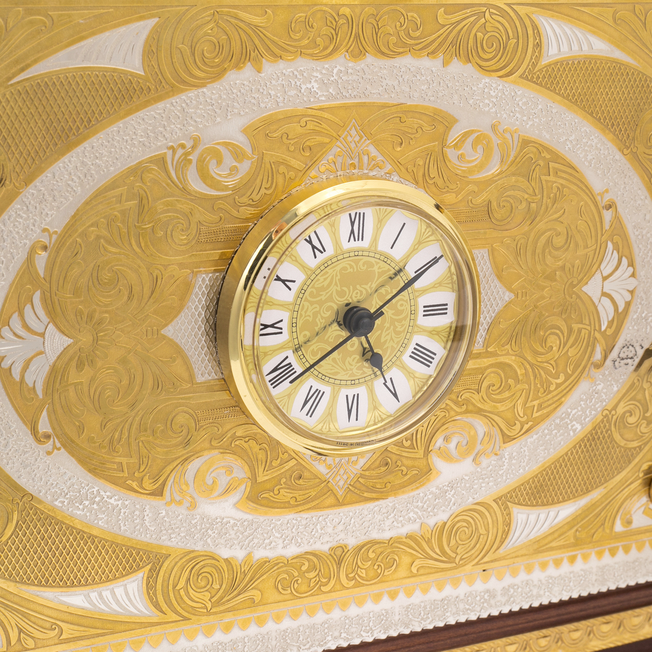 Фасады украшены панелями, выполненными в златоустовской технике. Это искусство гравировки и золочения зародилось на Урале в начале XIX века и до сих пор остаётся символом высочайшего ремесленного мастерства. Орнамент наносится вручную, проходят этапы травления, штихельной гравировки, позолоты и серебрения, что в итоге рождает многослойное сияющее покрытие с удивительной глубиной фактуры. Каждый завиток, каждый штрих — не просто украшение, а часть общей философии предмета, задающего пространство вокруг себя. В центре передней панели — часовой циферблат с римской разметкой, добавляющий времени материальное измерение.