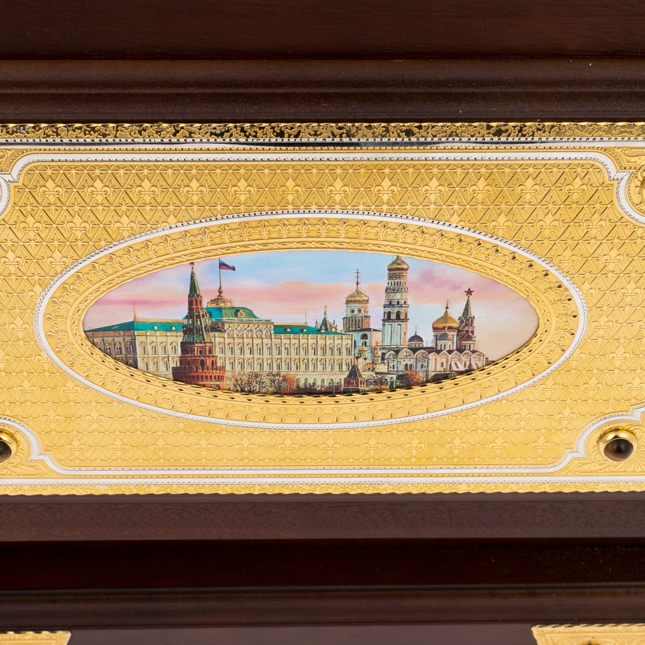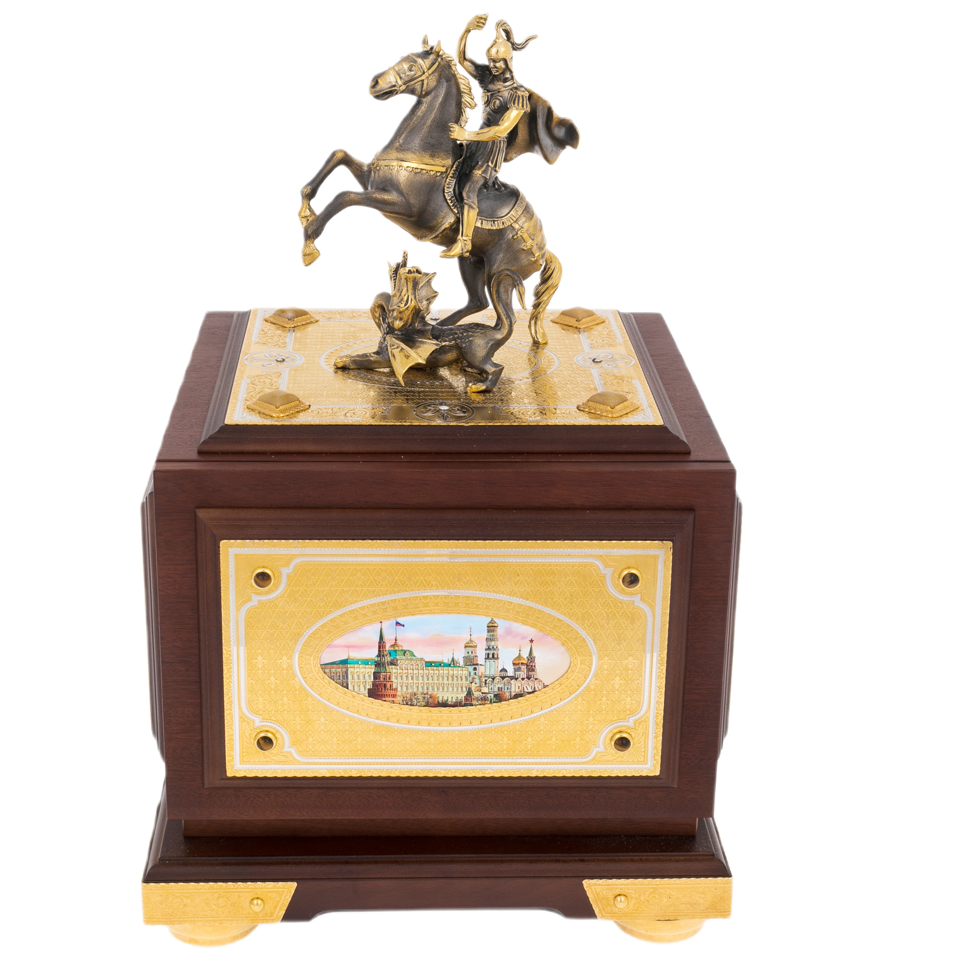 Сейф «Георгий Победоносец» из Златоуста представляет собой уникальное сочетание утилитарной надежности и высокого искусства. Корпус выполнен из ценных пород дерева, украшен декоративными панелями с золочением и тончайшей гравировкой. На лицевой части помещено красочное изображение московского Кремля, заключённое в овальную рамку из золота, — символ величия и исторической преемственности. Подобные детали превращают сейф в предмет коллекционного уровня, возвышающийся над обычными представлениями о функциональности.