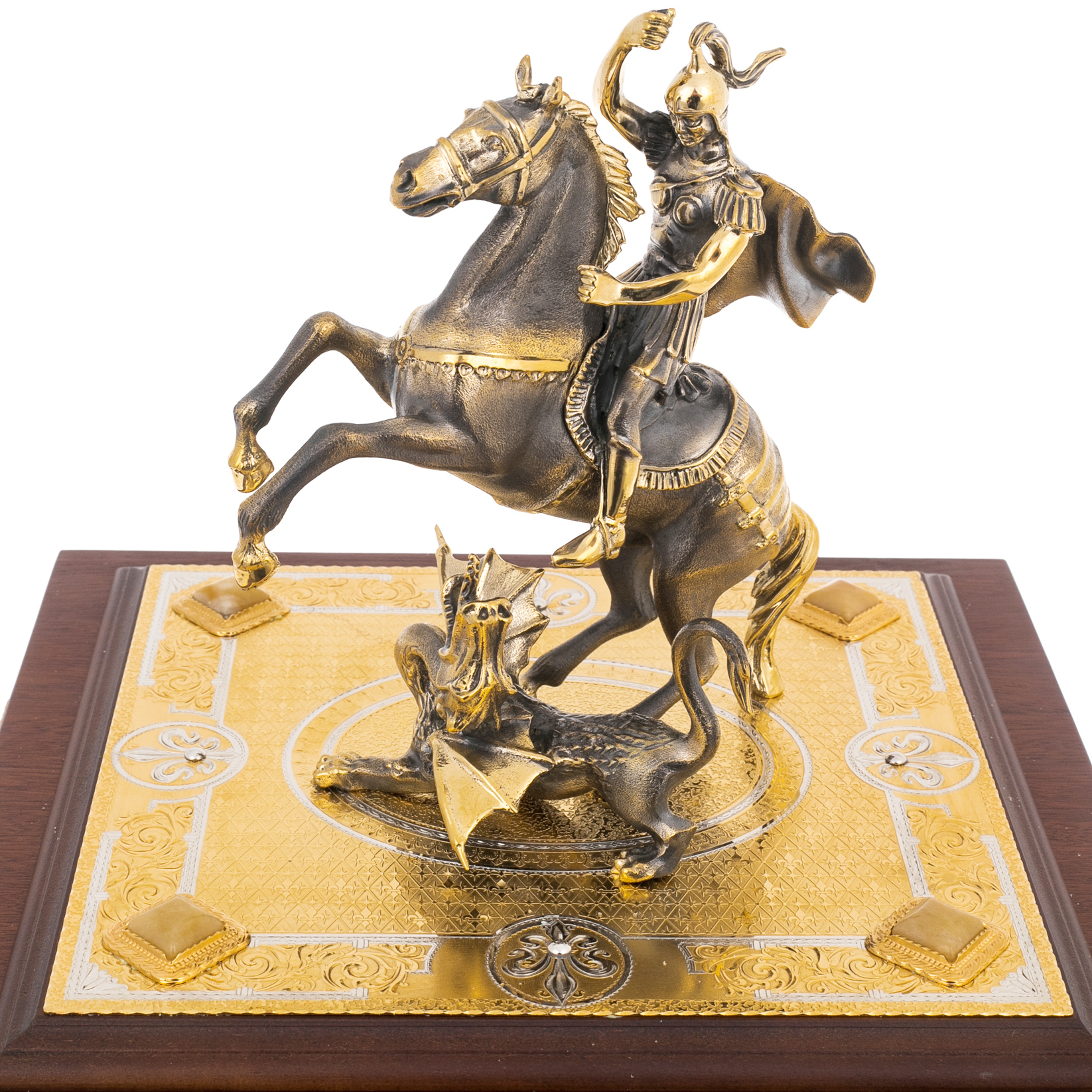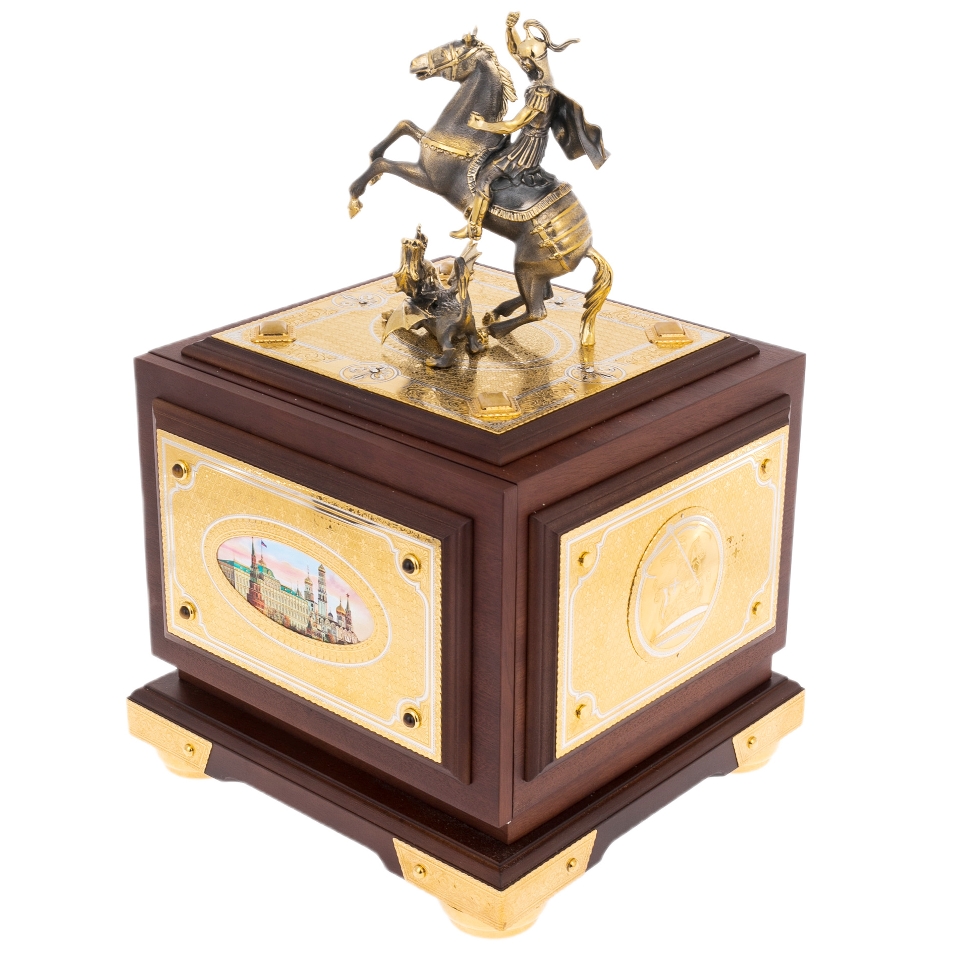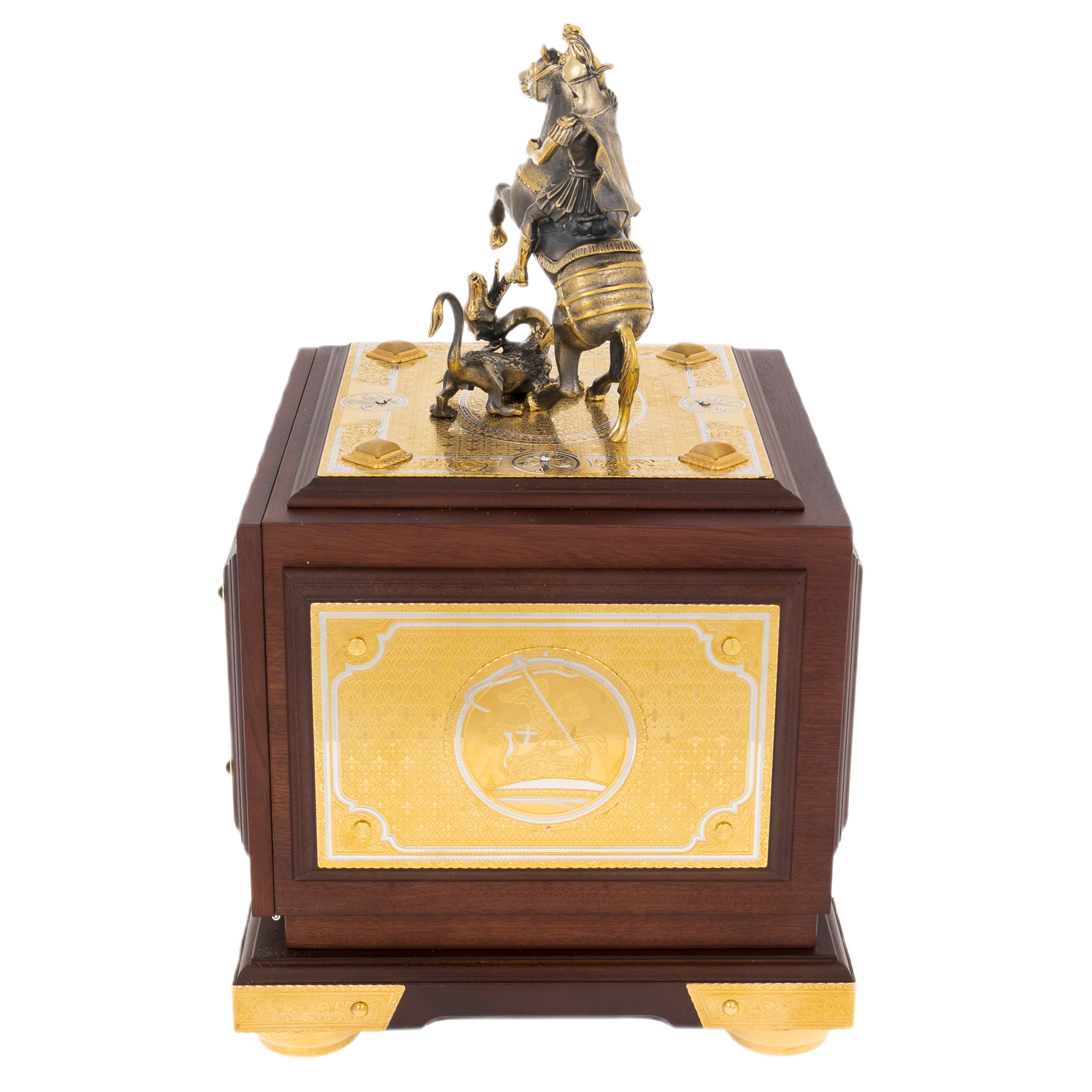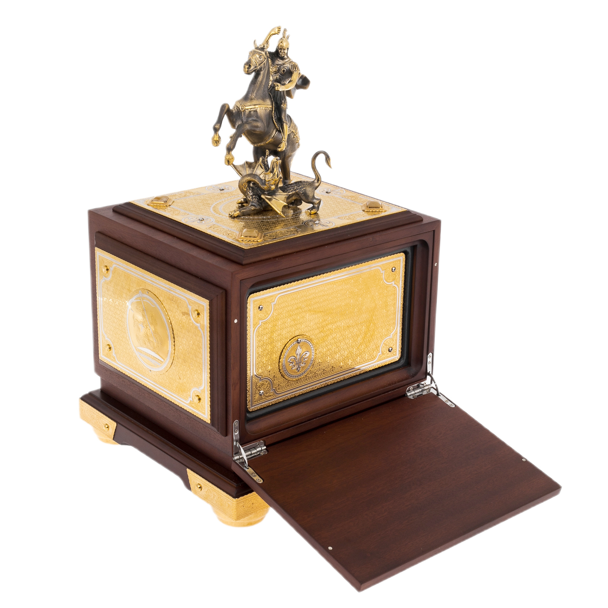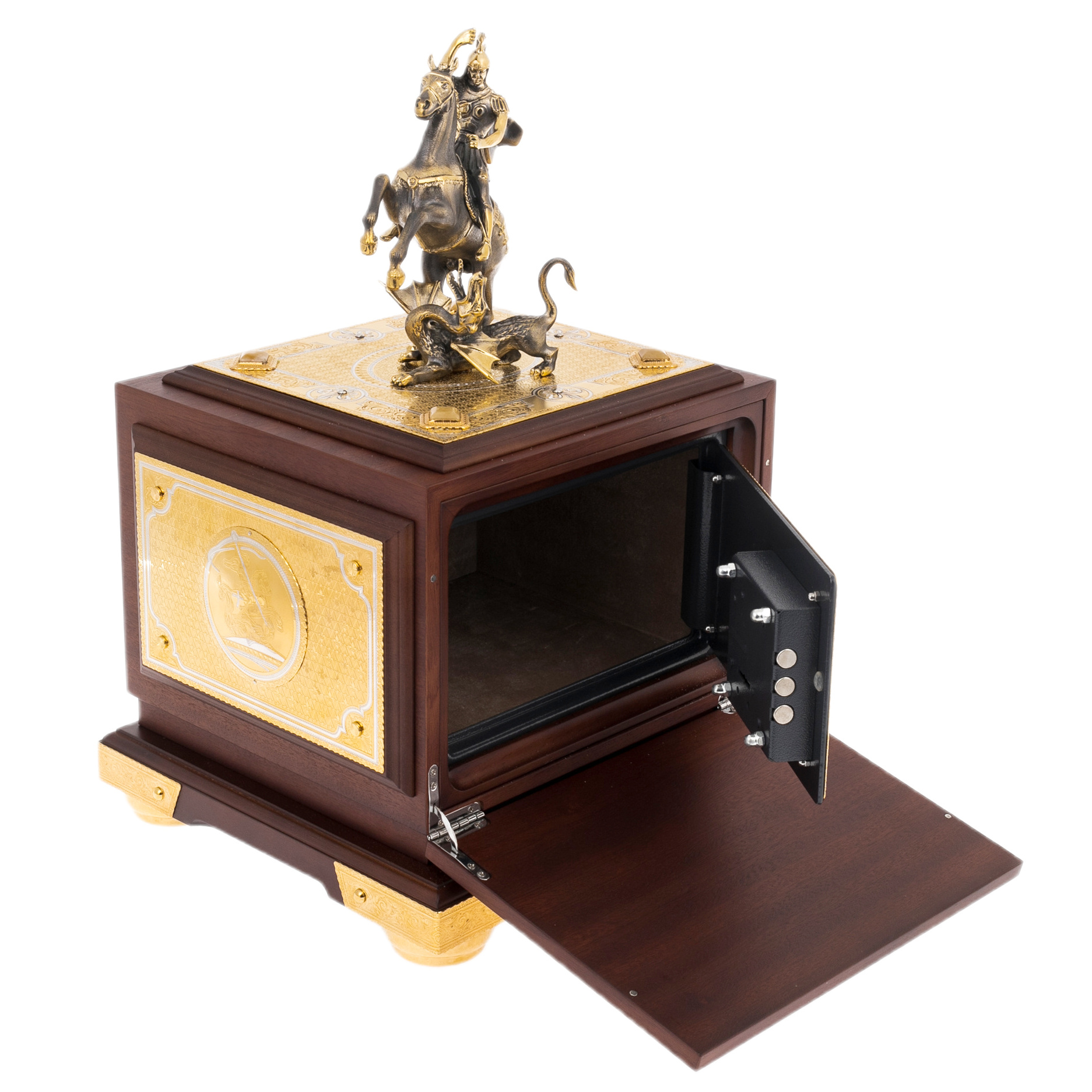 Главный акцент композиции — скульптура Святого Георгия Победоносца, венчающая сейф. Фигура воина на вставшем на дыбы коне поражает динамикой: копьё устремлено в поверженного дракона, символизирующего зло и хаос. Образ исполнен в бронзе с позолотой, каждая деталь — от складок плаща до фактуры чешуи чудовища — проработана с филигранной точностью. Такая скульптура не только украшает сейф, но и придаёт ему глубокое символическое звучание — защиту, торжество добра и непоколебимость воли.