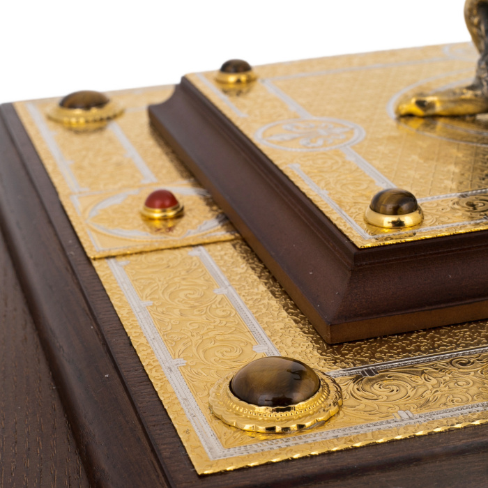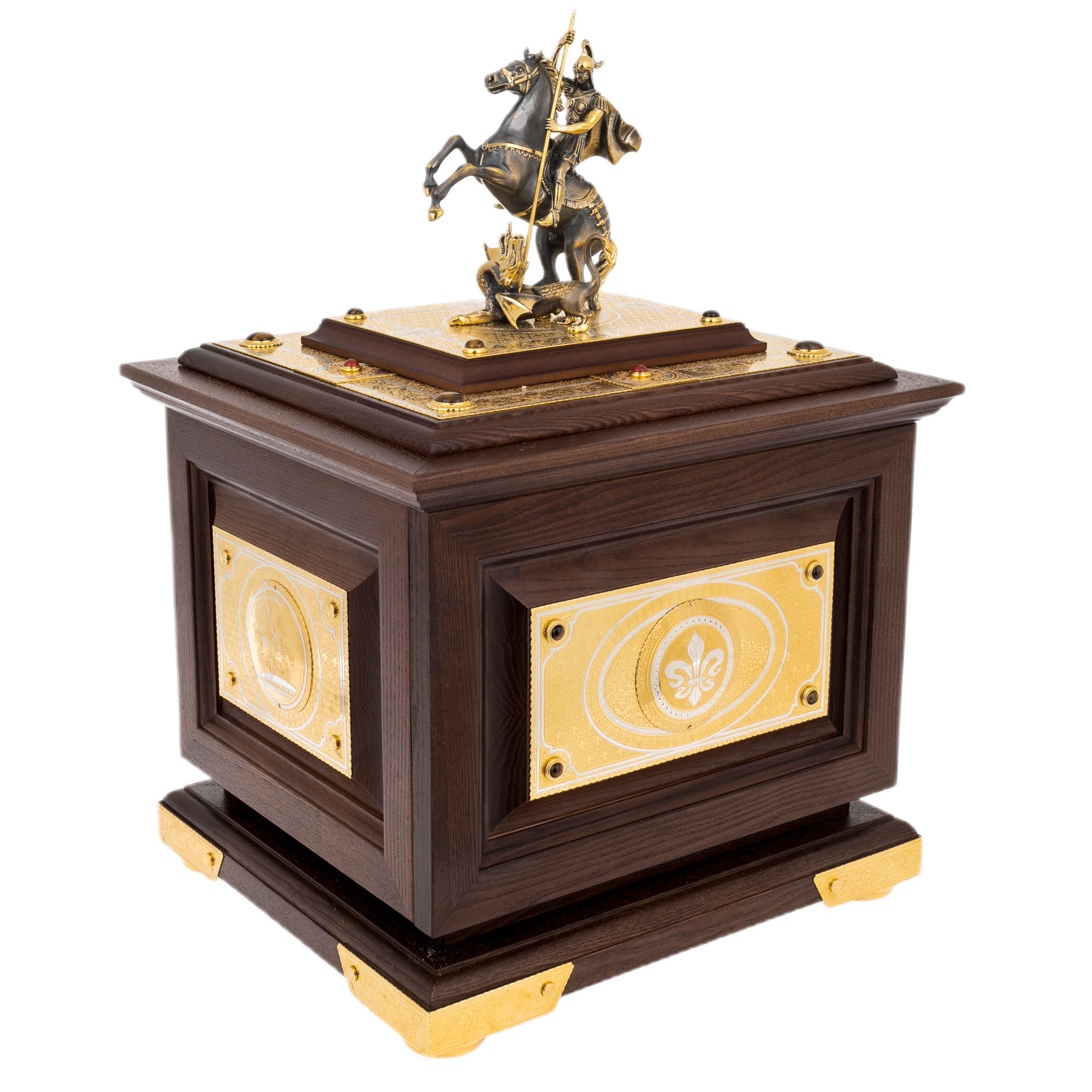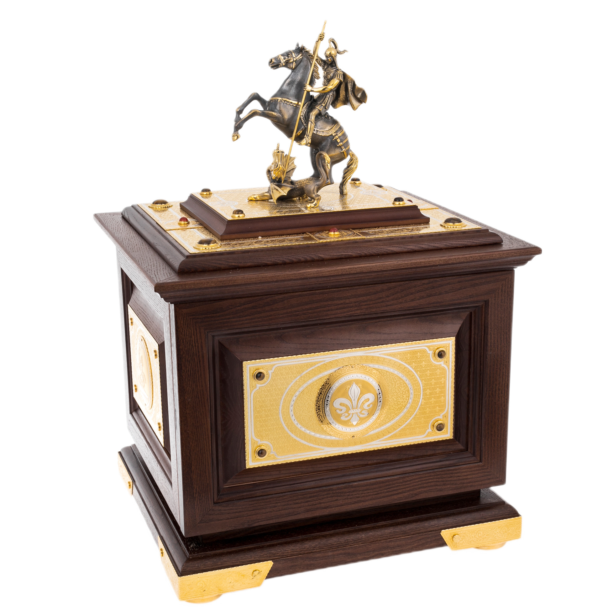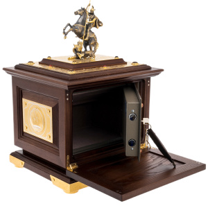 Это парадный сейф, созданный как предмет статусного интерьера и символ личной власти. Корпус выполнен из тёмного массива с выраженной древесной текстурой, обрамляющей массивные панели с глубоким золотым тиснением и тонкой гравировкой. Каждая пластина фиксируется декоративными винтами-капителями, подчёркивающими монументальность формы. Композицию венчает скульптура Георгия Победоносца, выполненная в комбинации тёплого золота и холодного металла: вздыбившийся конь, летящая накидка, копьё, пронзающее дракона, – вся сцена создана с редкой пластической выразительностью и ощущением победной силы.