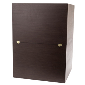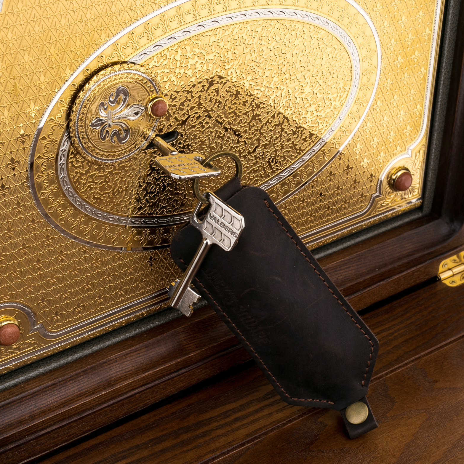 Внутренняя конструкция скрыта за откидной деревянной дверцей, аккуратно закреплённой на прочных мебельных петлях с позолоченными накладками. За ней помещён полноценный металлический сейф с двойным запирающим механизмом и мягкой обивкой стенок. Ключ украшен кожаным брелоком с ручной прошивкой — небольшой штрих, усиливающий ощущение прикосновения к по-настоящему штучной вещи. Все металлические детали обработаны в технике златоустовской гравюры с использованием золочения и никелирования, создающими сложный рельеф и игру света.