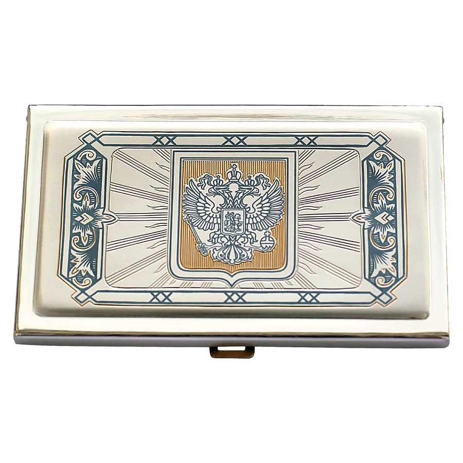 Визитница "Герб России" выполнена из серебра 925 пробы изготовлен мастерами великоустюгского завода «Северная чернь». Сплавы, содержащиеся в пробе, придают изделию прочность и защиту от механических повреждений.
