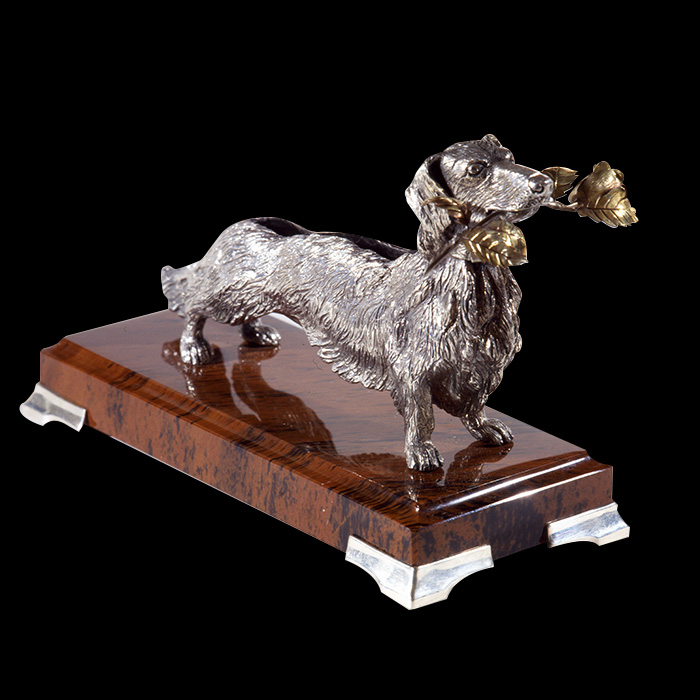 Оригинальная визитница "Такса с розой" выполнена из серебра 925 пробы в сочетании с камнем нефрит.