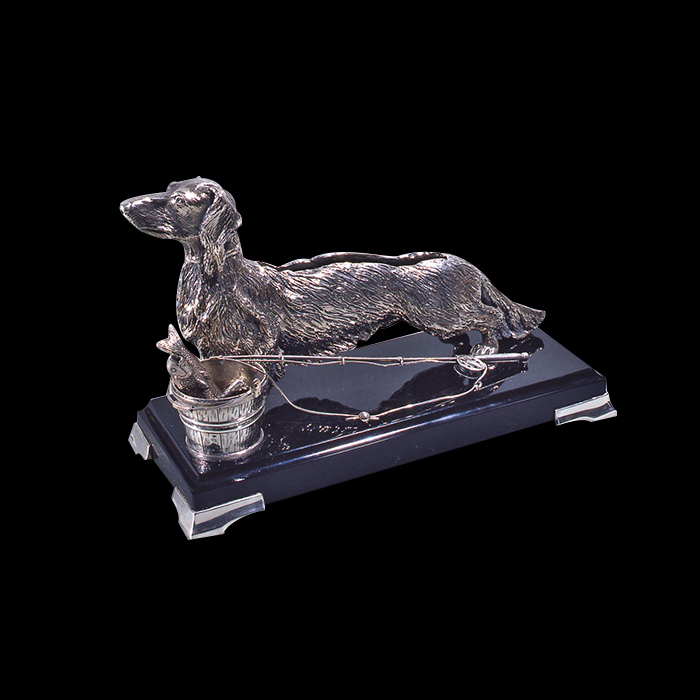 Оригинальная визитница "Такса с удочкой" выполнена из серебра 925 пробы в сочетании с камнем обсидиан.