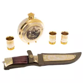 Набор охотничий на подставке "Охота на кабана" на 3 персоны, Златоуст Набор охотничий на подставке "Охота на кабана" на 3 персоны, Златоуст Набор "Охота на кабана" — исключительный по выразительности и содержанию подарок, достойный самого взыскательного охотника и знатока русского оружейного искусства. Центральное место занимает массивный сувенирный нож с клинком из дамасской стали, украшенным гравировкой с позолотой. Рукоять выполнена из стабилизированной древесины с живописным розово-рубиновым отливом, дополненной литым навершием в форме головы медведя — символа мужества и доминирования. Сцену охоты воссоздает изящная композиция на черном мраморе: охотник с ружьём, его верный пёс и врывающийся в кадр кабан, будто вынырнувший из лесной чащи. Все фигуры отлиты из латуни и патинированы вручную, подчёркивая детали и пластику движений. В златоустовской традиции каждая деталь не просто оформлена — она несёт глубокую символику. Известная с XIX века техника сочетания дамаска, гравировки, никелирования и золочения развивалась в стенах мастерских, создававших оружие для царской семьи. В этом наборе золотое травление по лезвию демонстрирует филигранную работу, создавая визуальную игру света и тени. Барельефная отделка стопок из латуни, покрытых никелем и золотом, повторяет флоральные орнаменты, характерные для имперской эстетики. Каждая стопка — не просто элемент сервировки, а произведение прикладного искусства, в которое вложено столько же мастерства, сколько в клинок. Этот набор предназначен для настоящих ценителей охоты и предметов с характером — мужчин, способных оценить вещь не только как аксессуар, но как историю. Для тех, чьи вкусы формировались не торопливыми ужинами, а в гуще жизни, среди елей, выстрелов и ожидания. Подобный подарок вызывает не мимолётное восхищение, а подлинное уважение, поскольку говорит о силе, вкусе и понимании традиции.