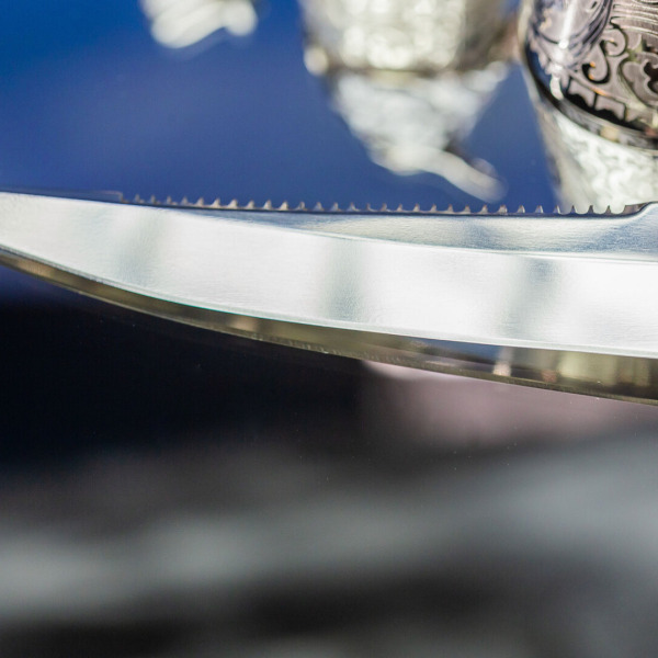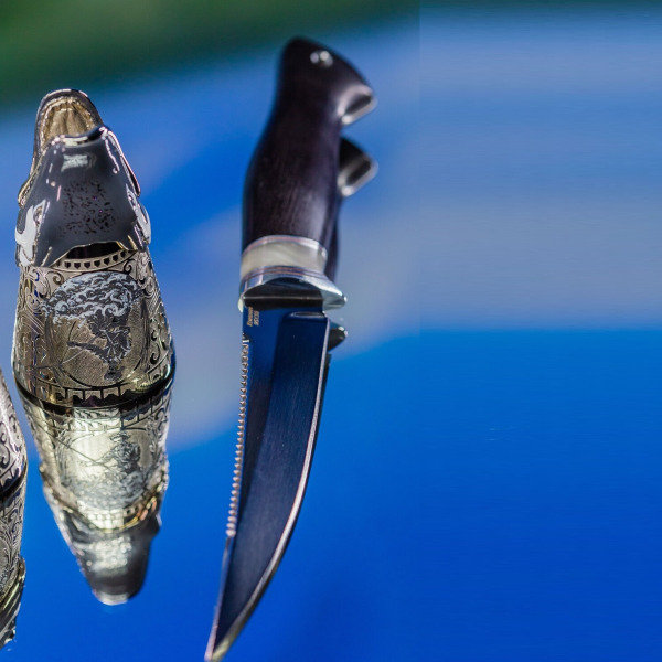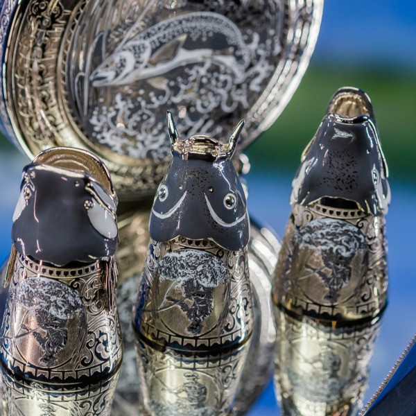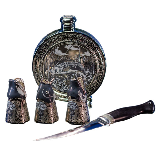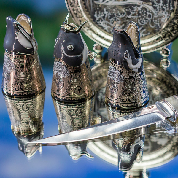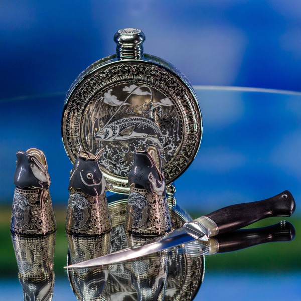 Три рюмки в виде рыбных голов — это ода природной силе и мудрости. Окружённые детализированными гравировками, они символизируют тесную связь человека с природой. Изображения на этих рюмках передают древнее знание о том, что добыча уважает охотника, а охотник уважает свою добычу. Завершает образ нож с рукоятью из дерева, который сам по себе — произведение искусства. Его лезвие блестит, как лунный свет над зеркальной гладью воды; оно готово пронзить тьму и открыть путь к новой добыче.