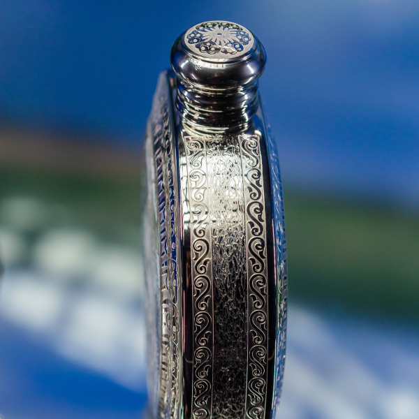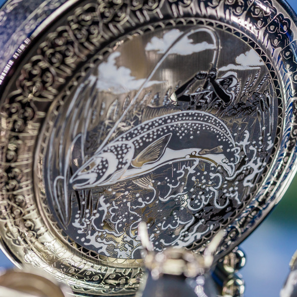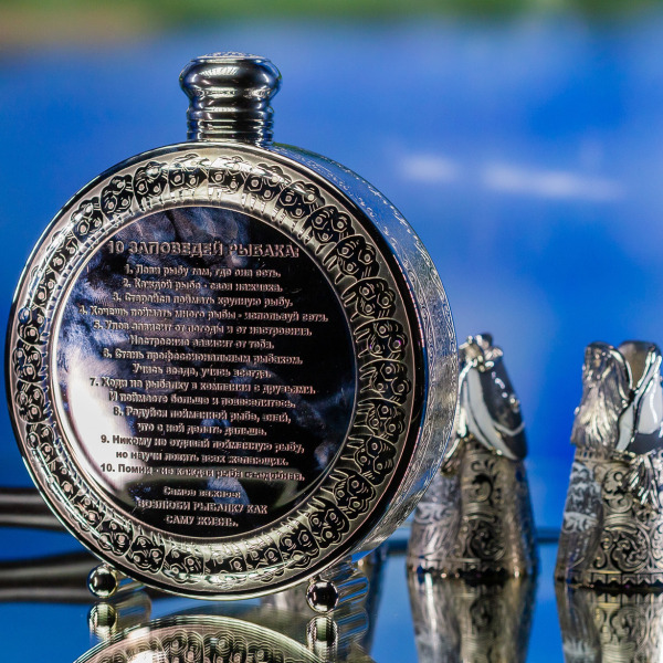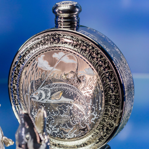 Фляга, украшенная сложной гравировкой с изображением рыбака в момент его триумфа, является не только полезным предметом, но и символом рыбацкого успеха. Обратите внимание на великолепные детали — каждая линия передаёт динамику движения воды, всплеск, создаваемый рыбой, вылетевшей на поверхность... Это не просто сцена, а живая картина, рассказывающая свою историю.