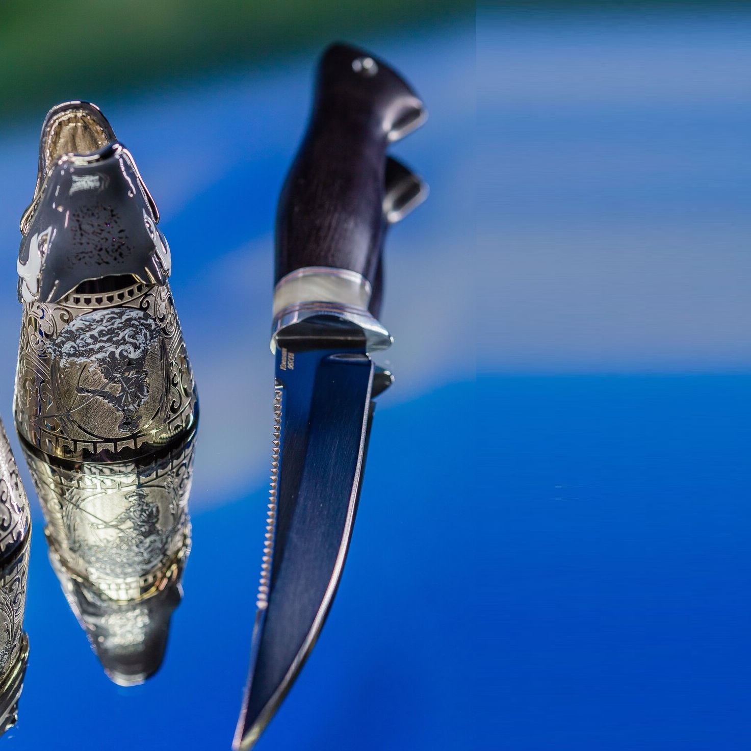 Размер: длина ножа — 175 мм, высота стопки — 85 мм, высота фляги — 185 мм.
