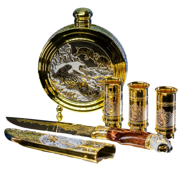 Набор охотничий "Медведь" с ножом, на 3 персоны, ЗлатоустНабор охотничий "Медведь" с ножом, на 3 персоны, ЗлатоустЭксклюзивные охотничьи наборы выполнены в технике Златоуста - национального художественного промысла. Ножи, стопки и принадлежности для охоты, покрытые платиной, золотом, серебром и никелем, украшены гравюрами Златоустовских мастеров. После того, как на полированную поверхность наносится изящный рисунок, изделие сушится в печи и подвергается травлению, после которого узор становится рельефным. Секреты и тонкости этого искусства передаются из поколения в поколение, поэтому уникальные художественные изделия неповторимы. Охотничьи наборы можно украсить дарственной надписью с самыми лучшими пожеланиями виновнику торжества.