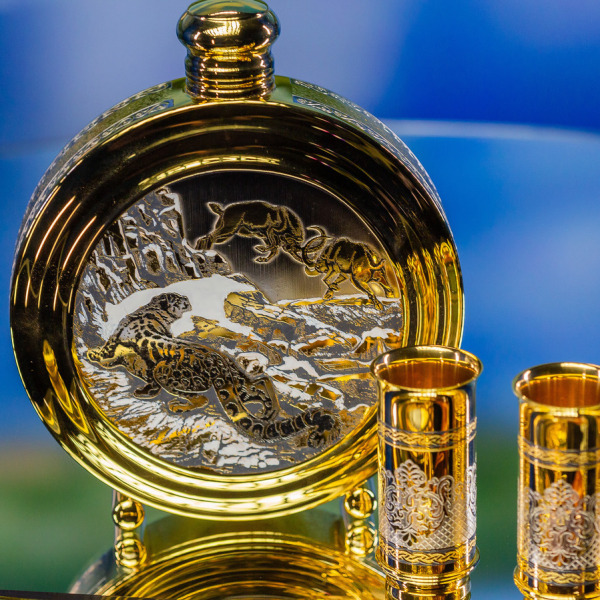 Каждый элемент комплекта несет в себе уникальную историю. Фляга, украшена сценой охоты, в которой могучая рысь, скрываясь в горах, готовится к броску на добычу — словно сама природа затаила дыхание перед этим моментом. Детали рельефной гравировки выполнены с исключительным мастерством: каждая линия и штрих подчеркивают драматичность момента и силу хищника. Позолота добавляет ей блеска и роскоши, делая композицию по-настоящему величественной.