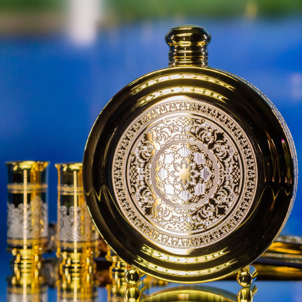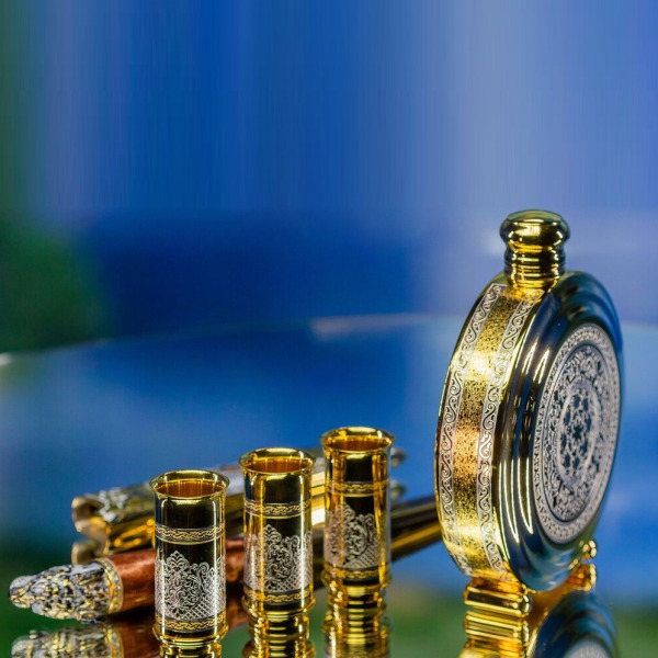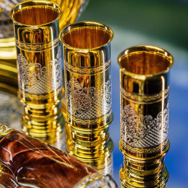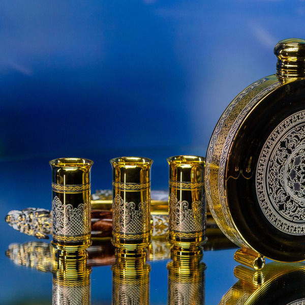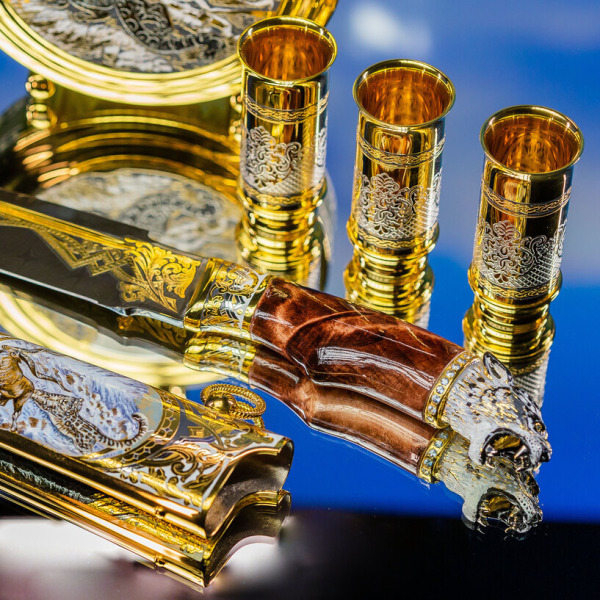 Три рюмки, инкрустированные сложными узорами и позолотой, символизируют трёх охотников, готовых разделить моменты триумфа после удачной охоты. Каждый узор на них – это аллегория силы и решительности, которой наделен владелец этого набора.