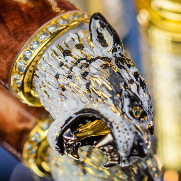 Нож, сделанный из дамасской стали, с рукоятью из драгоценного дерева, украшенной головой рыси, воплощает опасность и хищную грацию. Голова рыси, инкрустированная фианитами, словно живет своей жизнью — она полностью готова к прыжку. Дамасская сталь клинка – это символ непоколебимой твердости, которой не уступают даже самые суровые природные стихии.