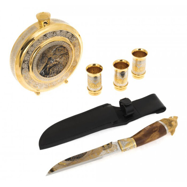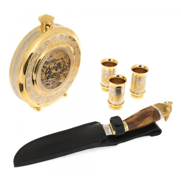 Эксклюзивные охотничьи наборы выполнены в технике Златоуста - национального художественного промысла. Ножи, стопки и принадлежности для охоты, покрытые платиной, золотом, серебром и никелем, украшены гравюрами Златоустовских мастеров. После того, как на полированную поверхность наносится изящный рисунок, изделие сушится в печи и подвергается травлению, после которого узор становится рельефным. Секреты и тонкости этого искусства передаются из поколения в поколение, поэтому уникальные художественные изделия неповторимы. Охотничьи наборы можно украсить дарственной надписью с самыми лучшими пожеланиями виновнику торжества.