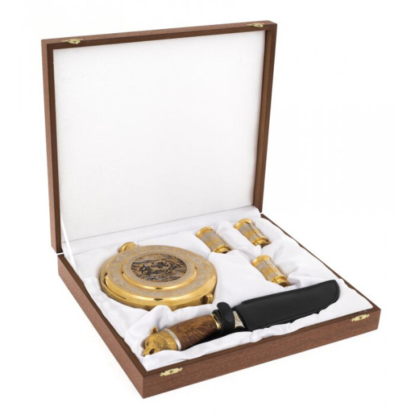 Набор охотничий "Медведь" с ножом, на 3 персоны, ЗлатоустНабор охотничий "Медведь" с ножом, на 3 персоны, ЗлатоустЭксклюзивные охотничьи наборы выполнены в технике Златоуста - национального художественного промысла. Ножи, стопки и принадлежности для охоты, покрытые платиной, золотом, серебром и никелем, украшены гравюрами Златоустовских мастеров. После того, как на полированную поверхность наносится изящный рисунок, изделие сушится в печи и подвергается травлению, после которого узор становится рельефным. Секреты и тонкости этого искусства передаются из поколения в поколение, поэтому уникальные художественные изделия неповторимы. Охотничьи наборы можно украсить дарственной надписью с самыми лучшими пожеланиями виновнику торжества.
