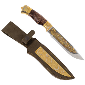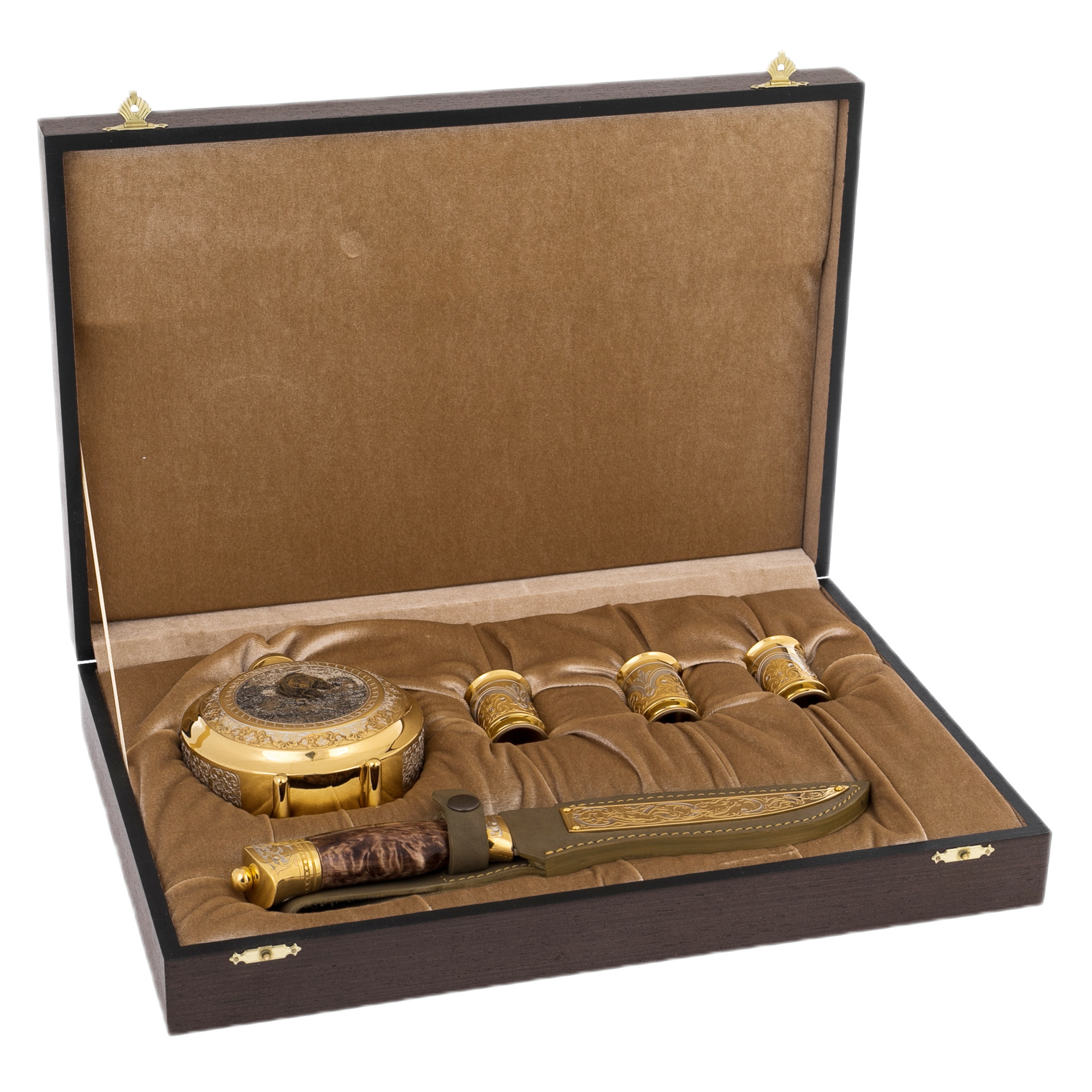 Эксклюзивные охотничьи наборы выполнены в технике Златоуста - национального художественного промысла. Ножи, стопки и принадлежности для охоты, покрытые платиной, золотом, серебром и никелем, украшены гравюрами Златоустовских мастеров. После того, как на полированную поверхность наносится изящный рисунок, изделие сушится в печи и подвергается травлению, после которого узор становится рельефным. Секреты и тонкости этого искусства передаются из поколения в поколение, поэтому уникальные художественные изделия неповторимы. Охотничьи наборы можно украсить дарственной надписью с самыми лучшими пожеланиями виновнику торжества.