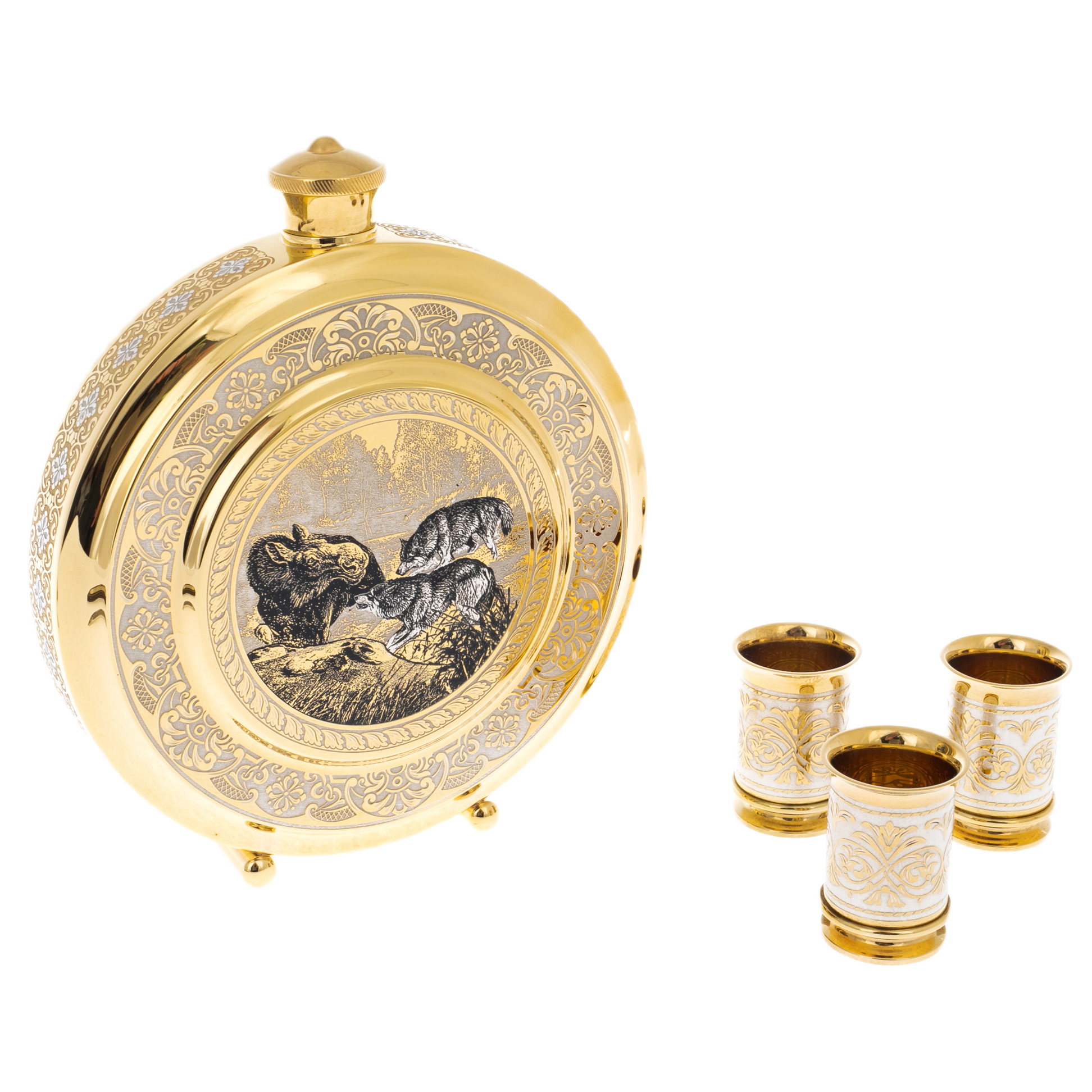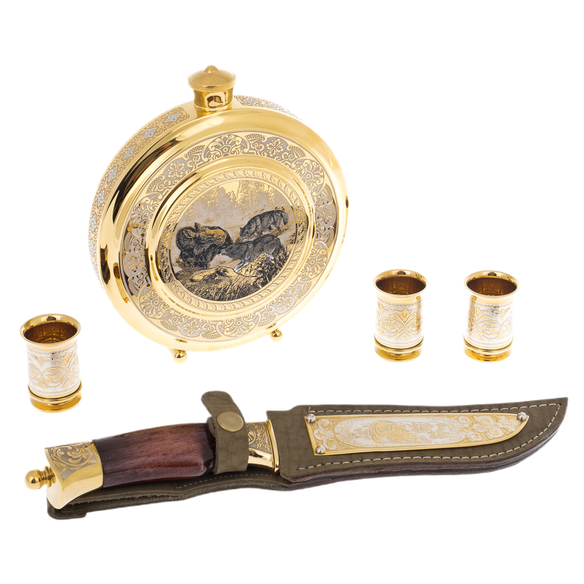 Комплектация: нож охотничий, рюмки — 3 шт., фляжка.