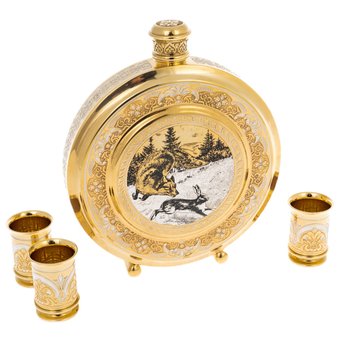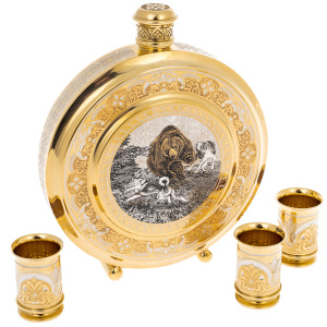 Набор охотничий "Медведь" с ножом, на 3 персоны, ЗлатоустНабор охотничий "Медведь" с ножом, на 3 персоны, ЗлатоустЭксклюзивные охотничьи наборы выполнены в технике Златоуста - национального художественного промысла. Ножи, стопки и принадлежности для охоты, покрытые платиной, золотом, серебром и никелем, украшены гравюрами Златоустовских мастеров. После того, как на полированную поверхность наносится изящный рисунок, изделие сушится в печи и подвергается травлению, после которого узор становится рельефным. Секреты и тонкости этого искусства передаются из поколения в поколение, поэтому уникальные художественные изделия неповторимы. Охотничьи наборы можно украсить дарственной надписью с самыми лучшими пожеланиями виновнику торжества.
