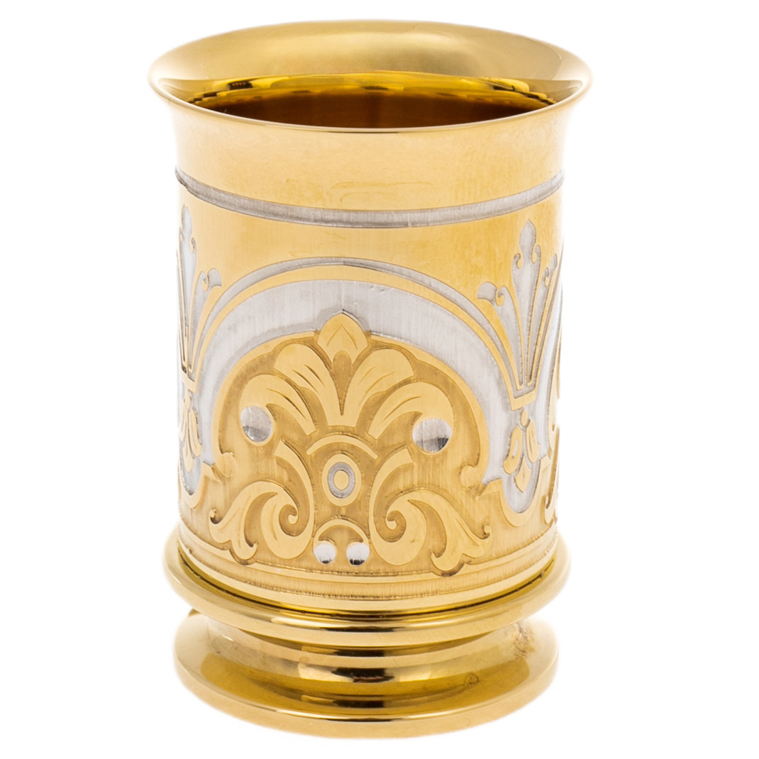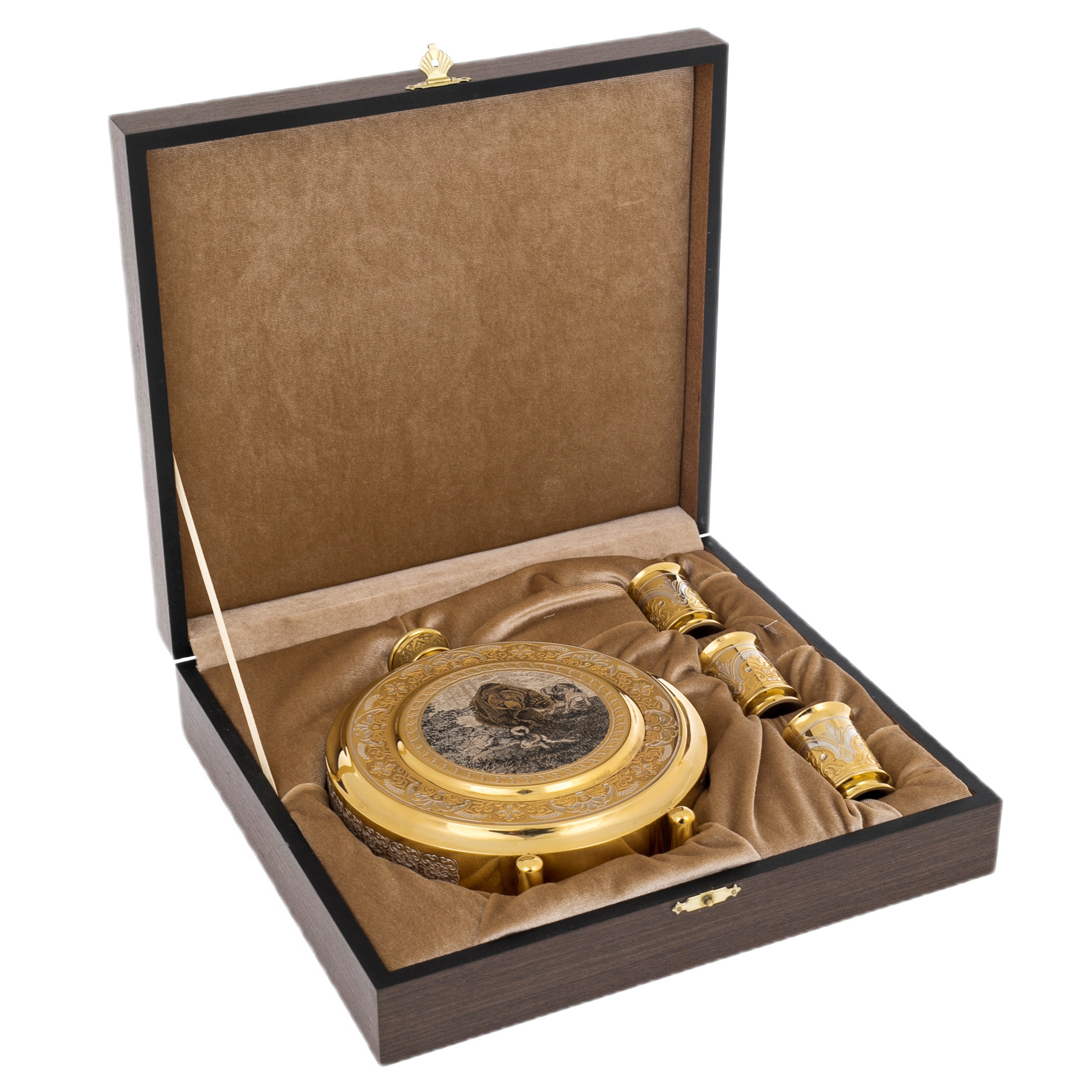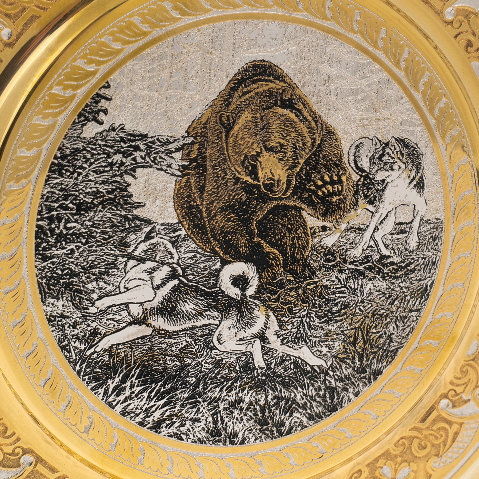Сюжет "Охоты медведя" — не про трофей, а про меру силы и самообладания: медведь в центре композиции воспринимается символом власти природы, проверкой характера, экзаменом на выдержку. Вариативность сцен, поддержанная вторым медальоном с динамикой погони, создаёт ощущение целой истории, заключённой в металл и золото, — истории о скорости решения и точности действия. Орнаментальная рамка, собранная из цветочных мотивов и тонких лент, связывает эту энергию с эстетикой парадных предметов: набор легко представить и на столе в охотничьем доме, и в кабинете, и в качестве безупречного корпоративного дара человеку, чьё "да" всегда весит больше обычного.