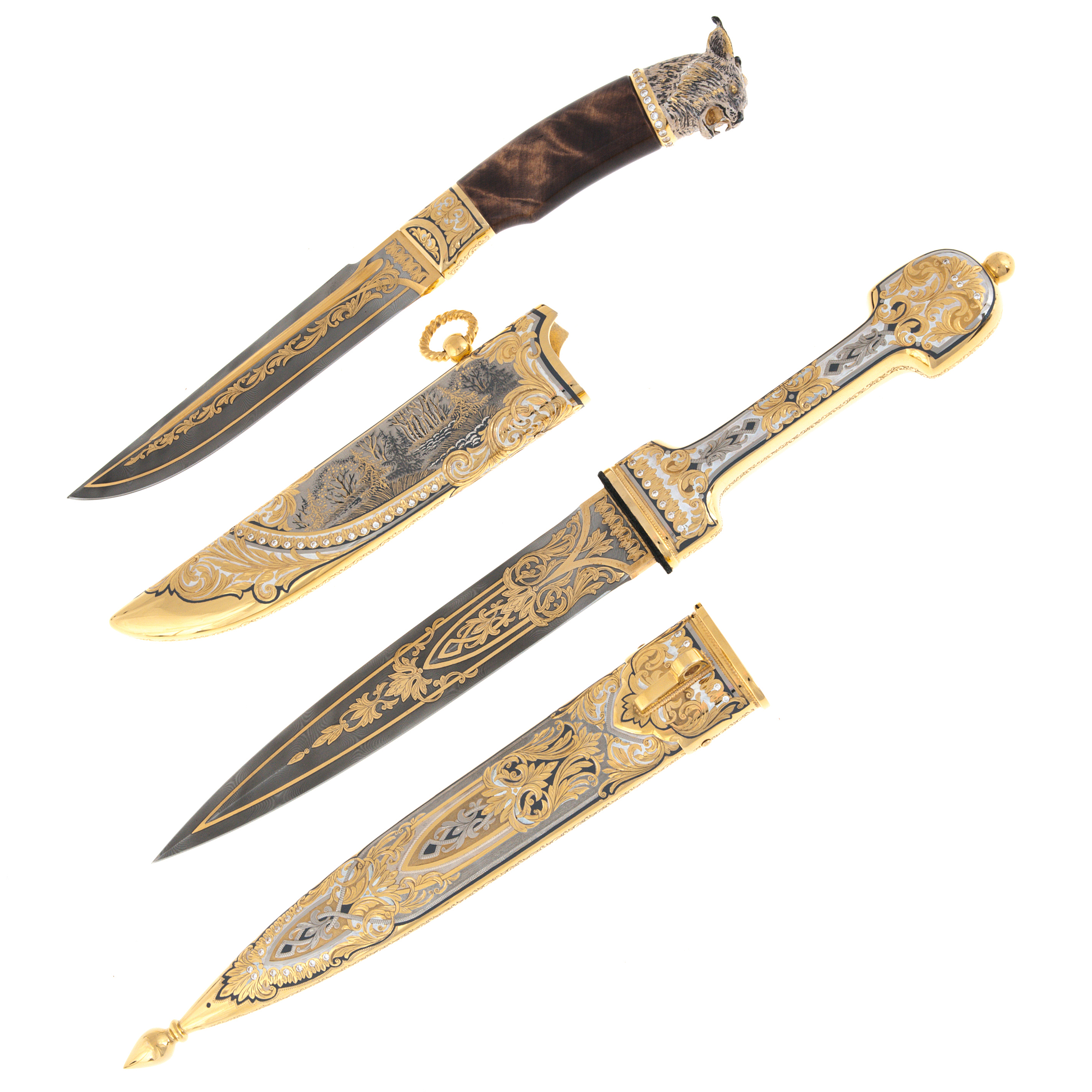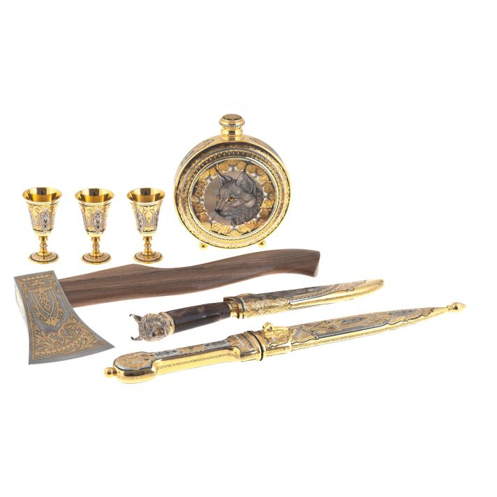 Эксклюзивные охотничьи наборы - нет лучше подарка для охотника! Изысканные аксессуары, декорированные в стиле Златоуста, можно брать на охоту, украсить ими кабинет или гостиную. Охотничьи принадлежности, покрытые серебром и золотом с живописными сценками из охотничьей жизни, пригодятся для приготовления еды у костра. В производстве аксессуаров для охоты и пикника использовались материалы самого высокого качества - латунь, никель, нержавеющая сталь, дерево и натуральная кожа. Охотничьи наборы можно украсить дарственной надписью с самыми лучшими пожеланиями виновнику торжества.