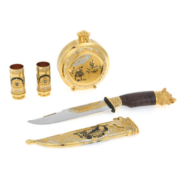 Эксклюзивные охотничьи наборы выполнены в технике Златоуста - национального художественного промысла. Ножи, стопки и принадлежности для охоты, покрытые платиной, золотом, серебром и никелем, украшены гравюрами Златоустовских мастеров. После того, как на полированную поверхность наносится изящный рисунок, изделие сушится в печи и подвергается травлению, после которого узор становится рельефным.