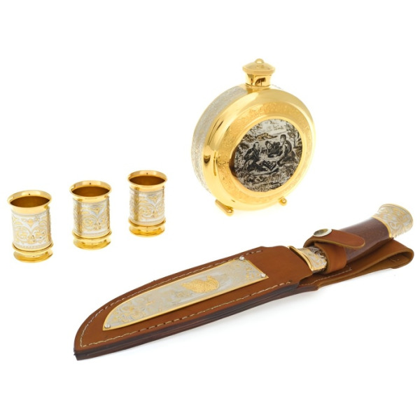 Охотничий набор "На привале" с ножом, на 3 персоны, ЗлатоустОхотничий набор "На привале" с ножом, на 3 персоны, ЗлатоустЭксклюзивные охотничьи наборы выполнены в технике Златоуста - национального художественного промысла. Ножи, стопки и принадлежности для охоты, покрытые платиной, золотом, серебром и никелем, украшены гравюрами Златоустовских мастеров. После того, как на полированную поверхность наносится изящный рисунок, изделие сушится в печи и подвергается травлению, после которого узор становится рельефным. Секреты и тонкости этого искусства передаются из поколения в поколение, поэтому уникальные художественные изделия неповторимы. Охотничьи наборы можно украсить дарственной надписью с самыми лучшими пожеланиями виновнику торжества.