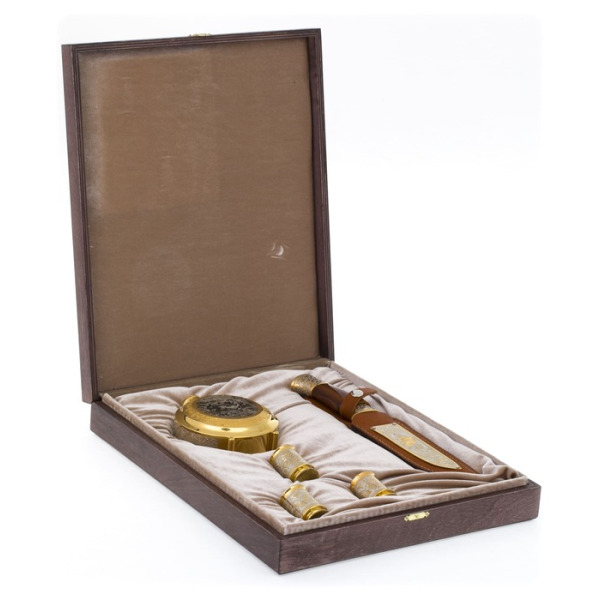 Секреты и тонкости этого искусства передаются из поколения в поколение, поэтому уникальные художественные изделия неповторимы. Охотничьи наборы можно украсить дарственной надписью с самыми лучшими пожеланиями виновнику торжества.